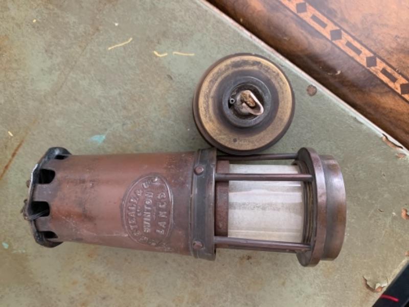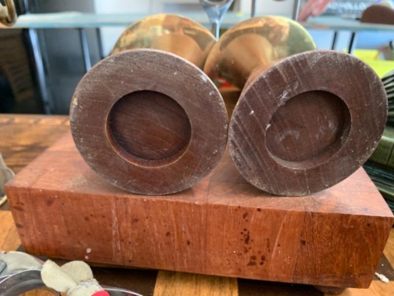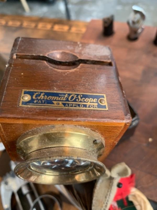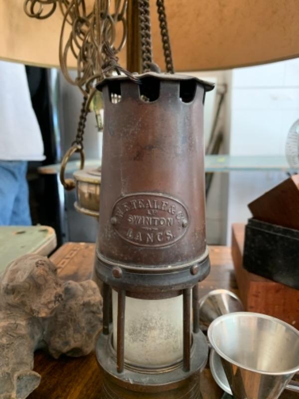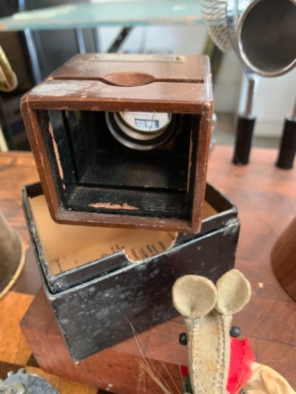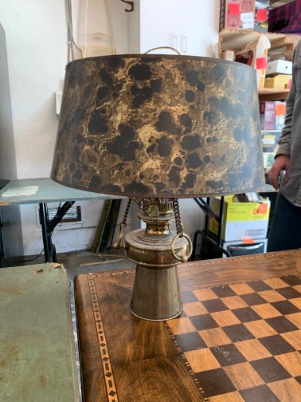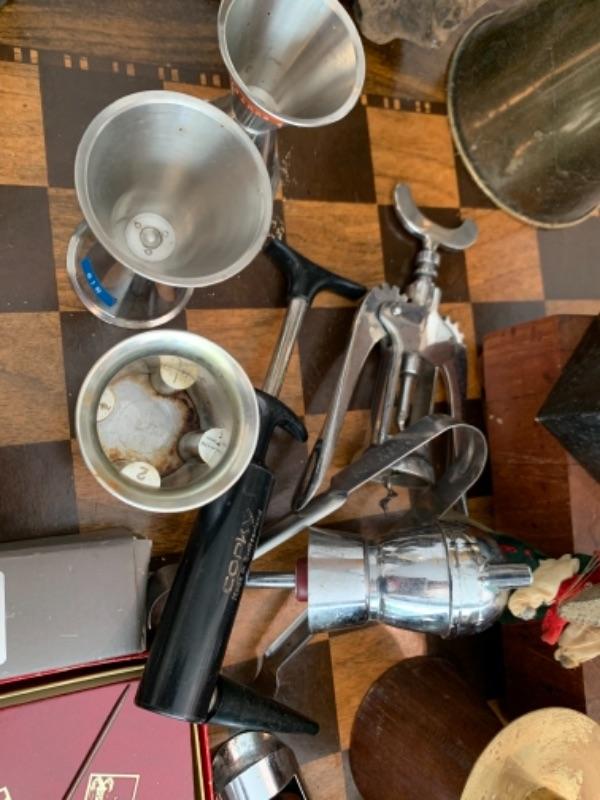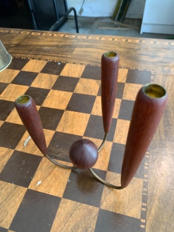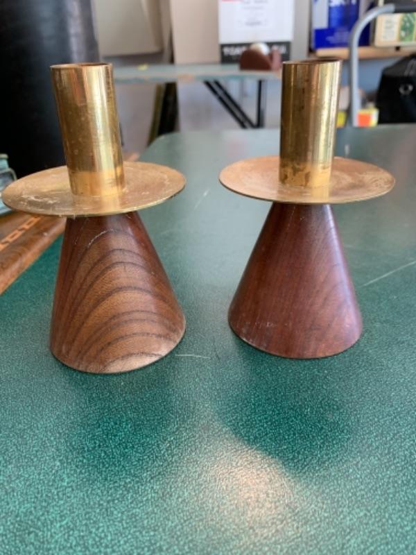 Lot 121. Lamp with Aramis-style shade, barware, vintage owl bookends, ice bucket, Scrabble game, cheese board, slide viewer, ashtrays, small propane copper lantern, bank money bags and very collectible mid-century candlesticks--$395