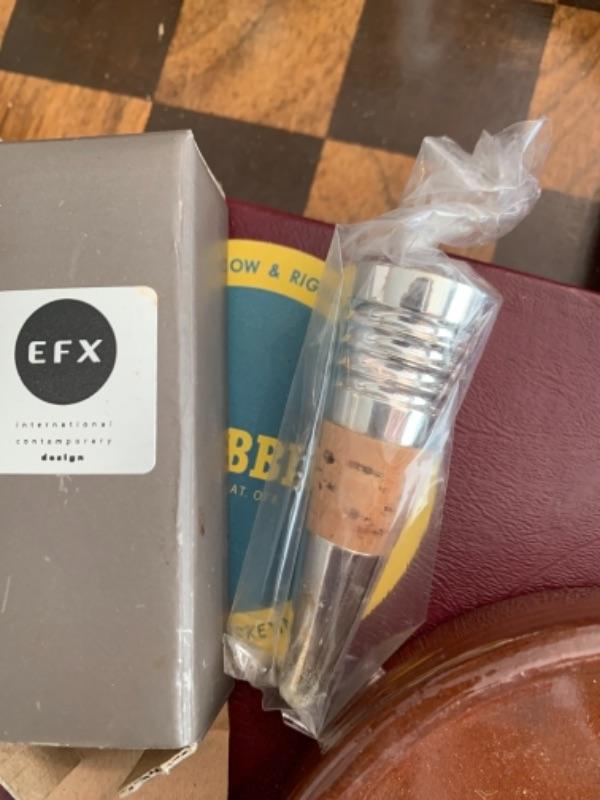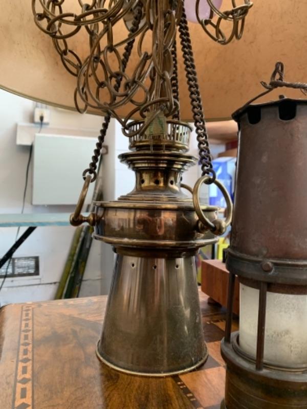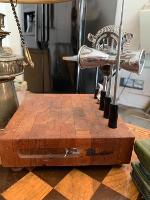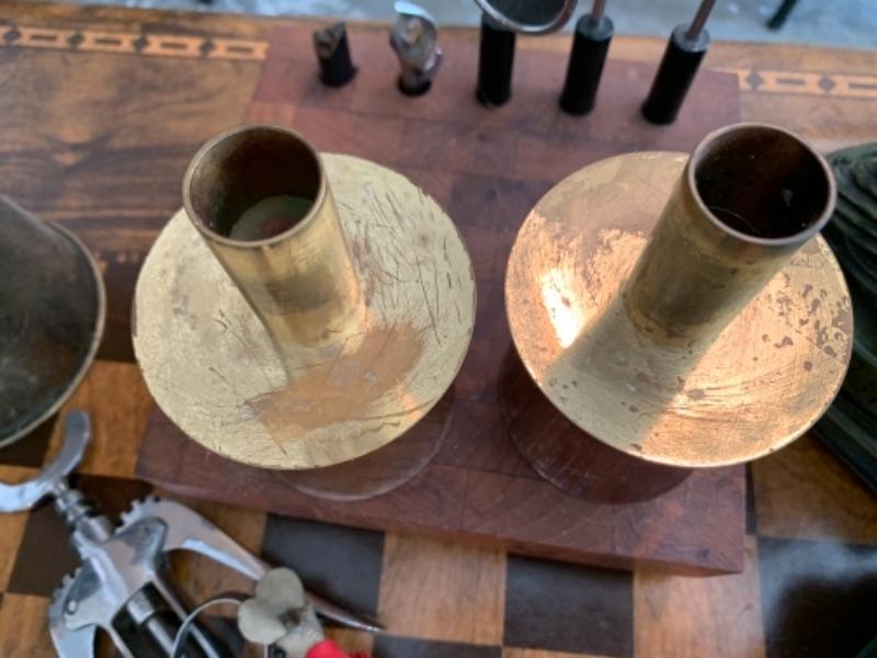 Lot 121. Lamp with Aramis-style shade, barware, vintage owl bookends, ice bucket, Scrabble game, cheese board, slide viewer, ashtrays, small propane copper lantern, bank money bags and very collectible mid-century candlesticks-- Was $395 - Now $250