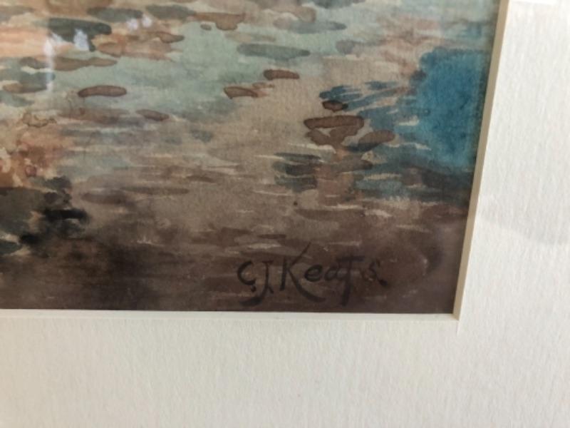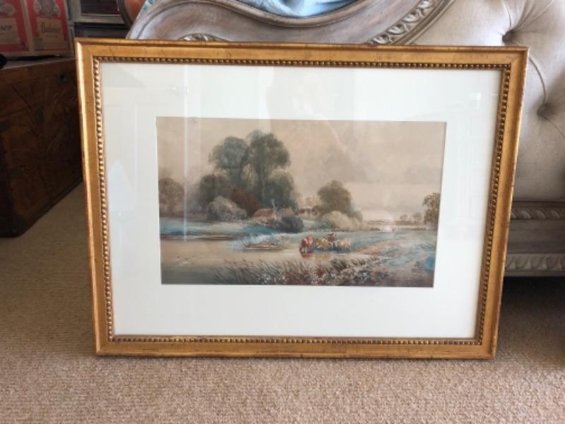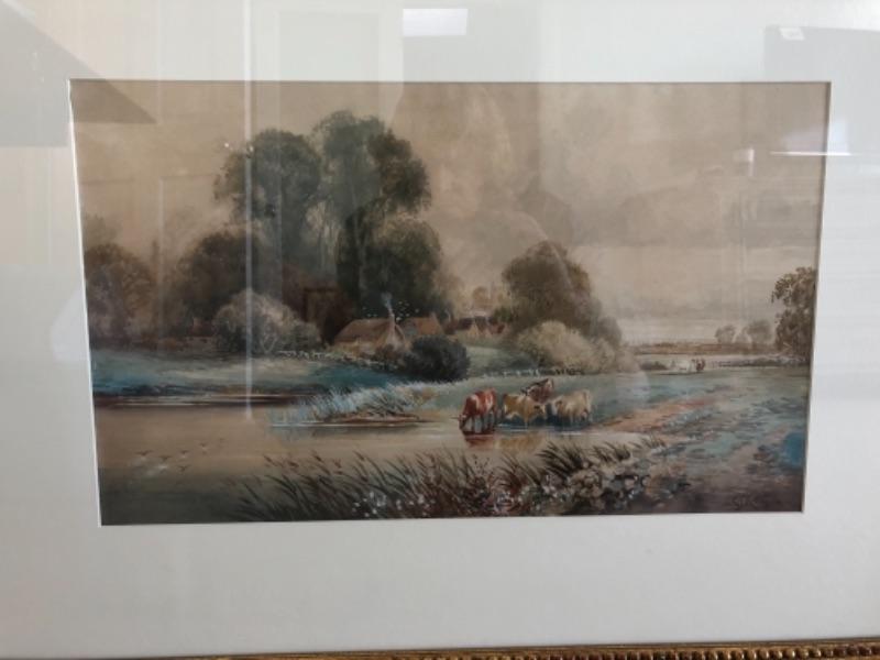 Lot 121U. Signed watercolor by A. V. Keats, 1981, restored, 29.5” x 22”, pastoral landscape of cows drinking at river--$65
