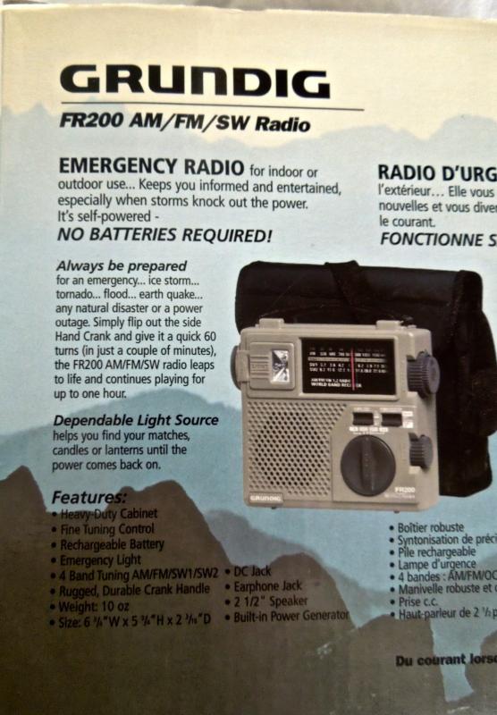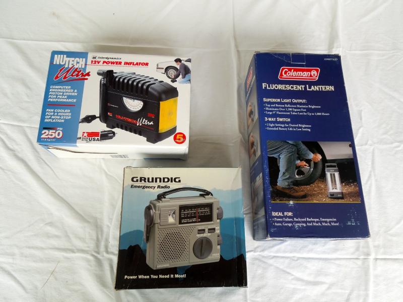 All are used. Coleman flourescent lanter needs battereies, NuTech 12V power inflater and Grundig emergency crank up am/fm/sw radio with case.