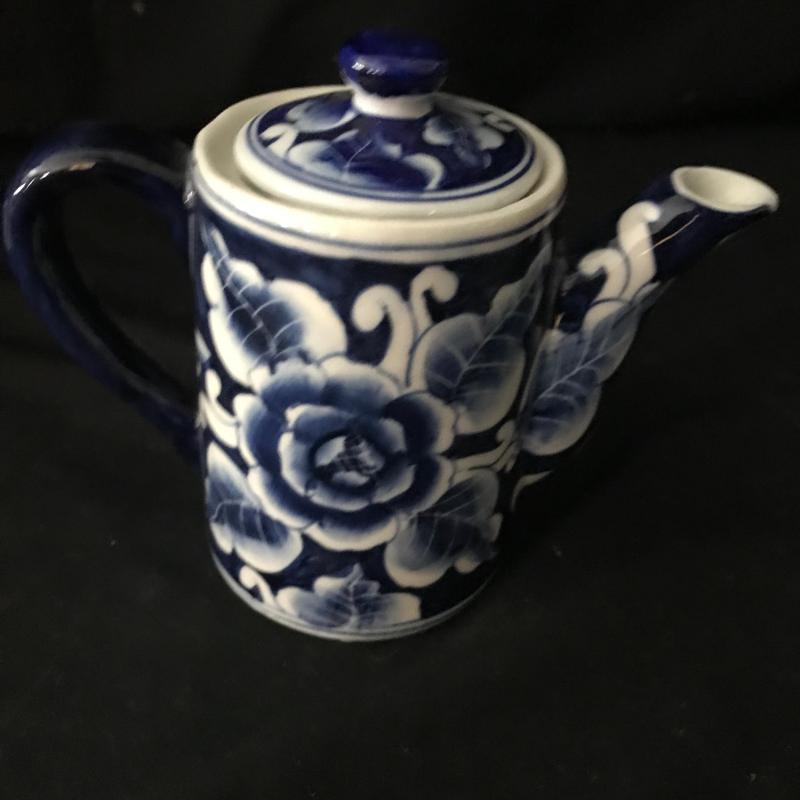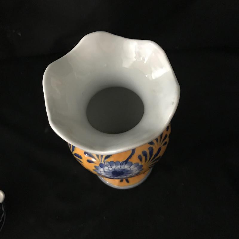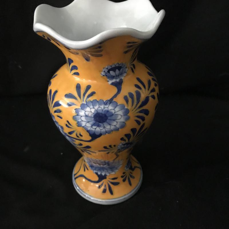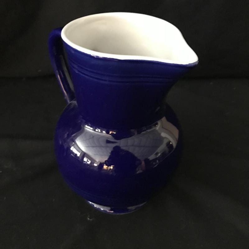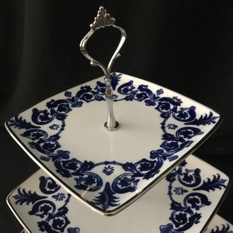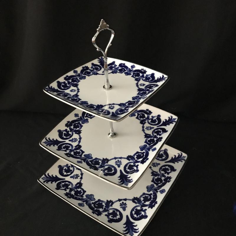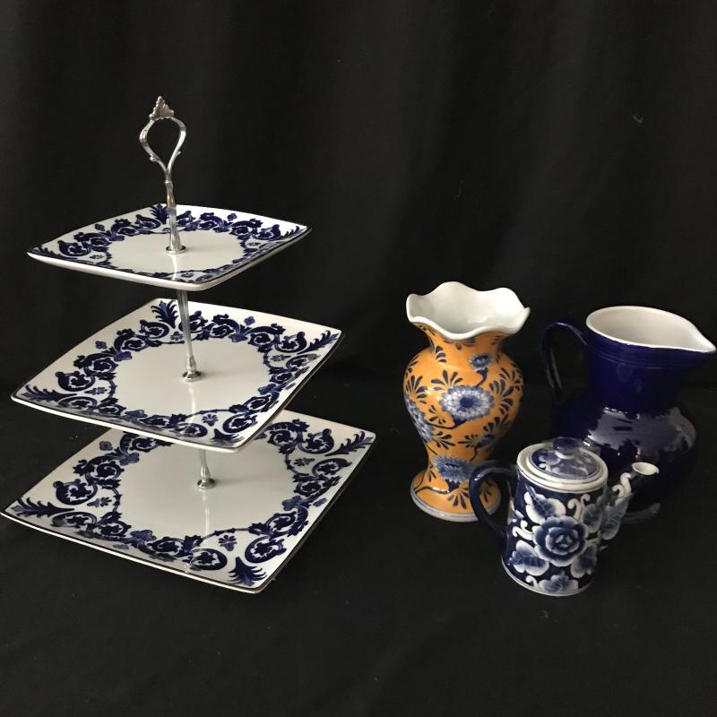 Bombay 3-tier plate stand in blue and white with silver rim accent, small blue and white pitcher, pretty French Emily Henry Pottery pitcher and a yellow and blue vase. Lot is available for local pick up in Maggie Valley, NC only.