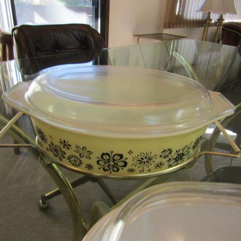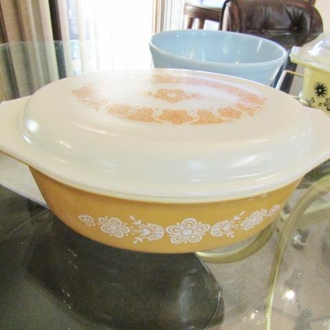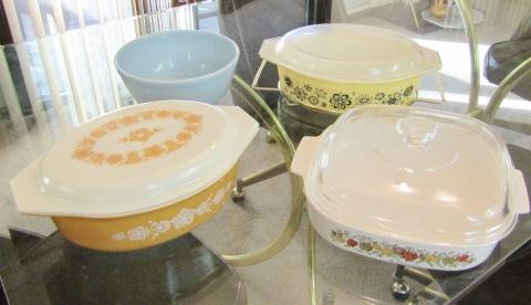1 PYREX BOWL AND 3 VINTAGE CORNING WARE DISHES