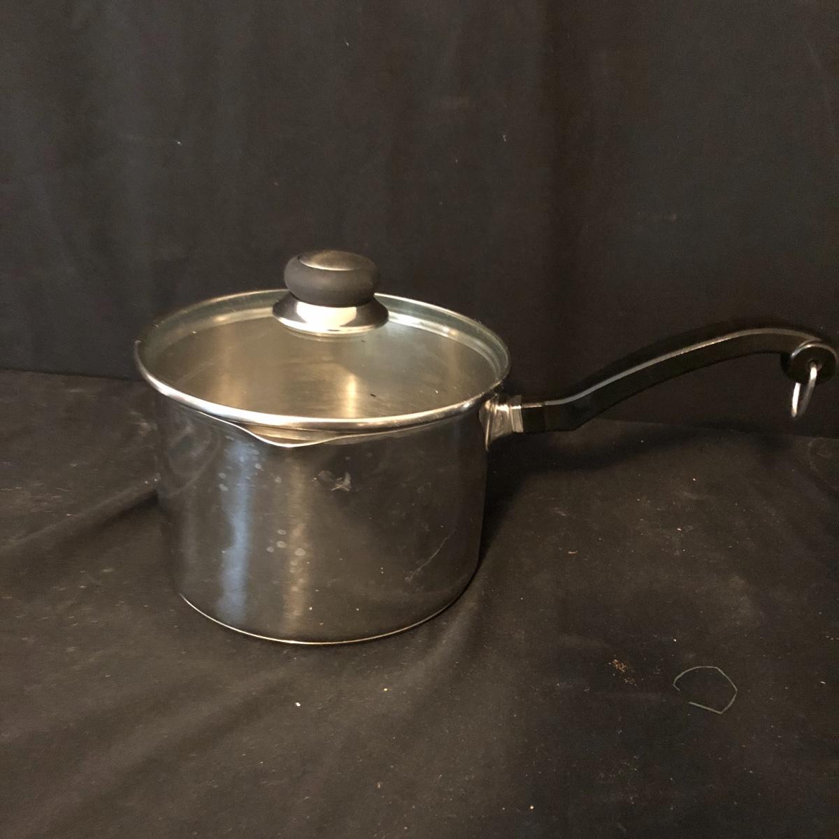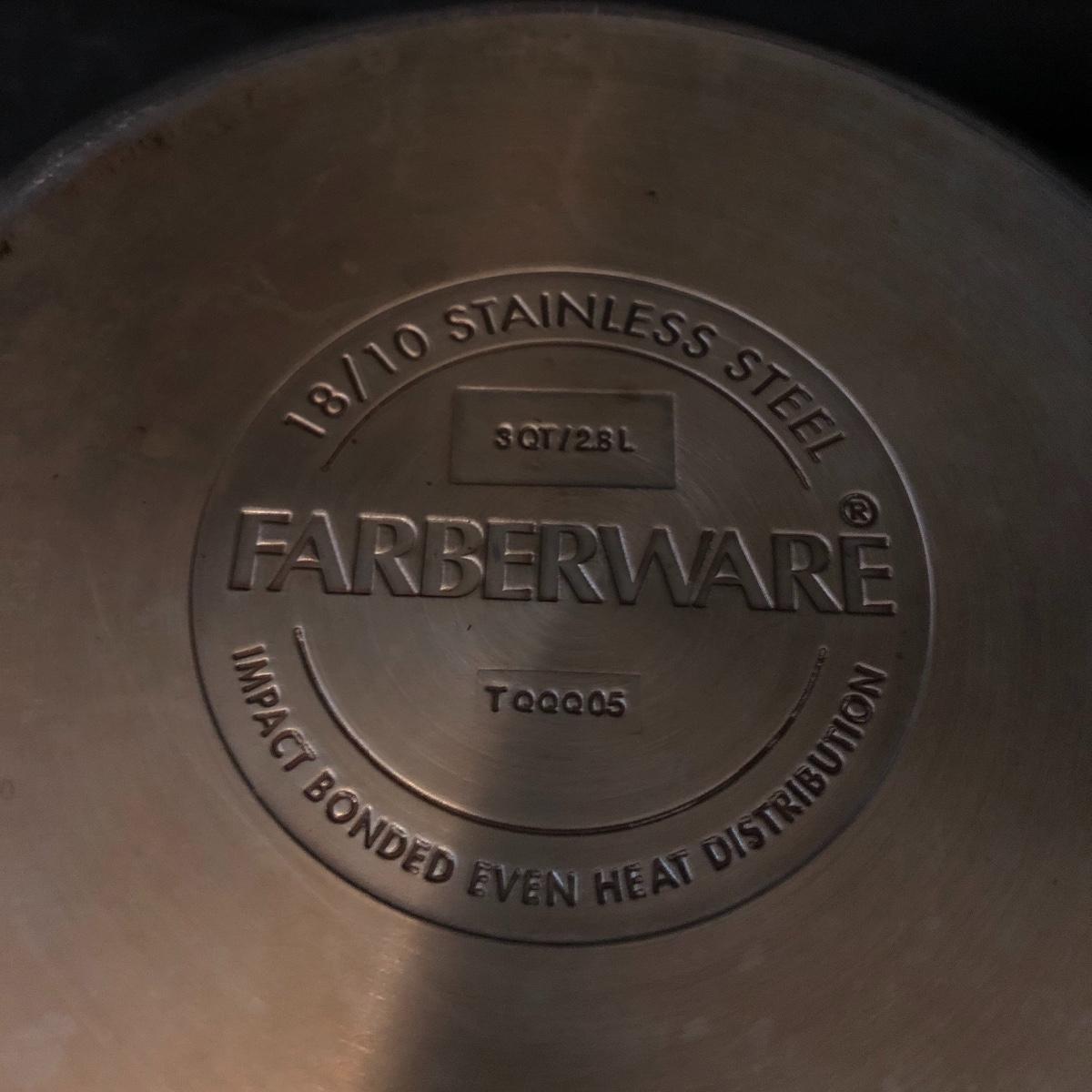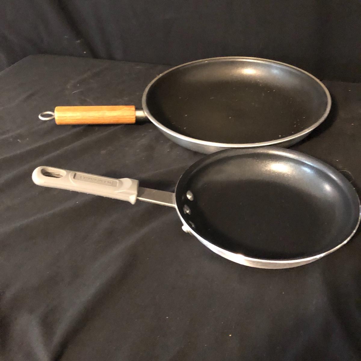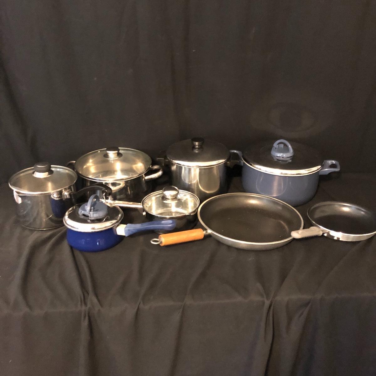 A great starter kit for the college student. Lot includes Tramontana and Mirro frying pans, Farberware pot with lid, Revere Ware pot with lid, T Fal pot with lid and more. Largest frying pan measures 12”D.