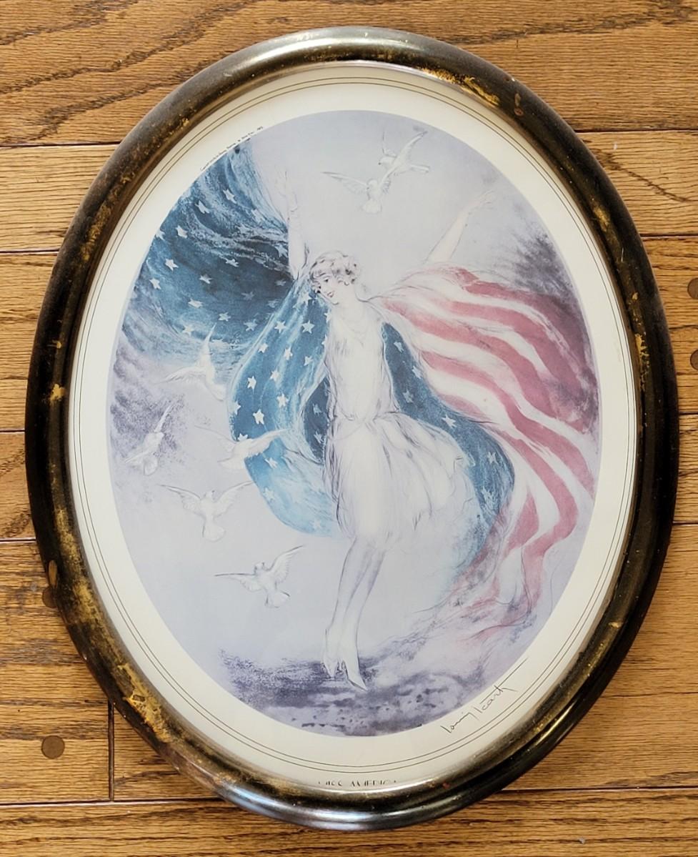 Louis Icart (French, 1888-1950). An etching of a woman draped with an American flag and surrounded by doves, highlighted with shades of red, white, and blue, executed in an art deco style, signed, inscribed Copyright 1927 by les Graveurs Modernes - 194 Rue de Rivoli - Paris.