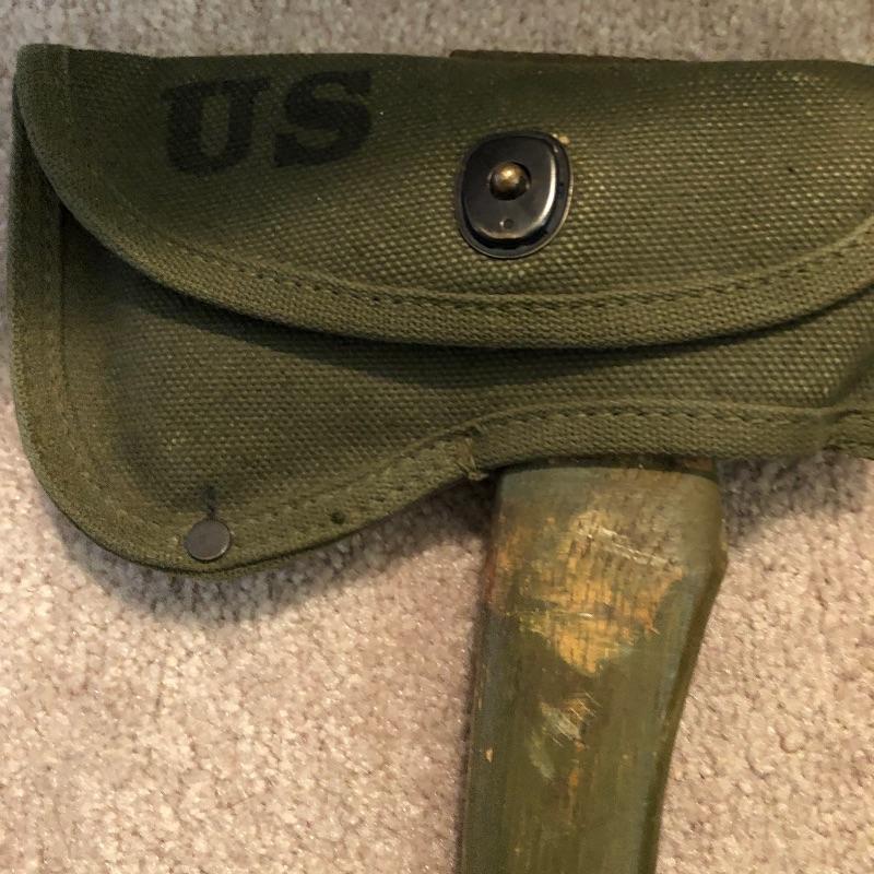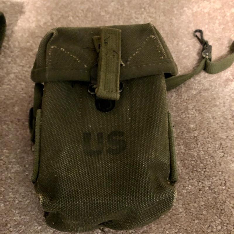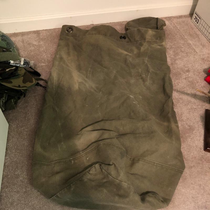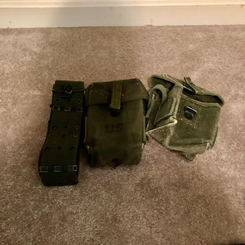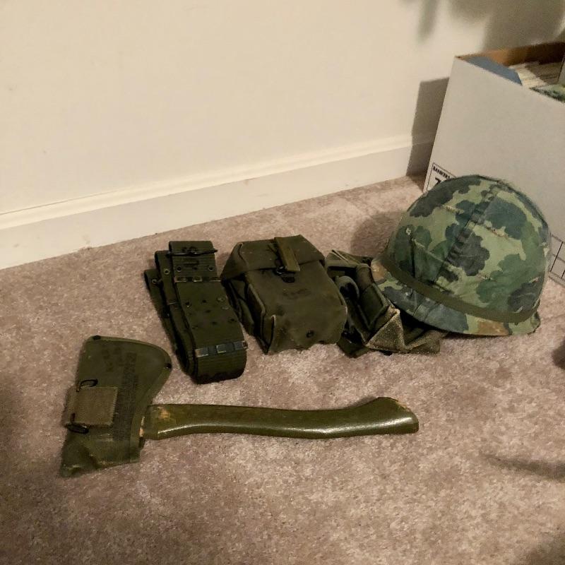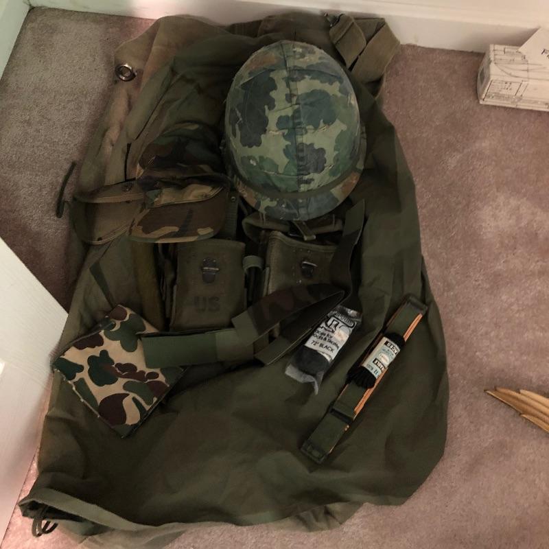 Authentic US Army kit that includes a helmet, hatchet, pouches, cap, handkerchief, laces and duffel bag with waterproof liner.