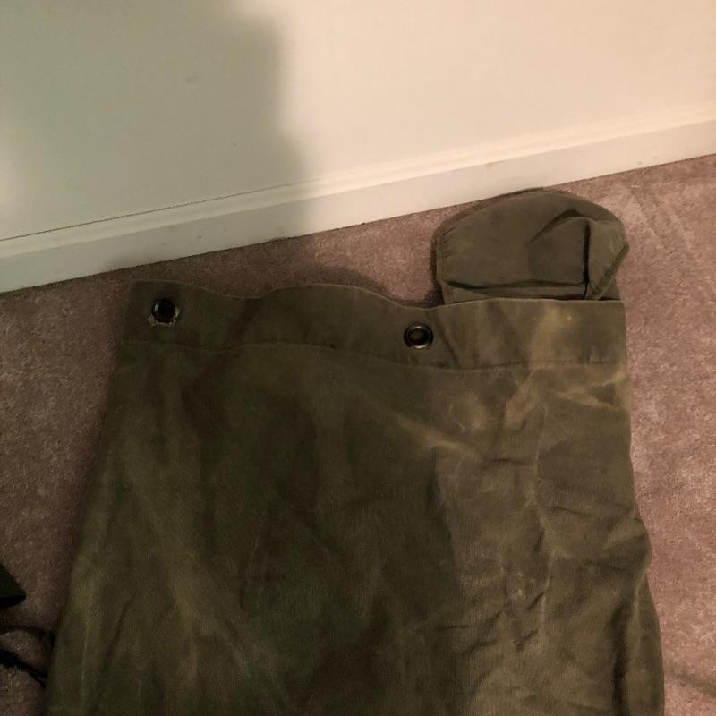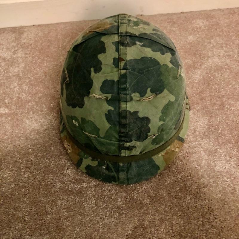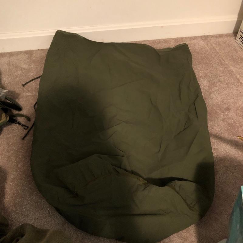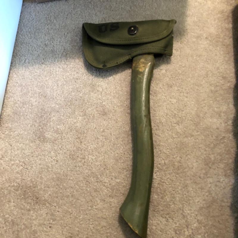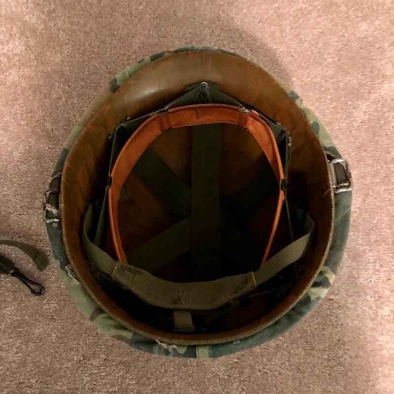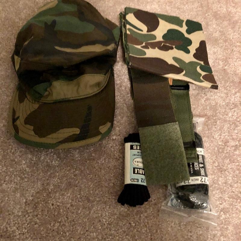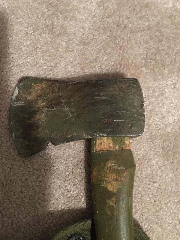 Authentic US Army kit that includes a helmet, hatchet, pouches, cap, handkerchief, laces and duffel bag with waterproof liner.