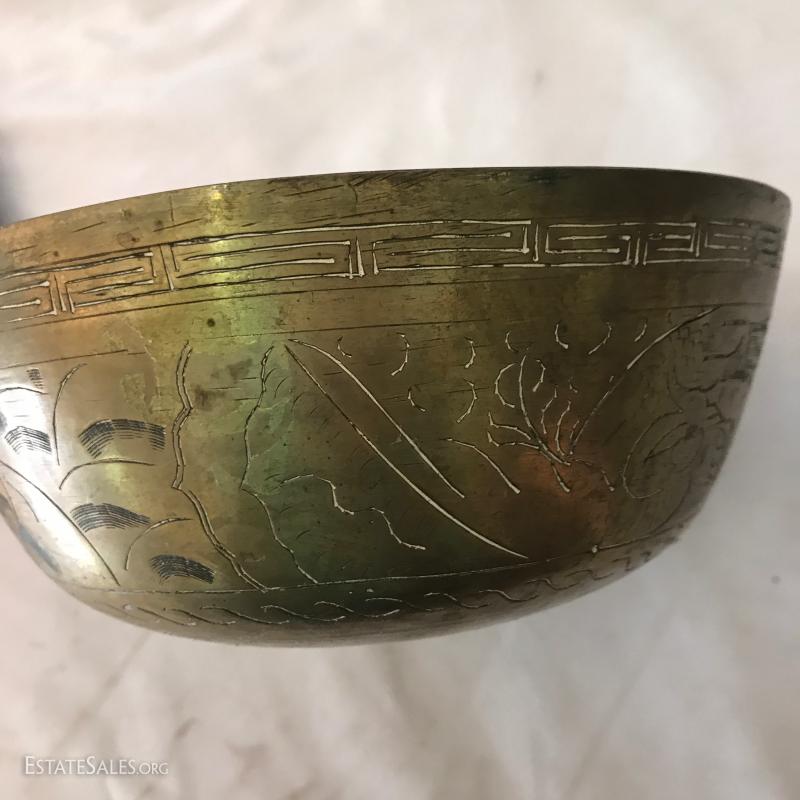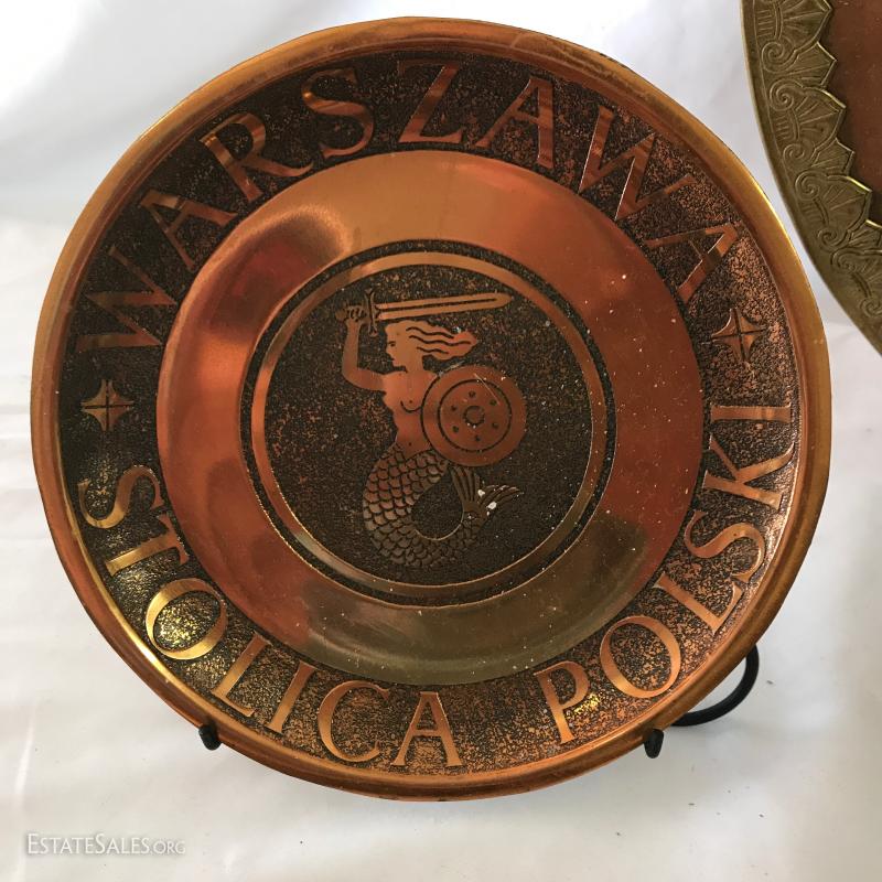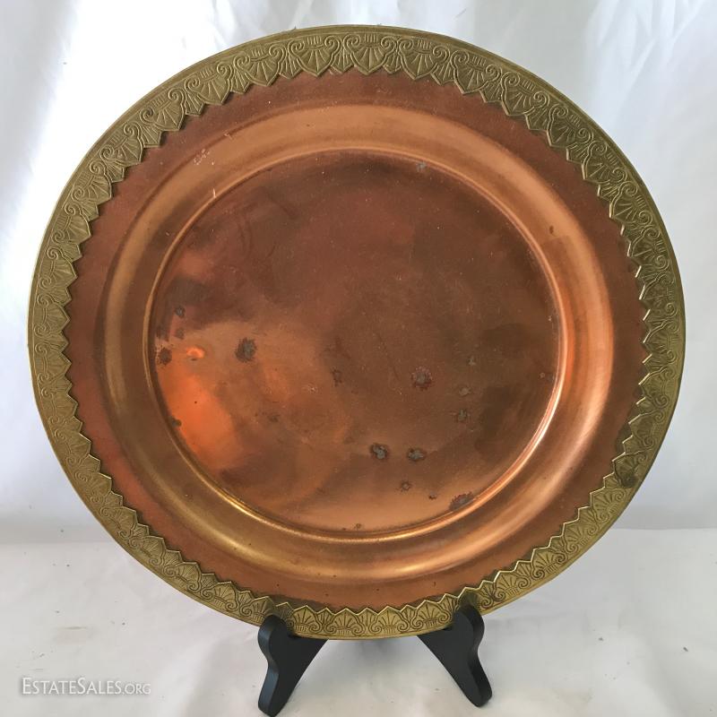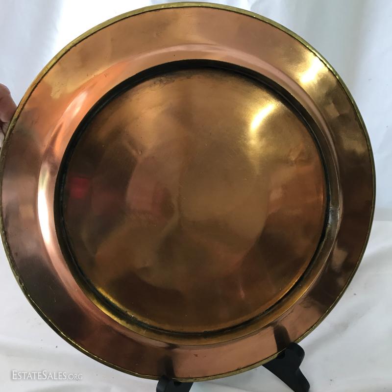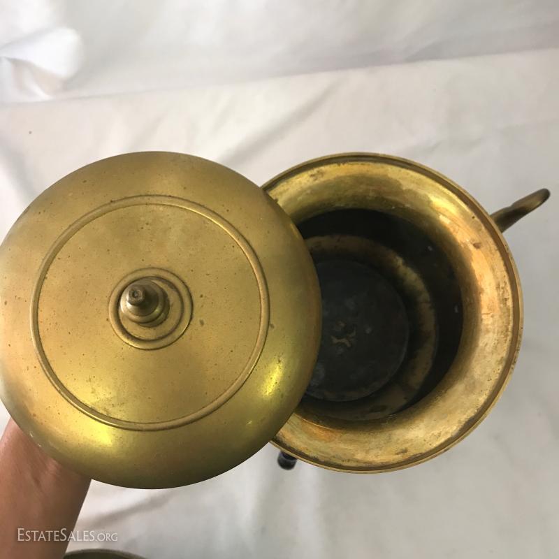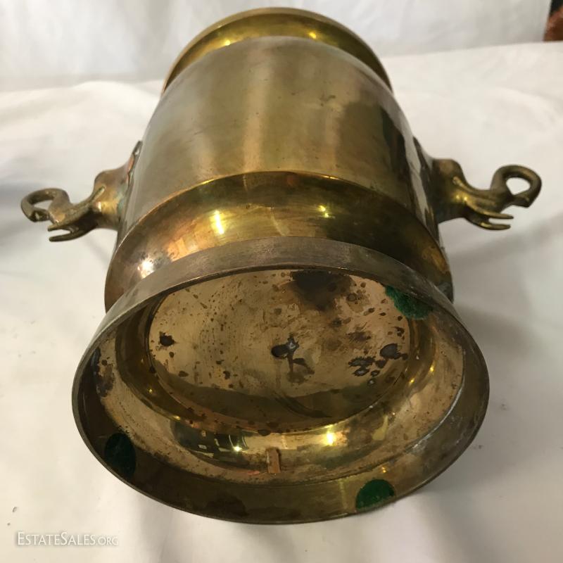 Heavy brass urn with elephant handles. Comes with stand. 11.5" tall, not on stand. Largest plate on stand in photo is 13.5" d. Smallest is 8"d. Selection of plates in various materials. Shipping available or local pick up in Waynesville, NC.