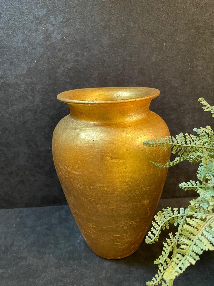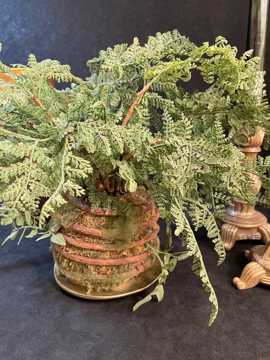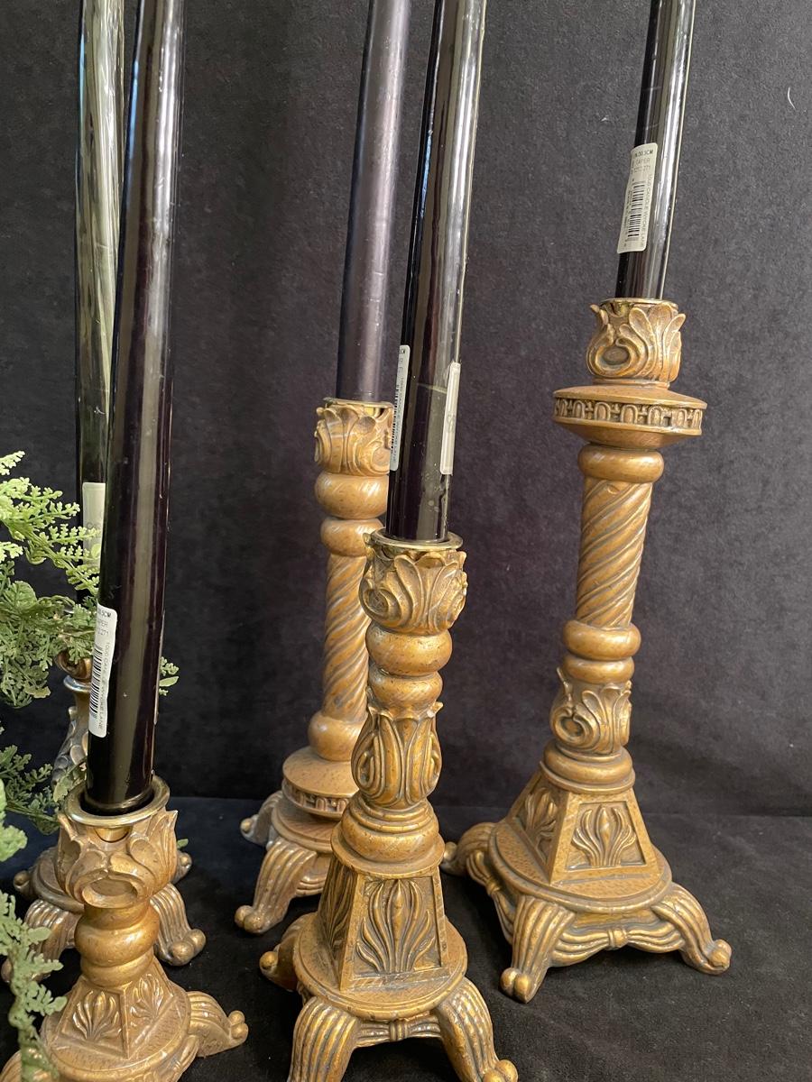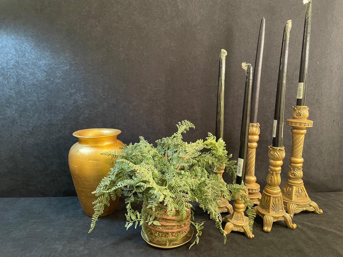 Set of 5 candlesticks in aged brass finish with a gold leaf vase and small silk arrangement