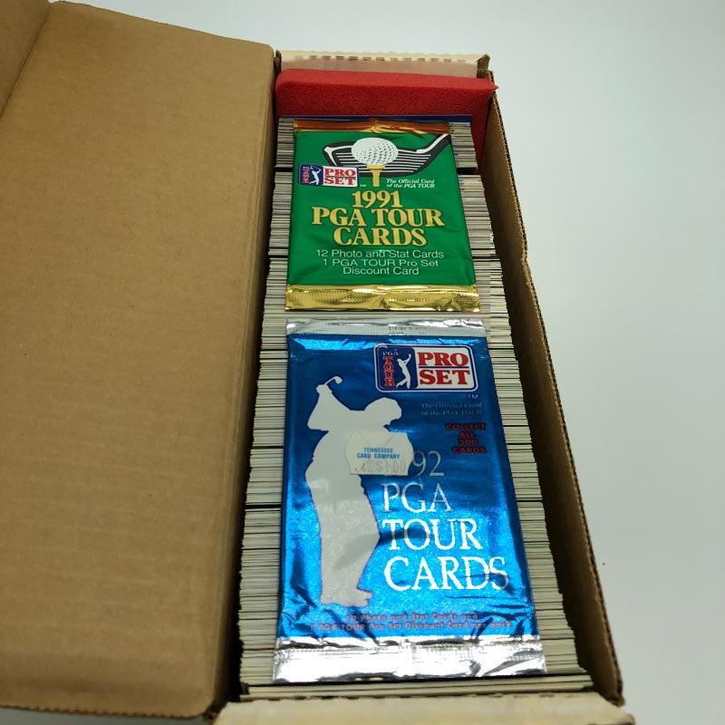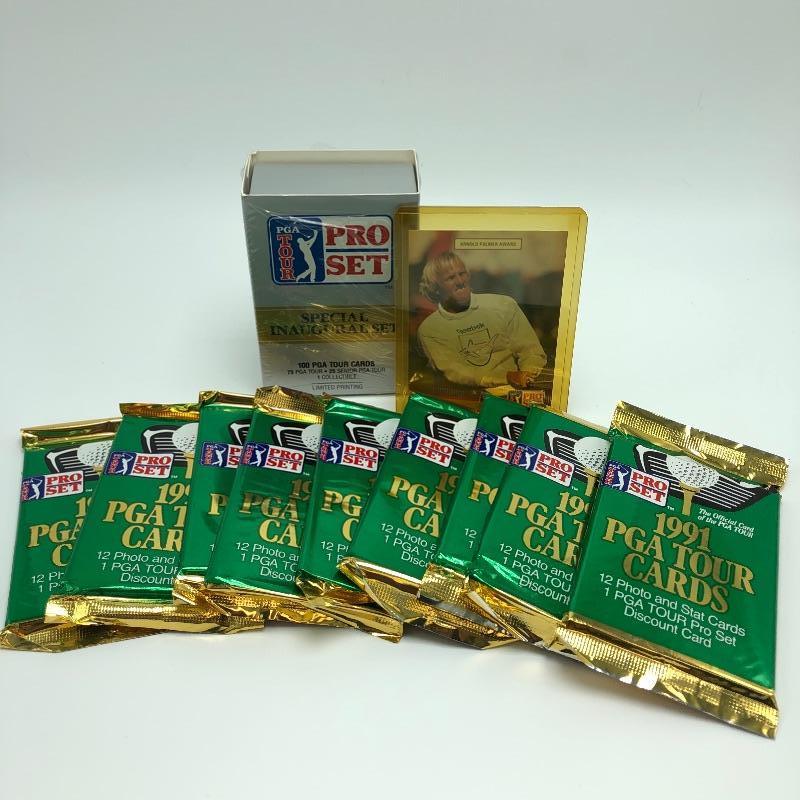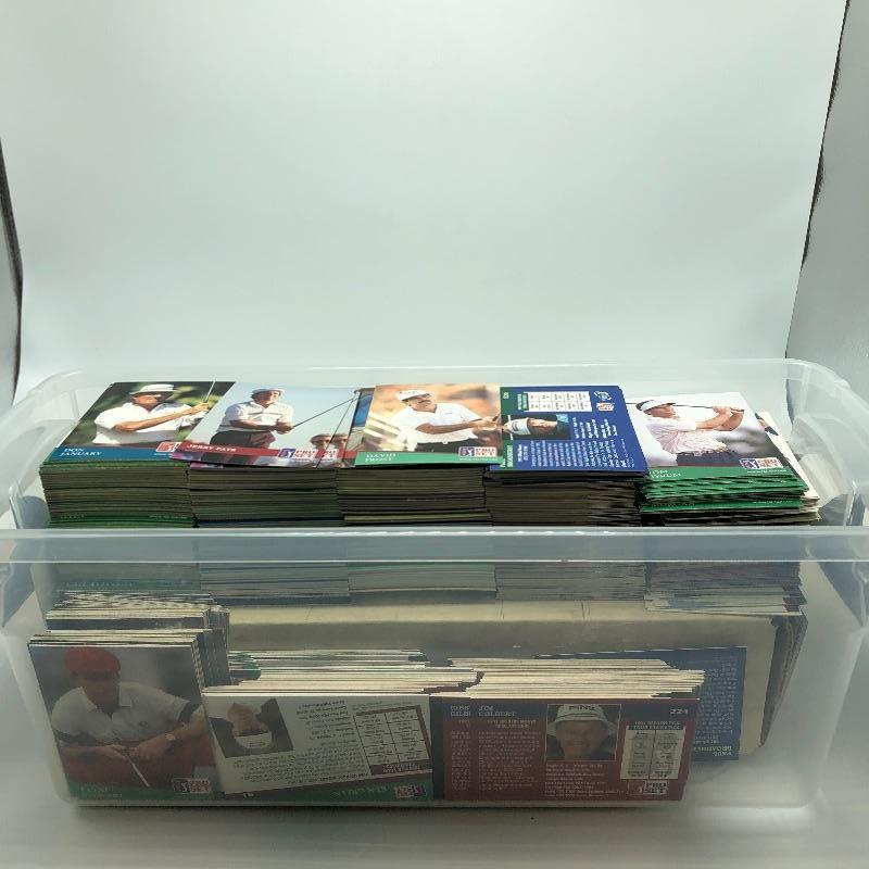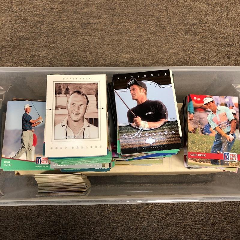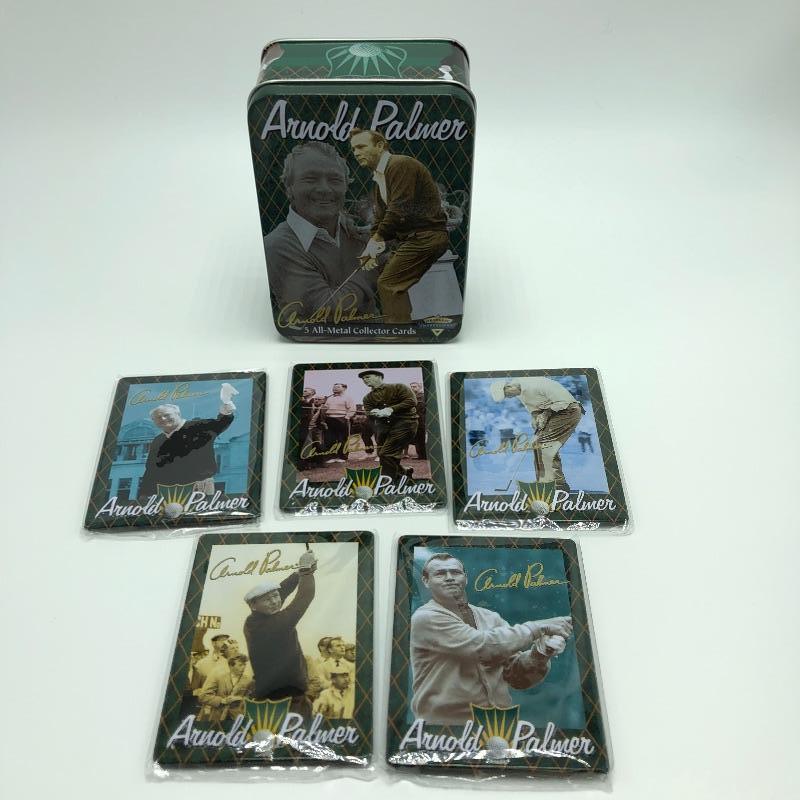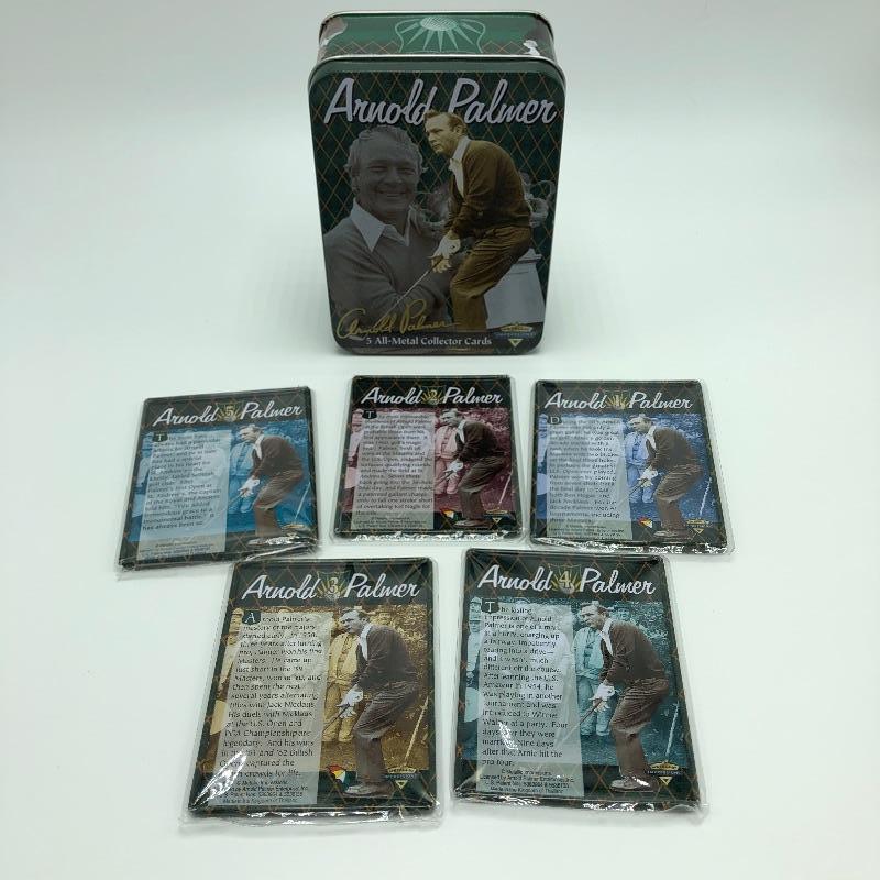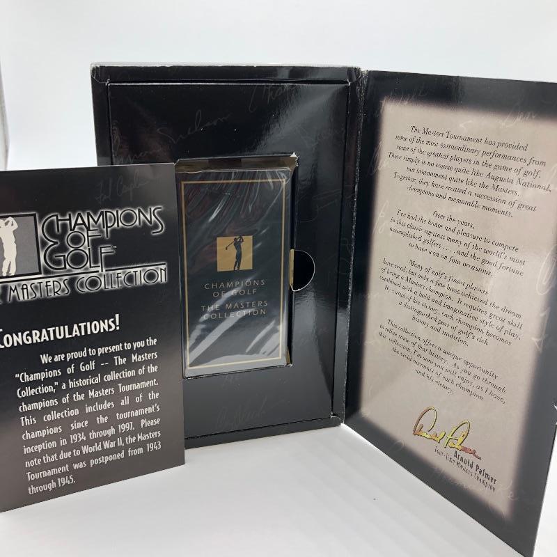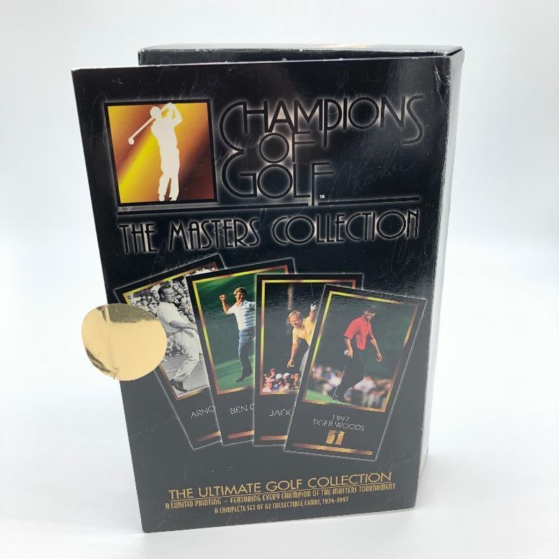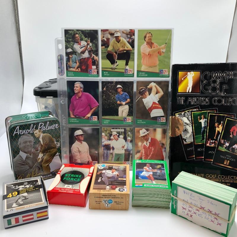 The ultimate golf collectible card collection! No really it says so right on the box. A limited printing featuring every champion of the masters tournament. A complete set of 62 collectible golf cards, 1934-1997. The cards are unopened and sealed. The Arnold Palmer collector tin with 5 all-metal collector cards is super unique and all individually wrapped and unopened. A PGA Tour Pro Set from 1991. Lot also includes a small sampling of tennis cards and two boxes of bowling cards. So many cool cards so little time.