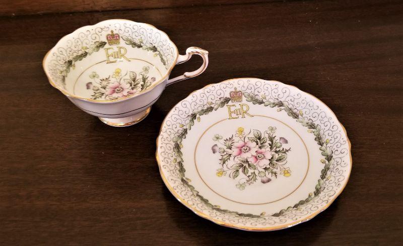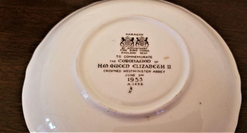 1953 (Elizabeth II) coronation piece - cup/saucer set - very pretty. Paragon China. Saucer 5.75" across. Good condition.