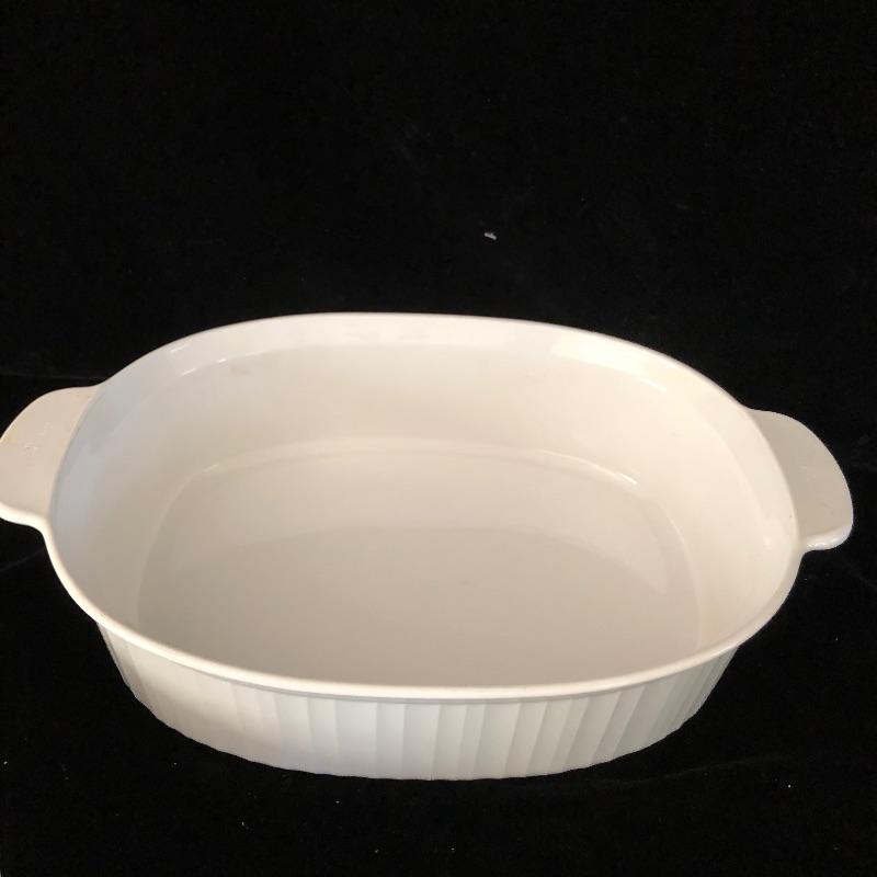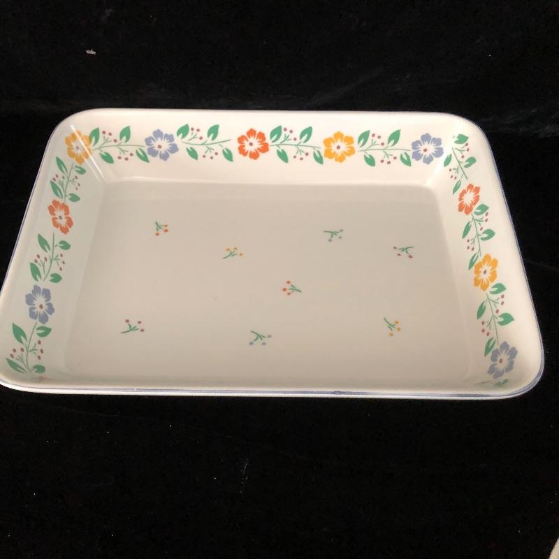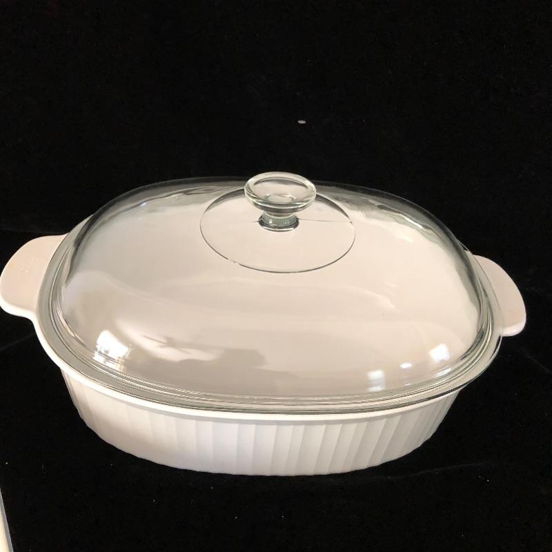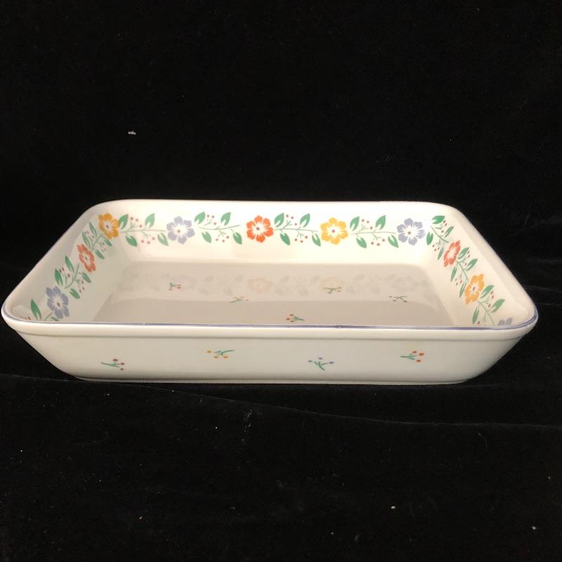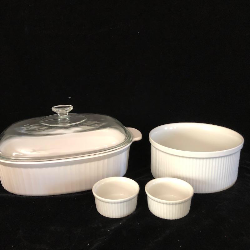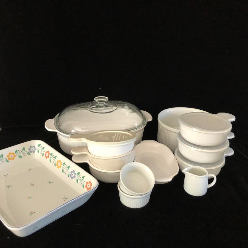 This Dansk lidded casserole crock is very large measuring approximately 9” x 14” and is accompanied by another Dansk piece, a mid sized bowl. The two ramekin dishes are made in France. Also included are six grab-it dishes, four of which have lids, a large floral platter and more.