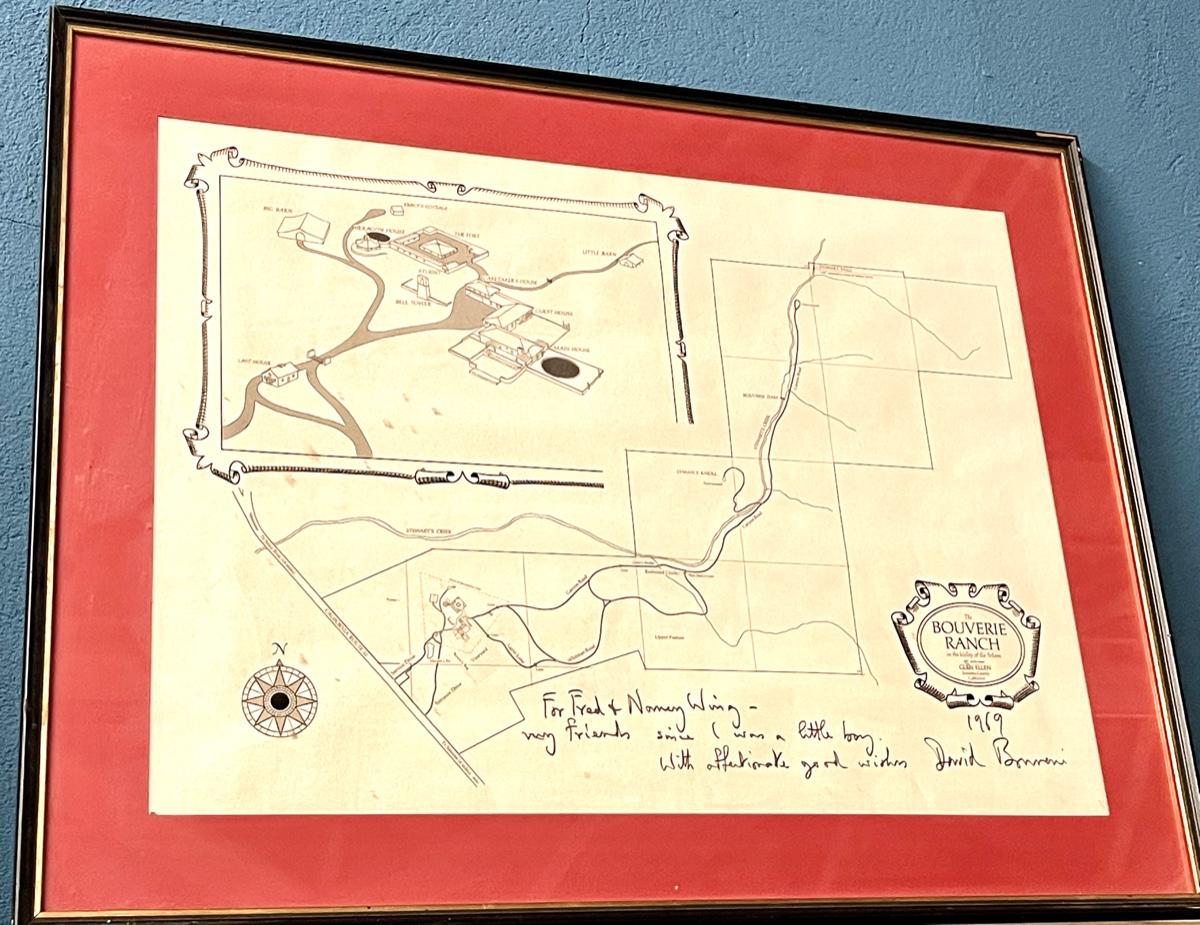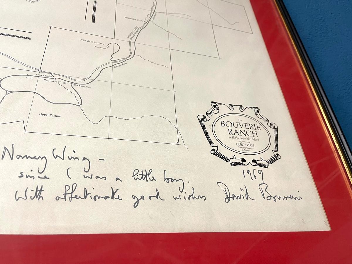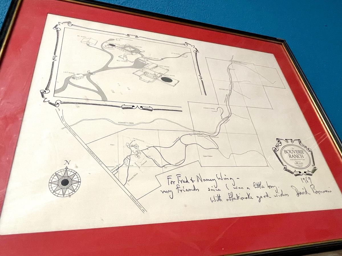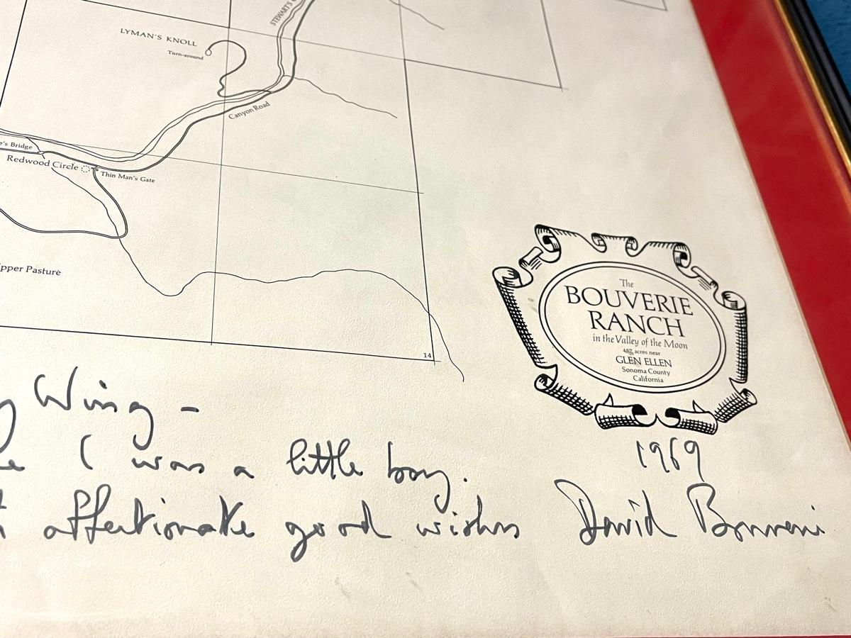 LOT 122 - David - Pleydell-Bouverie Ranch Map, This map is signed by David with a personal inscription by him. This item is part of the David-Pleydell-Bouverie Estate at Bouverie Ranch in Glen Ellen. This item can be viewed at our Green + Cate Showroom in Sebastopol from July 15th - July 18th between the hours of 9am-5pm. For the benefit of the Bouverie Preserve of Audubon Canyon Ranch.