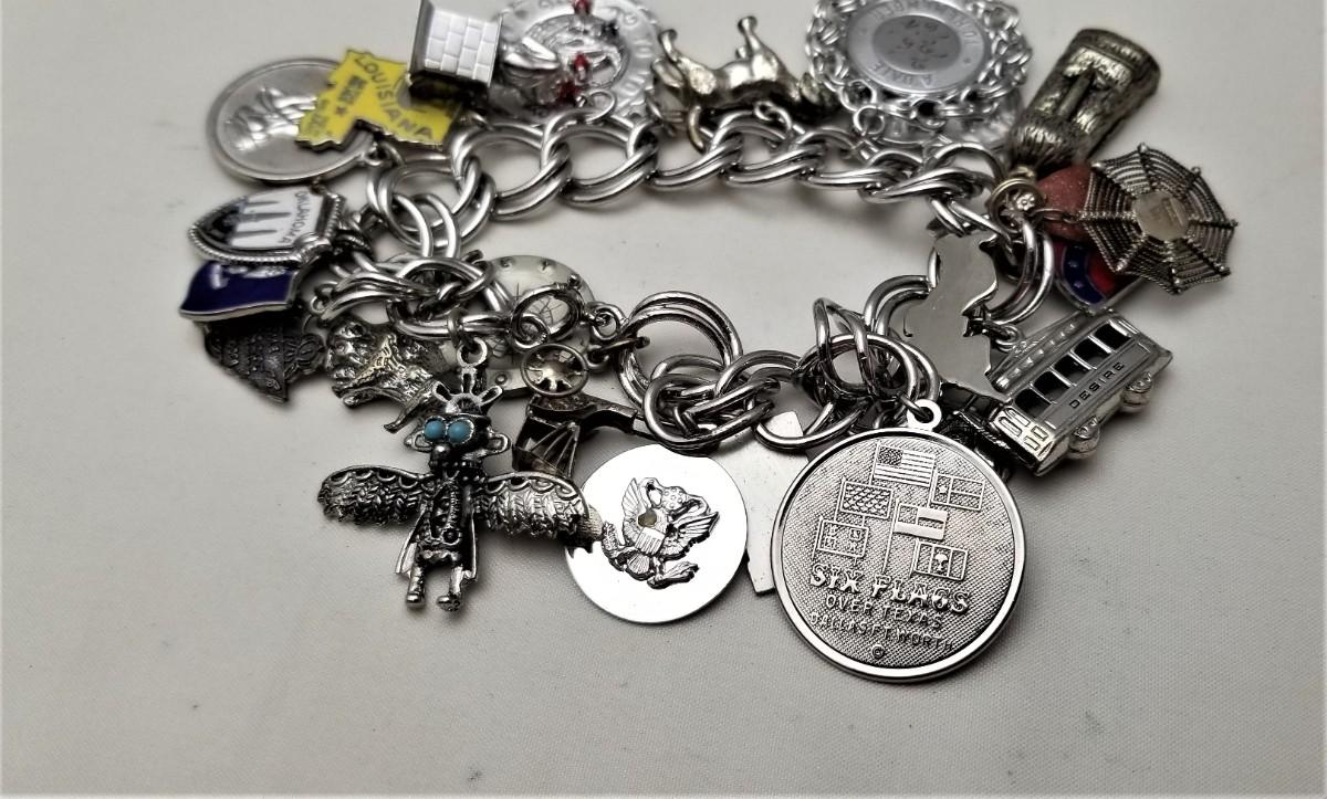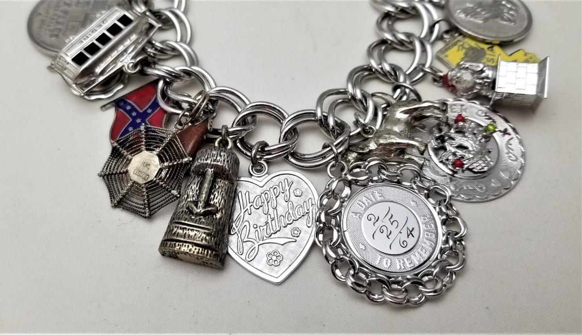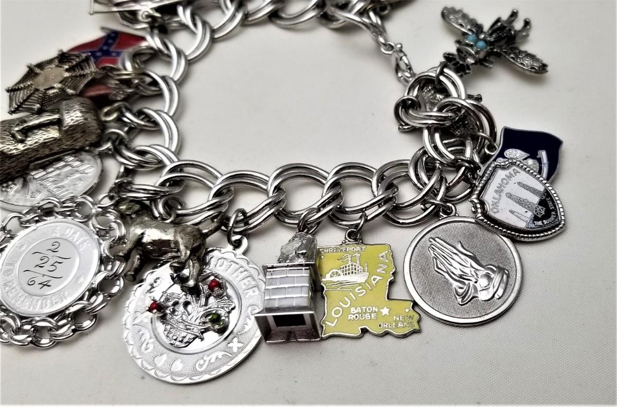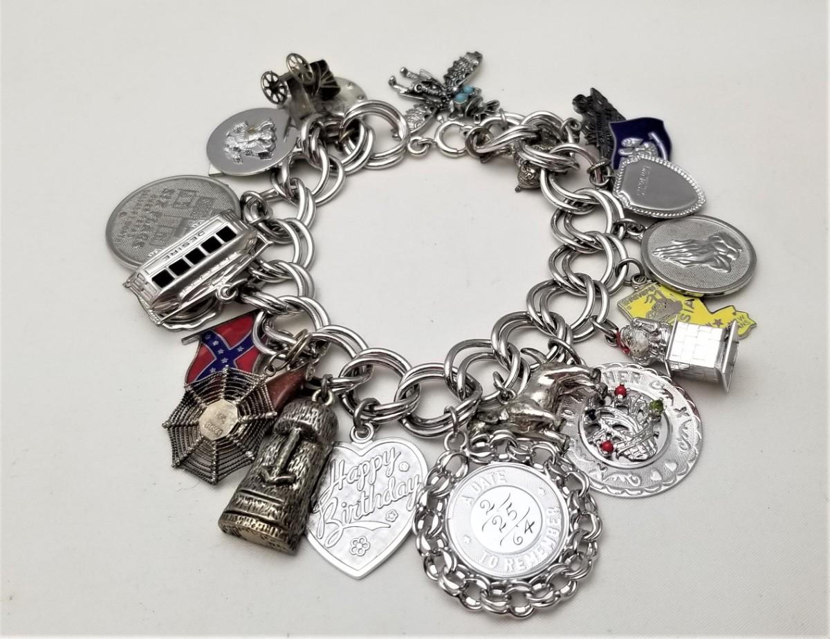 Heavy vintage sterling double silver link charm bracelet and it's loaded. There are a FEW charms that are not marked sterling, but the vast majority of them are. I counted 22 charms, including an enameled Confederate Battle Flag, an enameled State of Louisiana, sterling Tiki Man, sterling St. Christopher, etc. Several ounces of silver here.