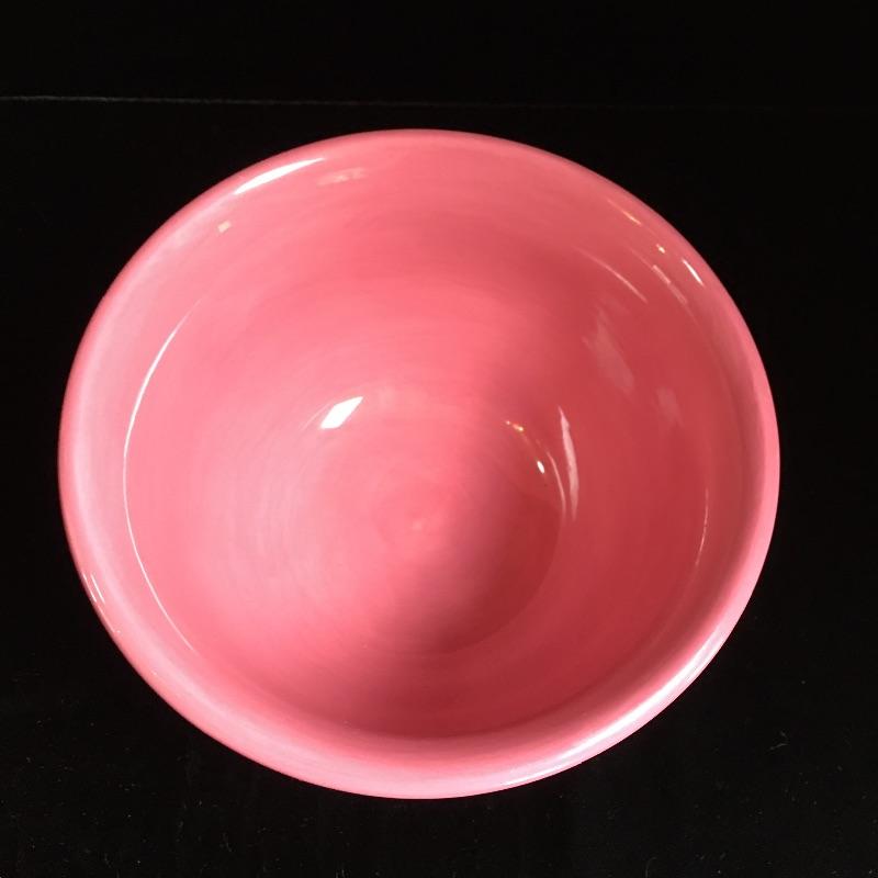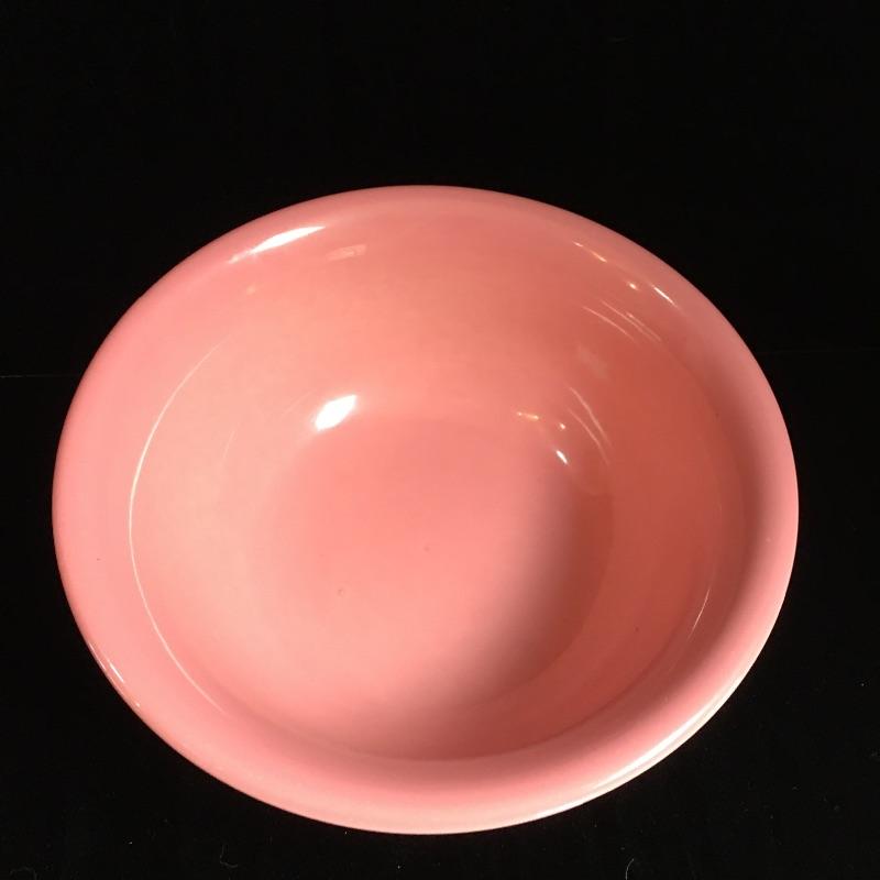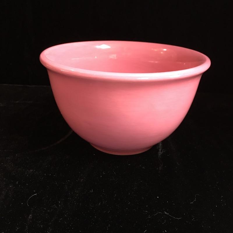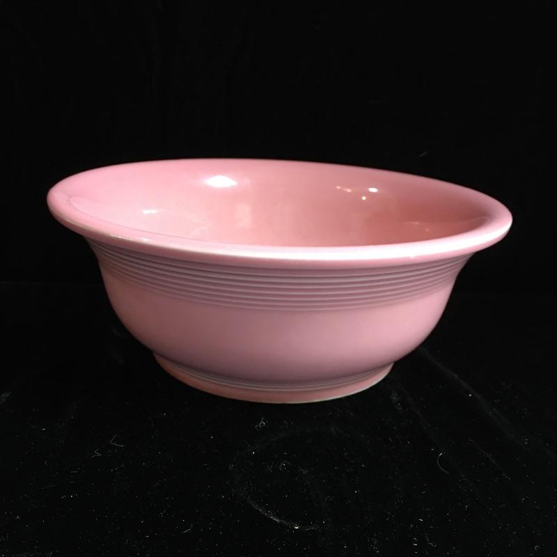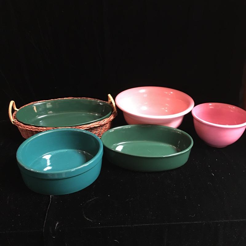 This array of pieces includes two ne pink Fiesta Ware bowl, one Hausenware bowl, one unmarked round green bowl and two unmarked green oval bowls with one basket. Fiesta ware bowl measures 9.25”D x 3.5” tall.