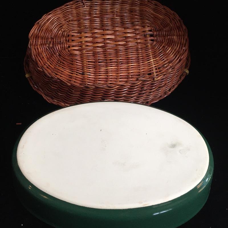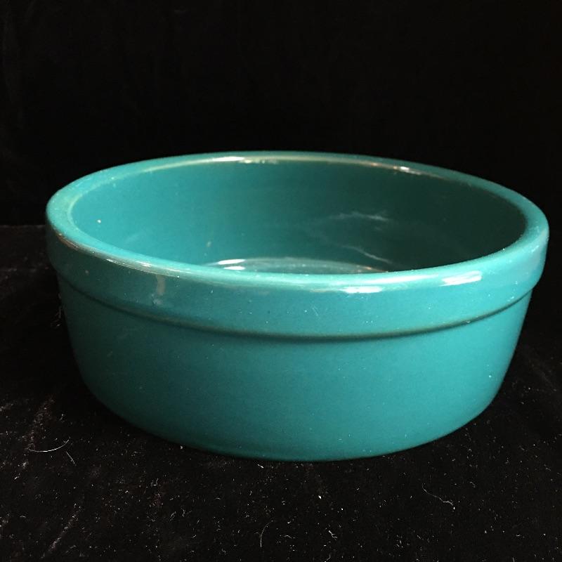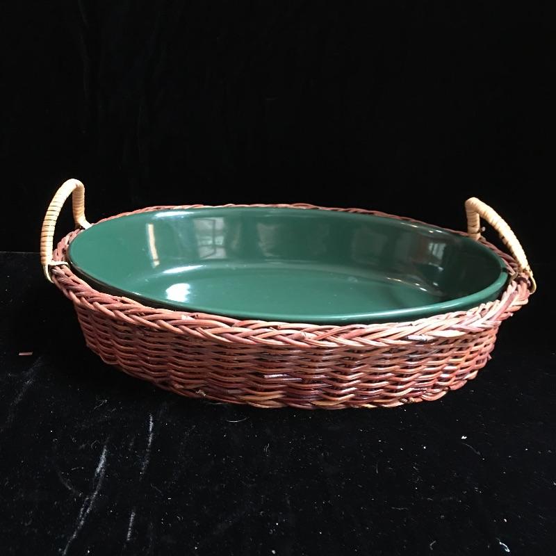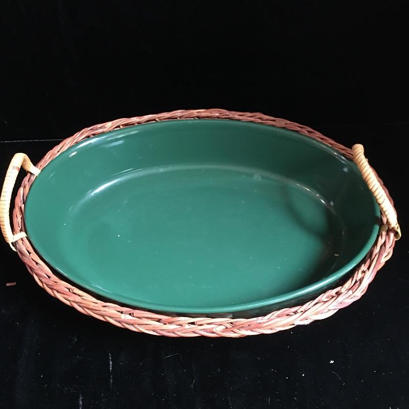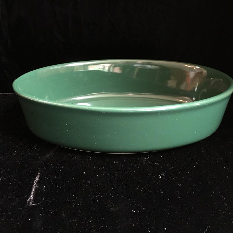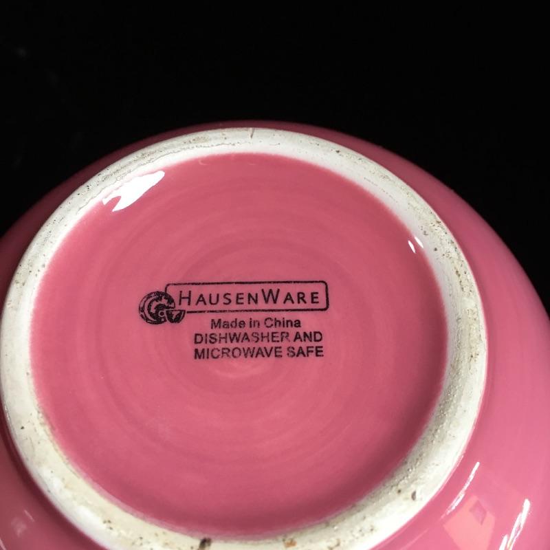 This array of pieces includes two ne pink Fiesta Ware bowl, one Hausenware bowl, one unmarked round green bowl and two unmarked green oval bowls with one basket. Fiesta ware bowl measures 9.25”D x 3.5” tall.