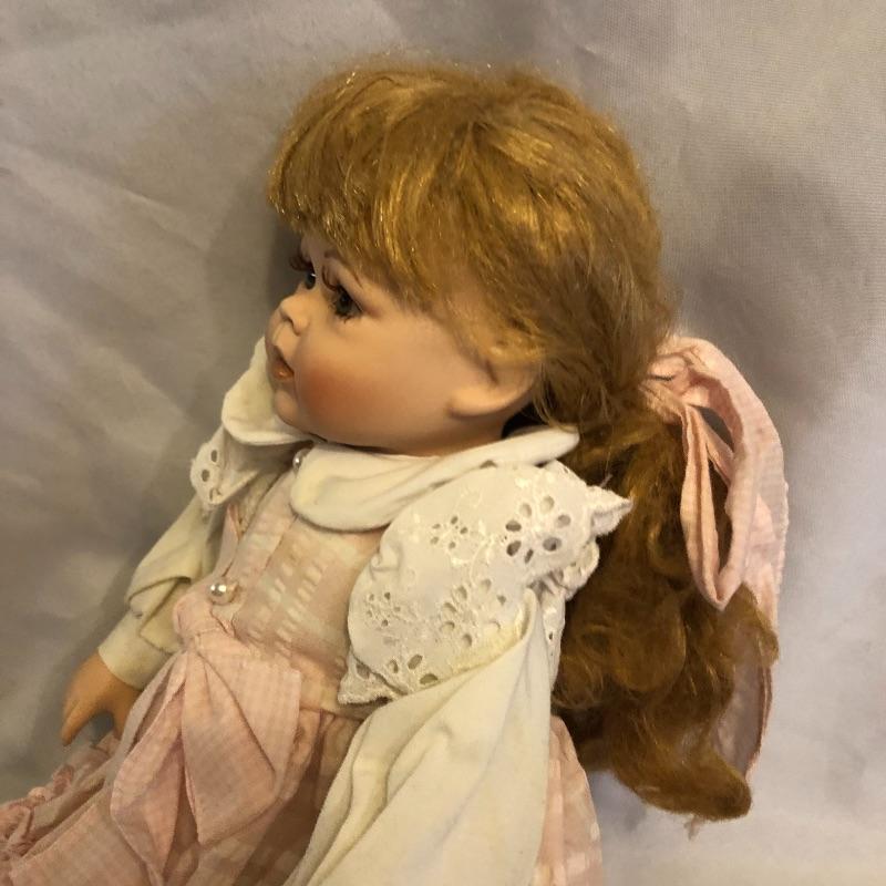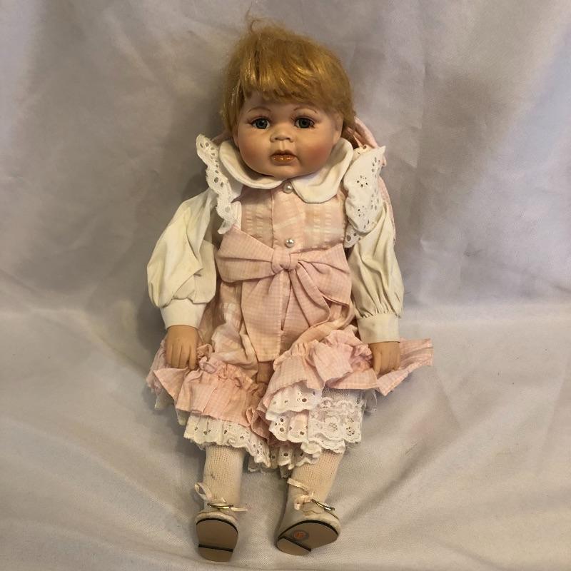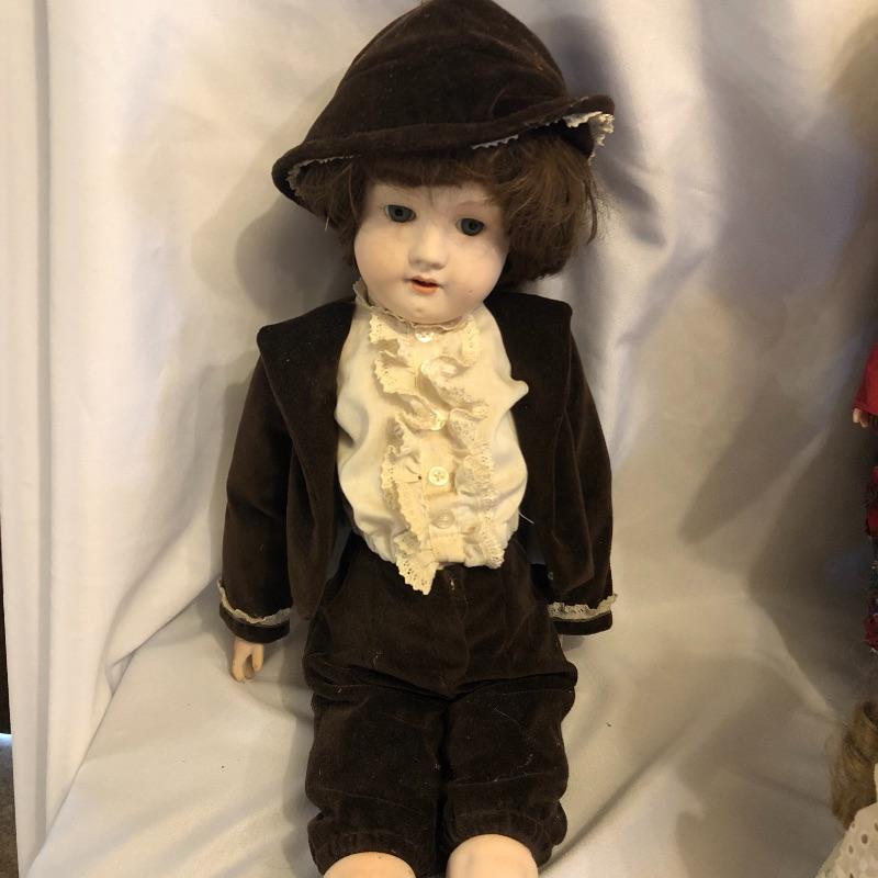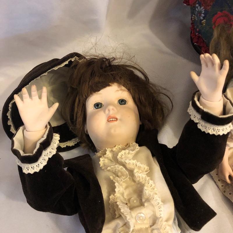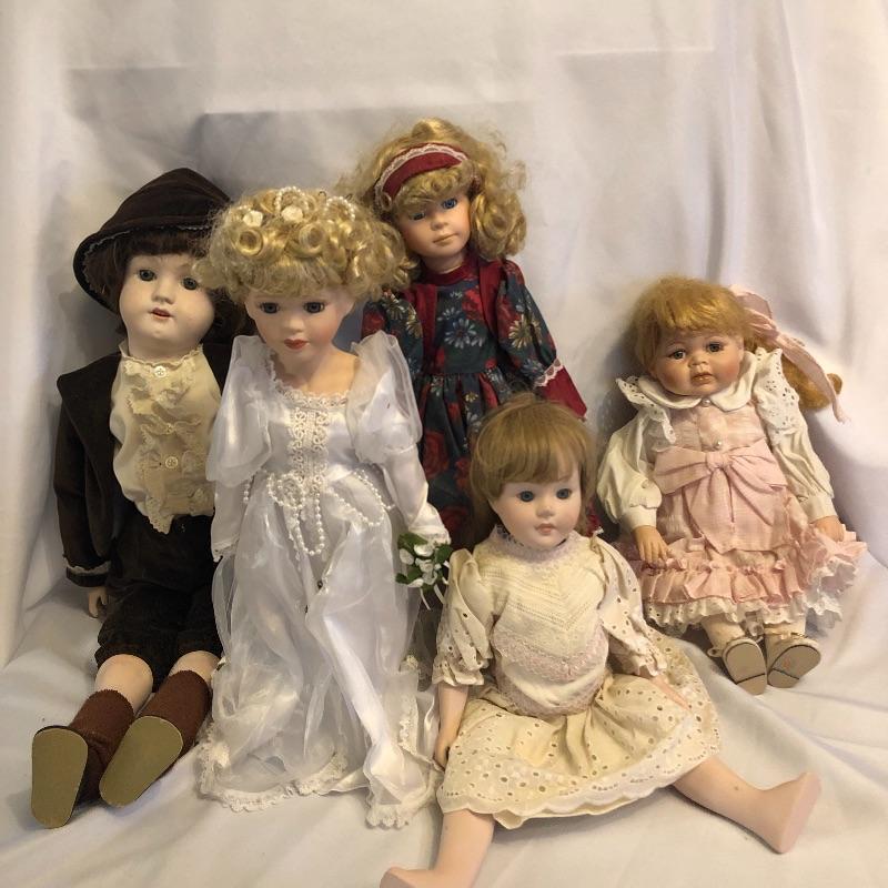 This lot includes five porcelain dolls-four girls and one boy. The boy dressed in brown has moveable joints -wrists, elbows, shoulders, legs, knees and neck. He is 26.5” tall and dressed in a corduroy outfit. The doll in a wedding dress is on a stand and is approximately 18” tall. The doll in a floral red dress with red leather shoes is 17.5” tall. She is a mix of porcelain and cloth. The doll in the pink dress is 16” tall and a mix of porcelain and cloth. The last doll is all porcelain with moveable arms, legs and head. She is 18” tall. Shipping Available.