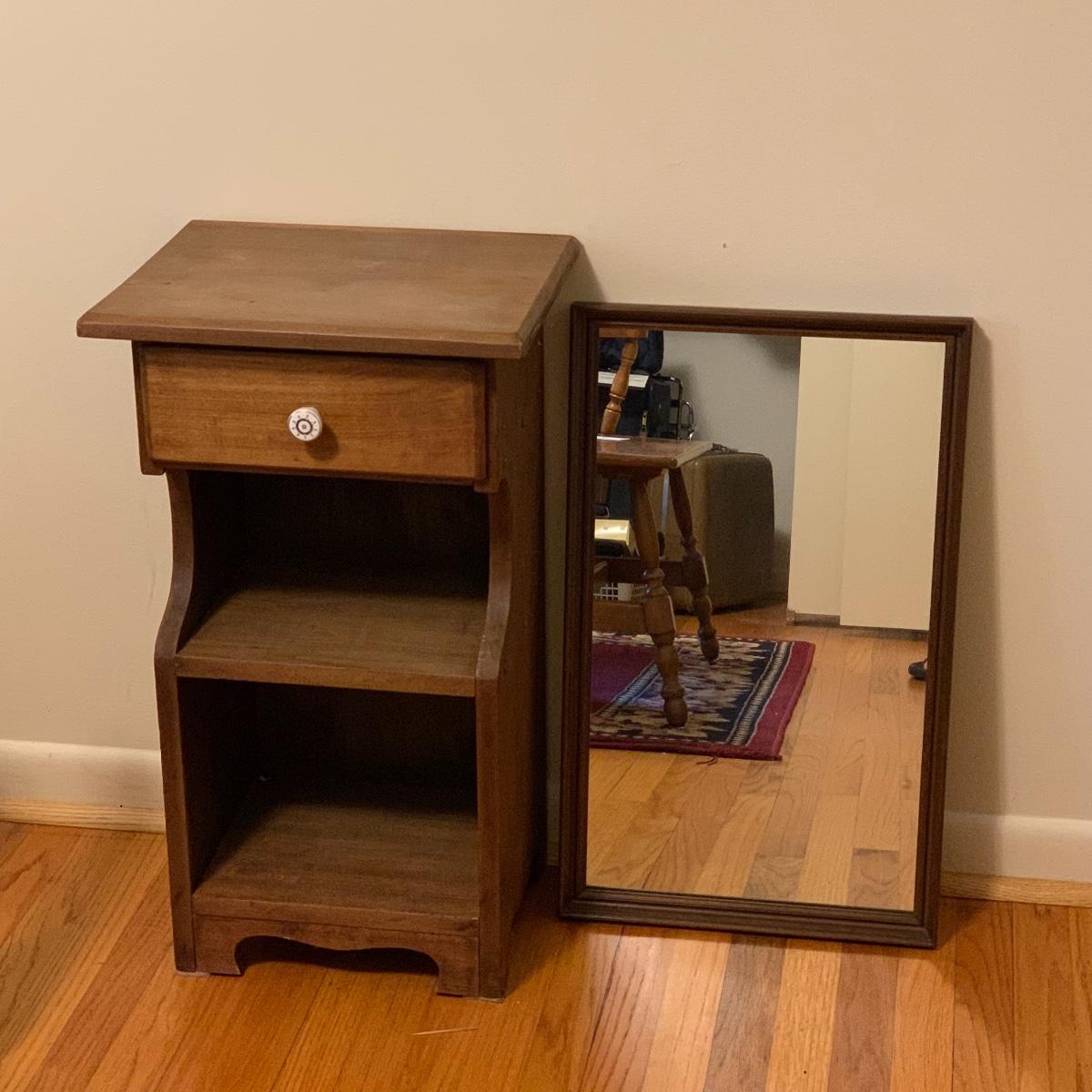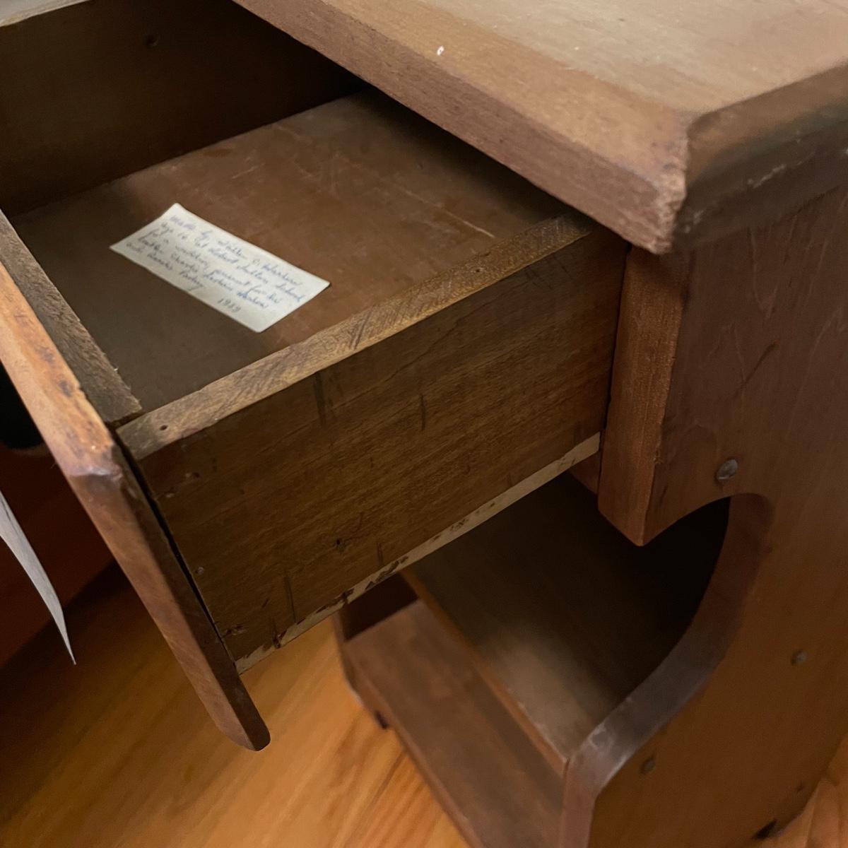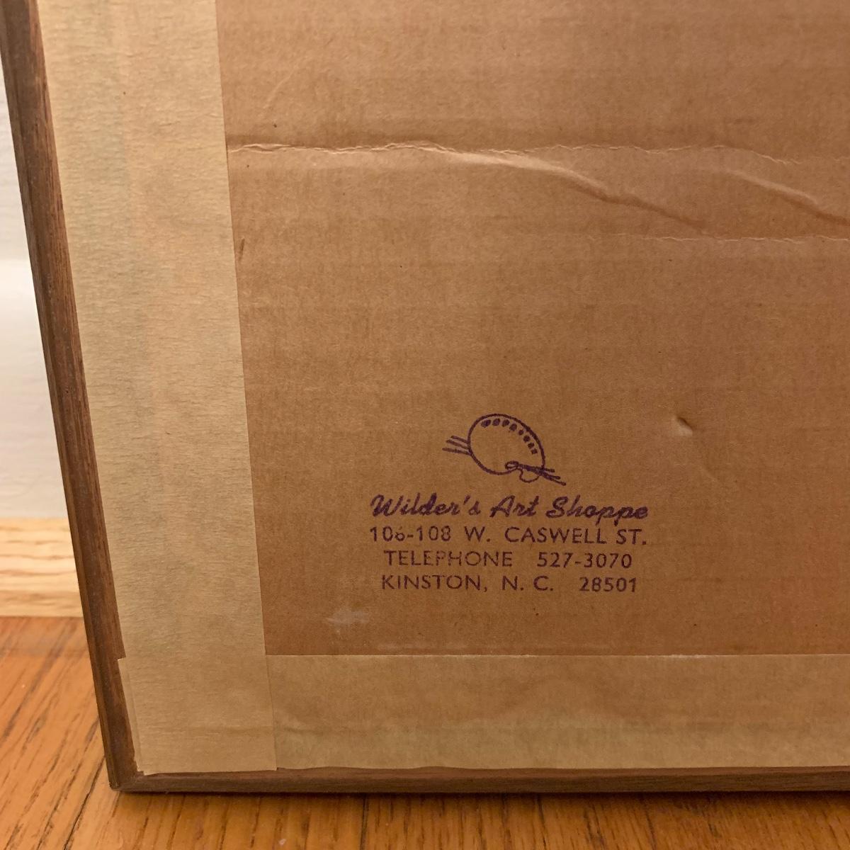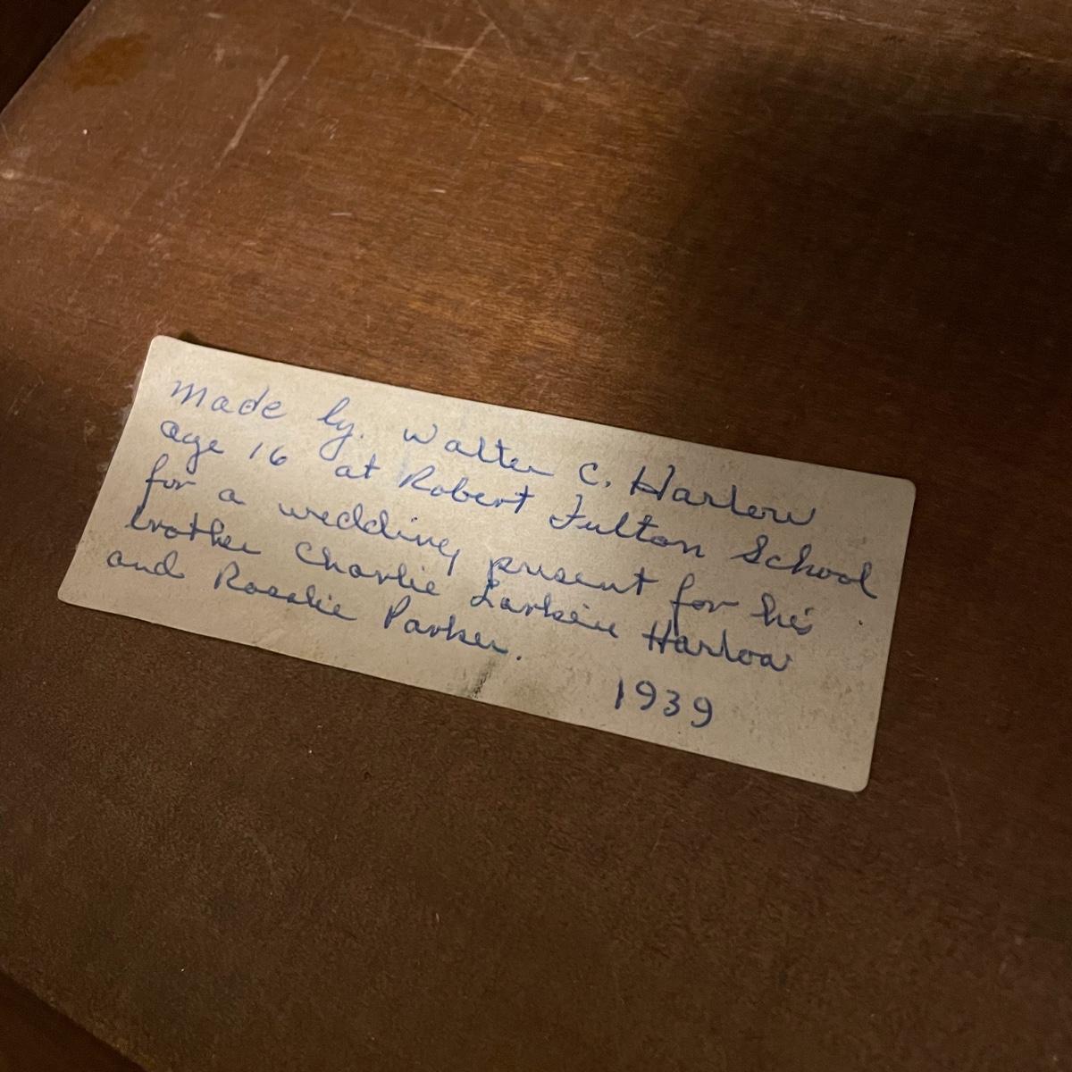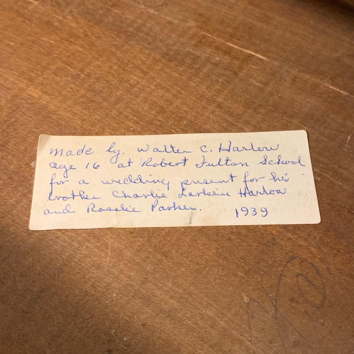 This unique lot contains a nice framed wooden mirror and a handmade wooden telephone table. The mirror measures 15.5” x 1.5” x 25.75”. It has a sturdy wire attached to the back for hanging. The mirror is from Wilder’s Art Shoppe in Kinston, North Carolina. The side table has a little drawer and two shelves. It measures 16” x 13.5” x 28.25”. Not only is it lovely and well made, but it is extra special because it has a note in the drawer that says it was made by Walter C. Harlow at age 16 at Robert Fulton School as a wedding present for his brother in 1939.