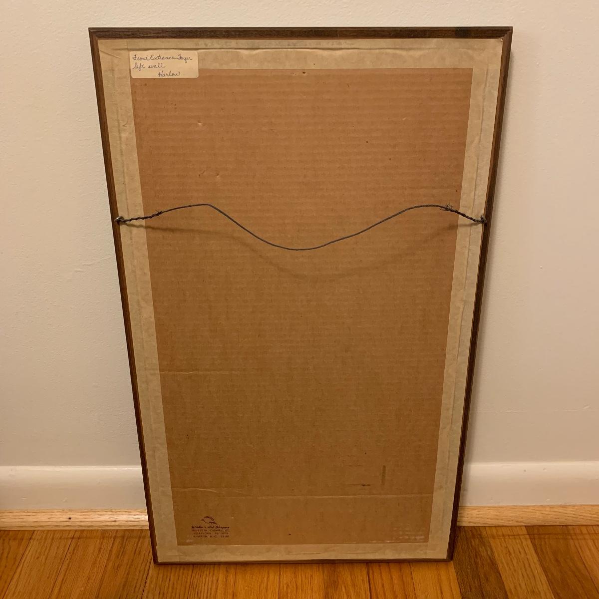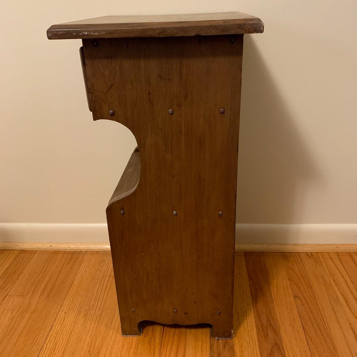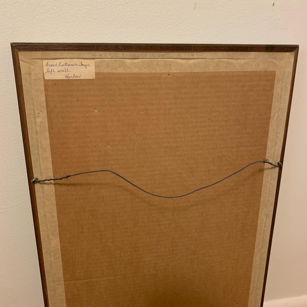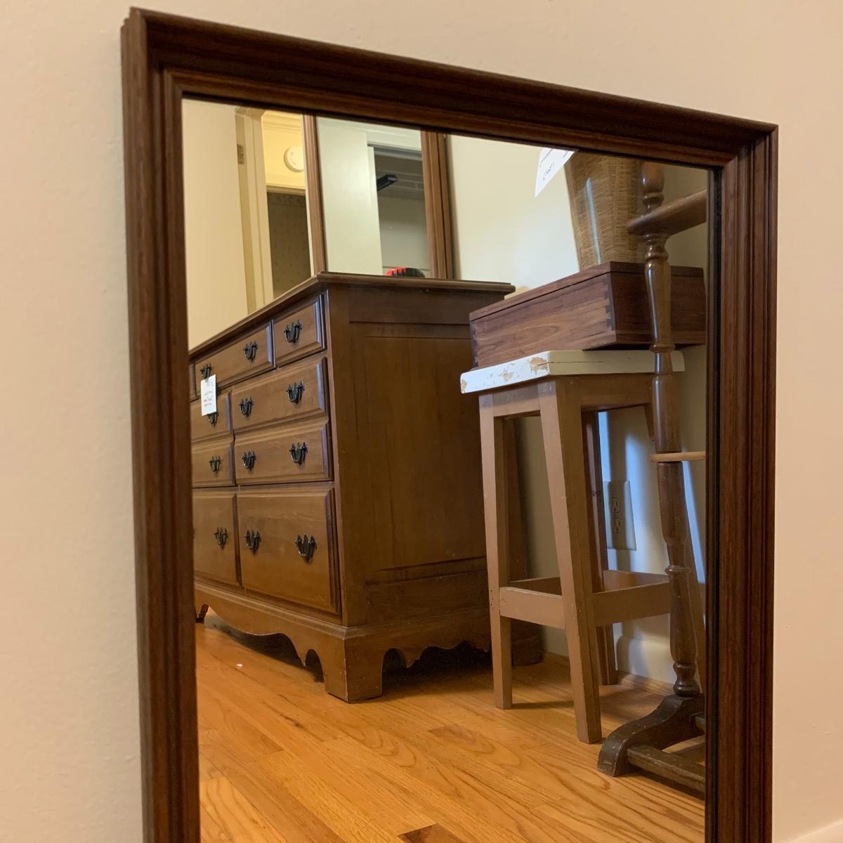 This unique lot contains a nice framed wooden mirror and a handmade wooden telephone table. The mirror measures 15.5” x 1.5” x 25.75”. It has a sturdy wire attached to the back for hanging. The mirror is from Wilder’s Art Shoppe in Kinston, North Carolina. The side table has a little drawer and two shelves. It measures 16” x 13.5” x 28.25”. Not only is it lovely and well made, but it is extra special because it has a note in the drawer that says it was made by Walter C. Harlow at age 16 at Robert Fulton School as a wedding present for his brother in 1939.
