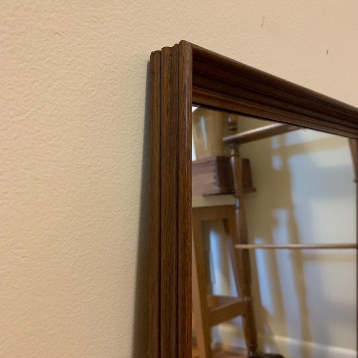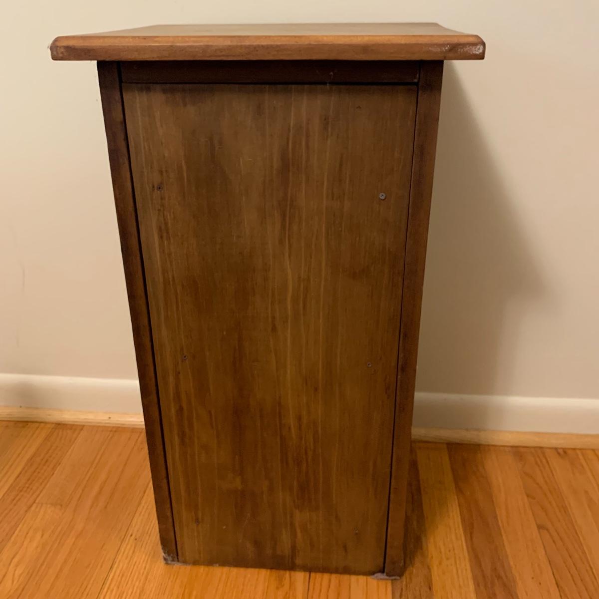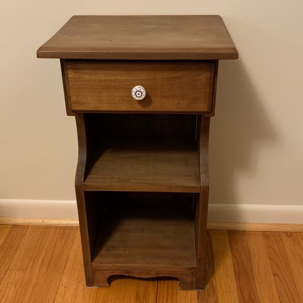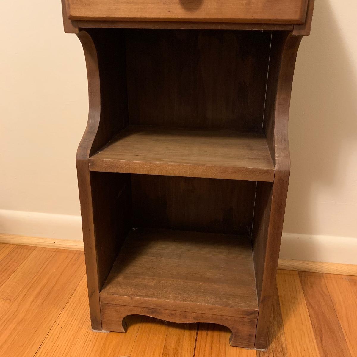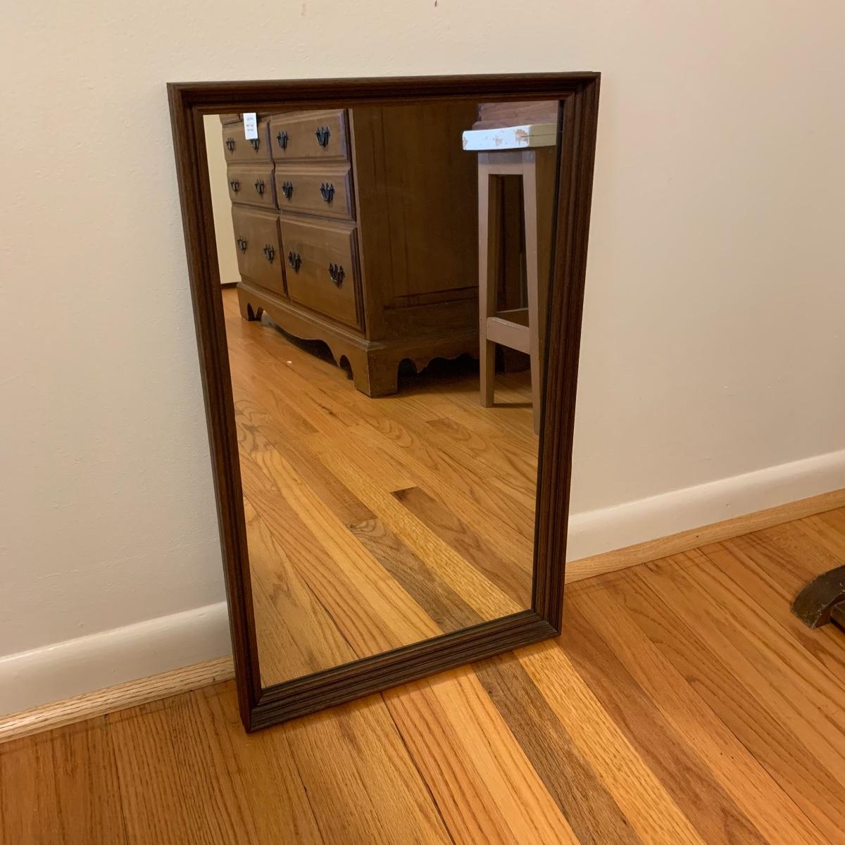 This unique lot contains a nice framed wooden mirror and a handmade wooden telephone table. The mirror measures 15.5” x 1.5” x 25.75”. It has a sturdy wire attached to the back for hanging. The mirror is from Wilder’s Art Shoppe in Kinston, North Carolina. The side table has a little drawer and two shelves. It measures 16” x 13.5” x 28.25”. Not only is it lovely and well made, but it is extra special because it has a note in the drawer that says it was made by Walter C. Harlow at age 16 at Robert Fulton School as a wedding present for his brother in 1939.