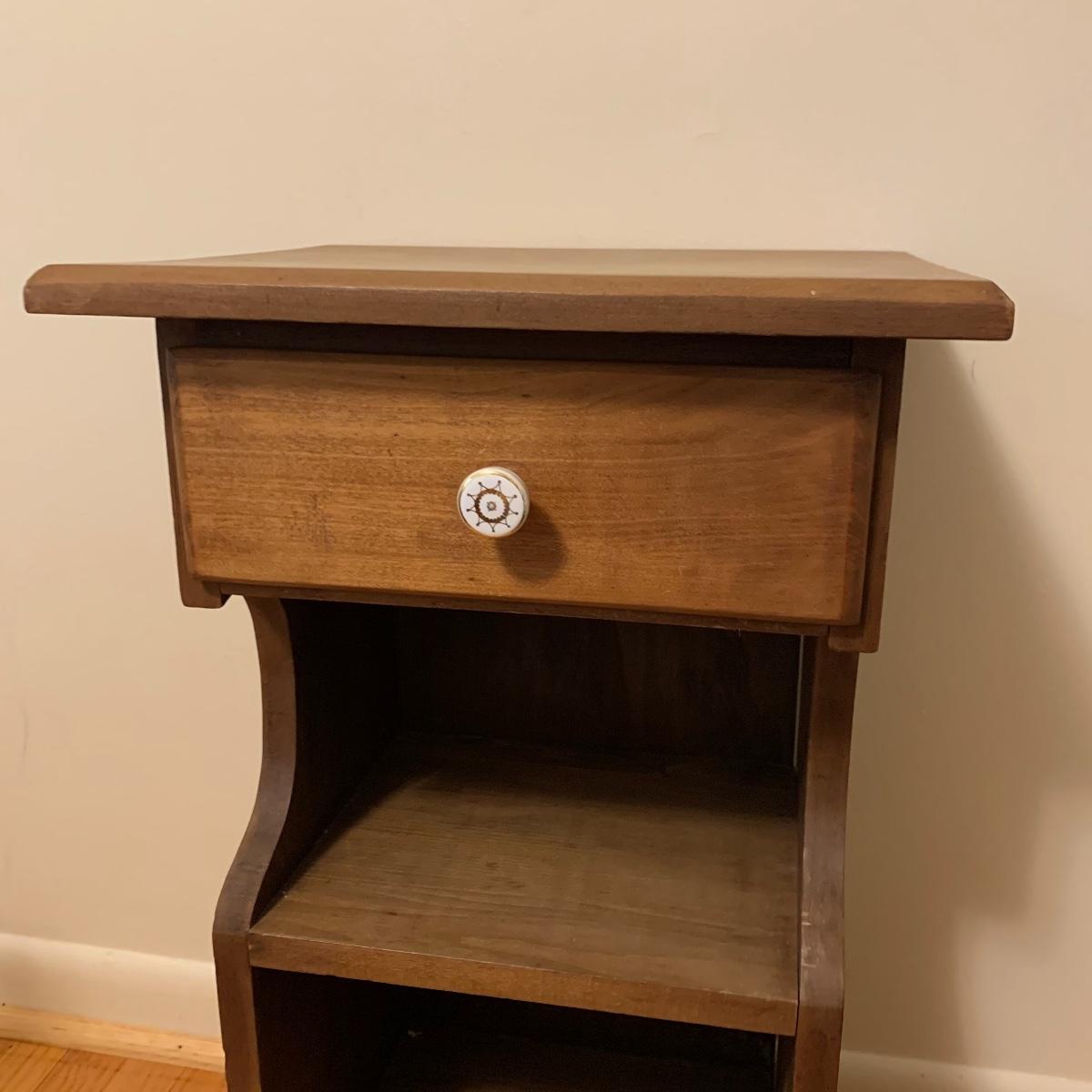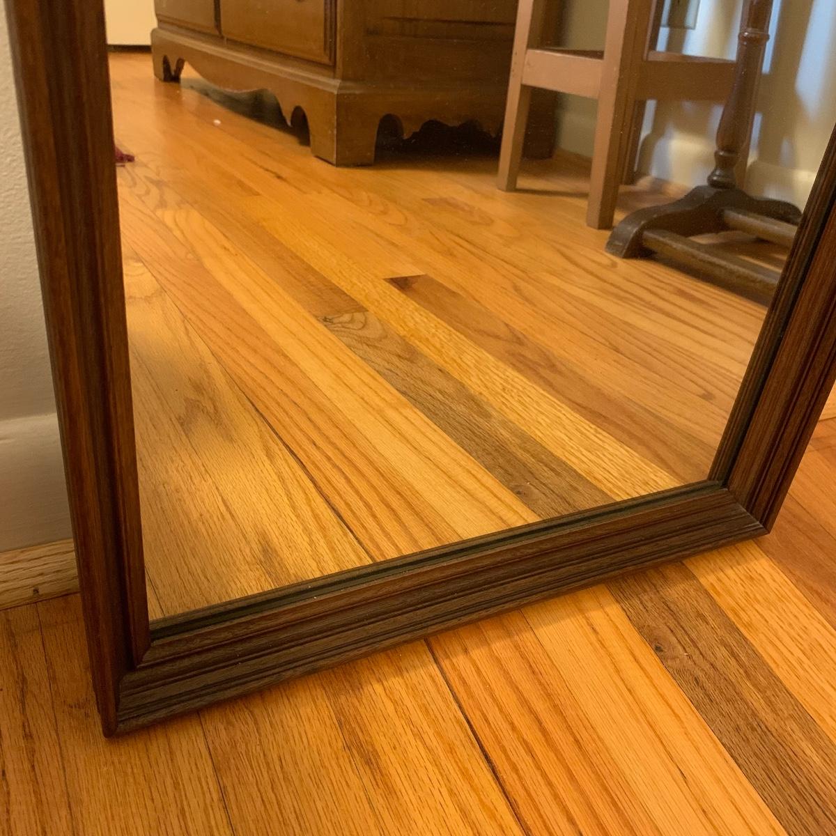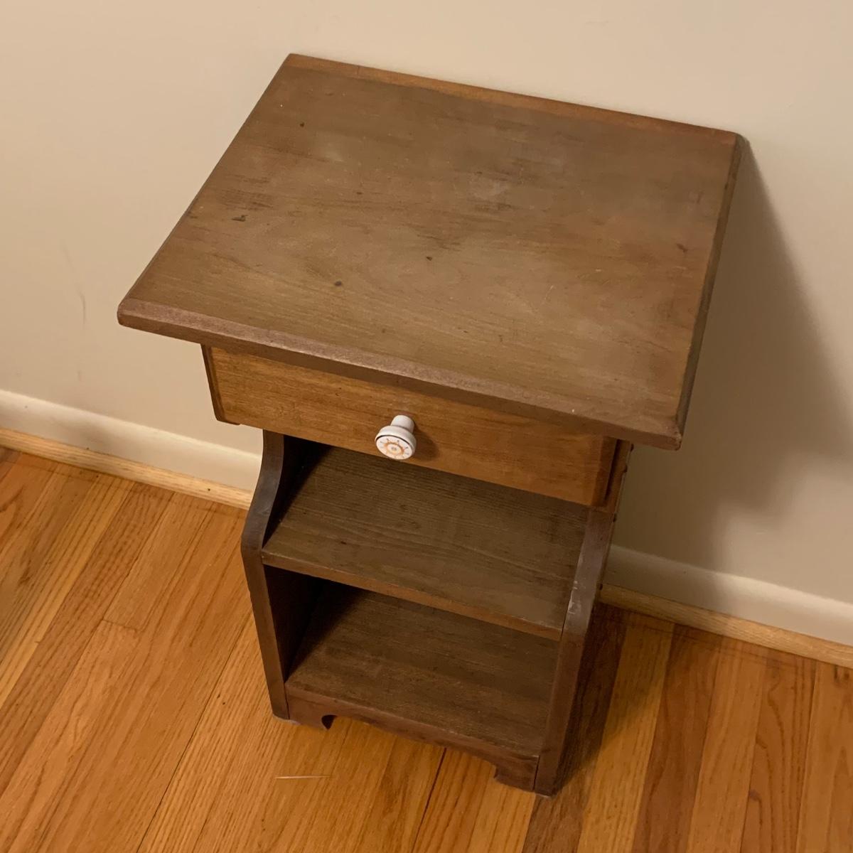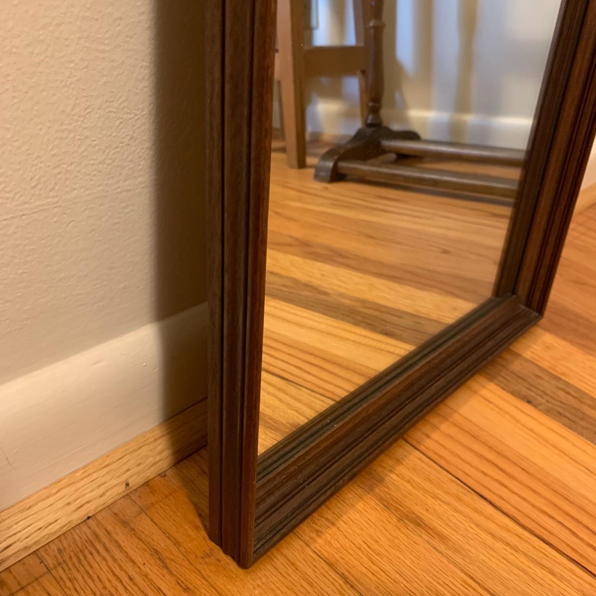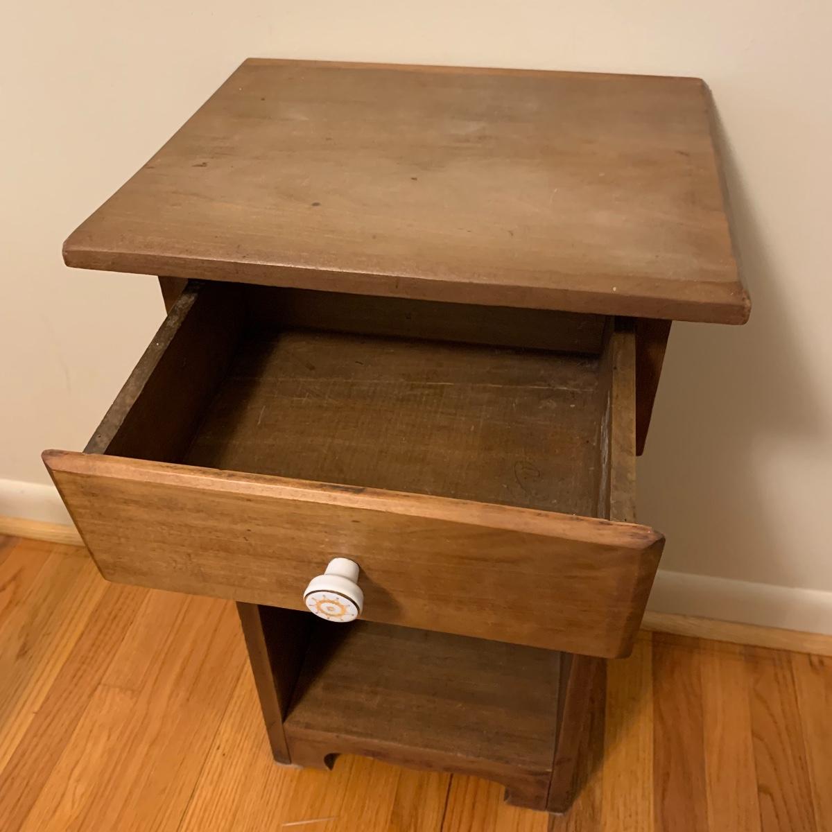 This unique lot contains a nice framed wooden mirror and a handmade wooden telephone table. The mirror measures 15.5” x 1.5” x 25.75”. It has a sturdy wire attached to the back for hanging. The mirror is from Wilder’s Art Shoppe in Kinston, North Carolina. The side table has a little drawer and two shelves. It measures 16” x 13.5” x 28.25”. Not only is it lovely and well made, but it is extra special because it has a note in the drawer that says it was made by Walter C. Harlow at age 16 at Robert Fulton School as a wedding present for his brother in 1939.