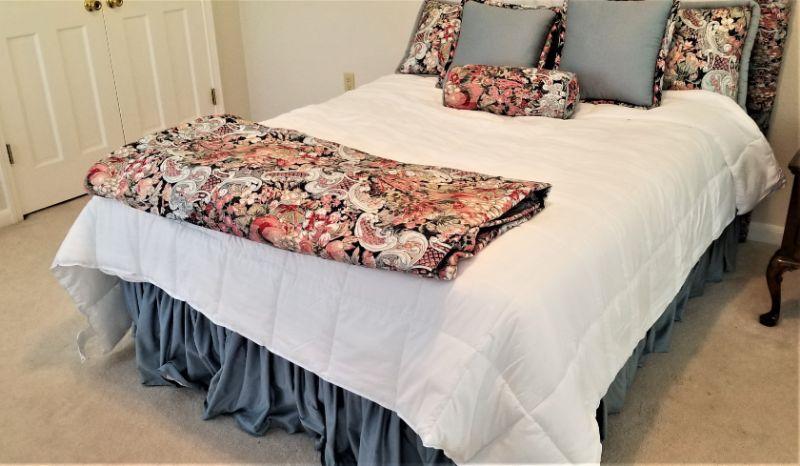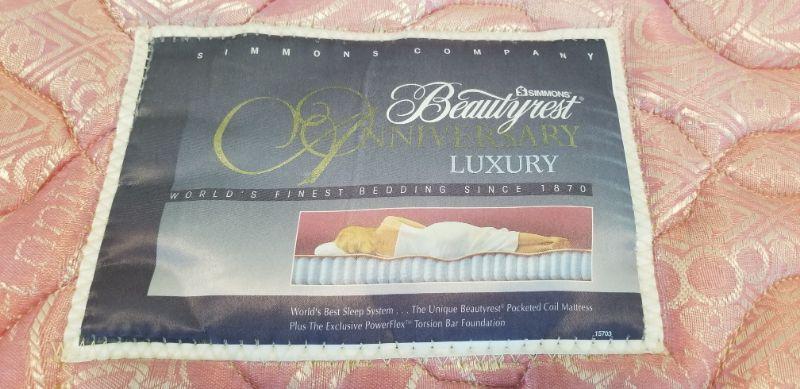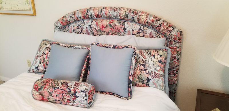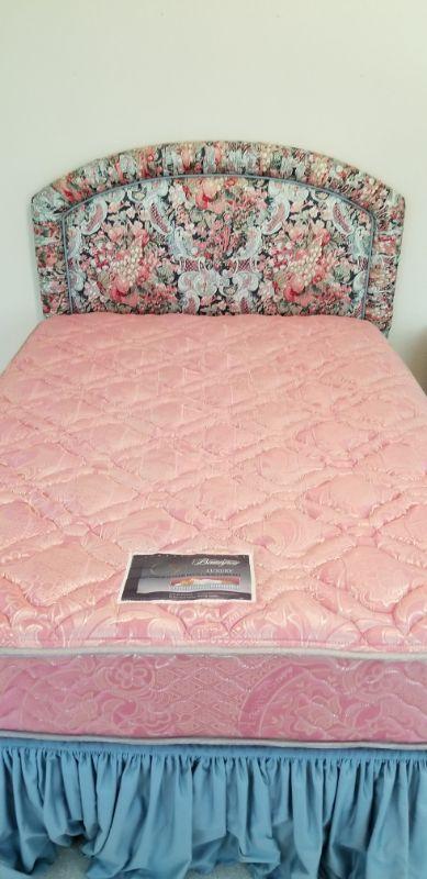Pretty full/double bed with upholstered headboard and matching bed linens. Perfect for guest room or second home. Simmons Beauty Rest mattress is older but useable. Very clean. All linens (those you see here) are included. 57" across (headboard) - 48" tall at tallest point.