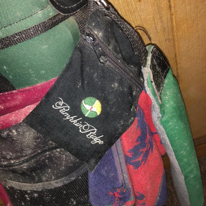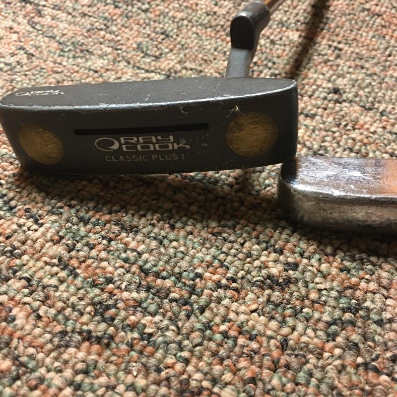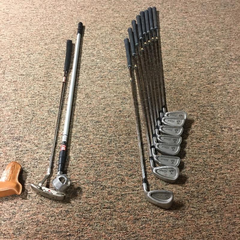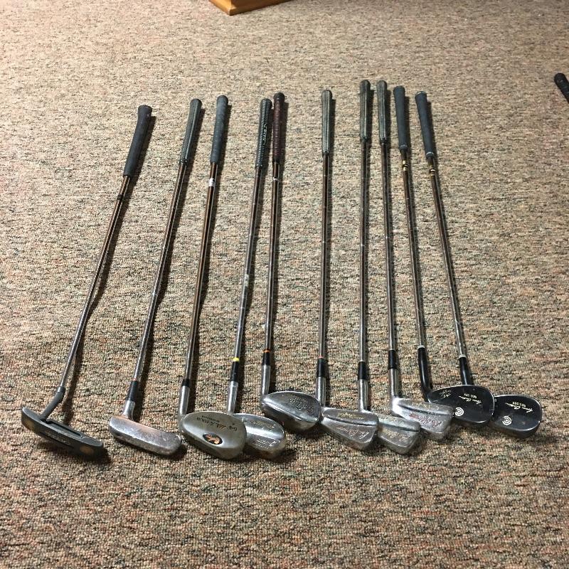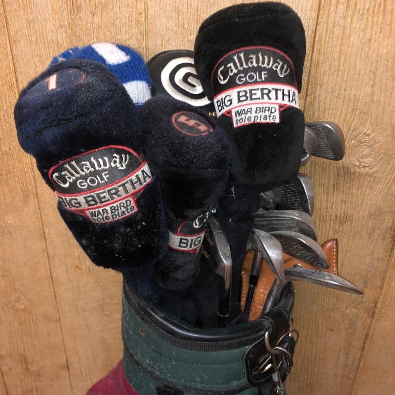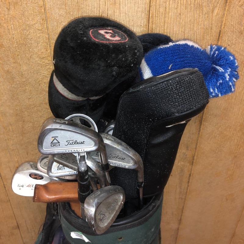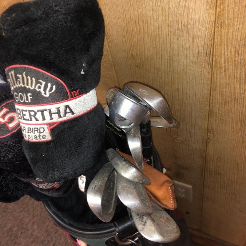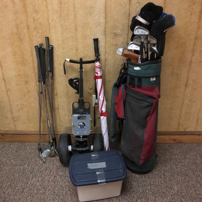 This lot is an assortment of golf gear. Included is a golf bag, Callaway drivers, Titelist irons, Ray Cook putter, a caddy, a umbrella, and more. This lot is perfect for golf lovers or anyone looking to pick up the sport. Green and red golf bag measures 35.5”H. Local pickup only.