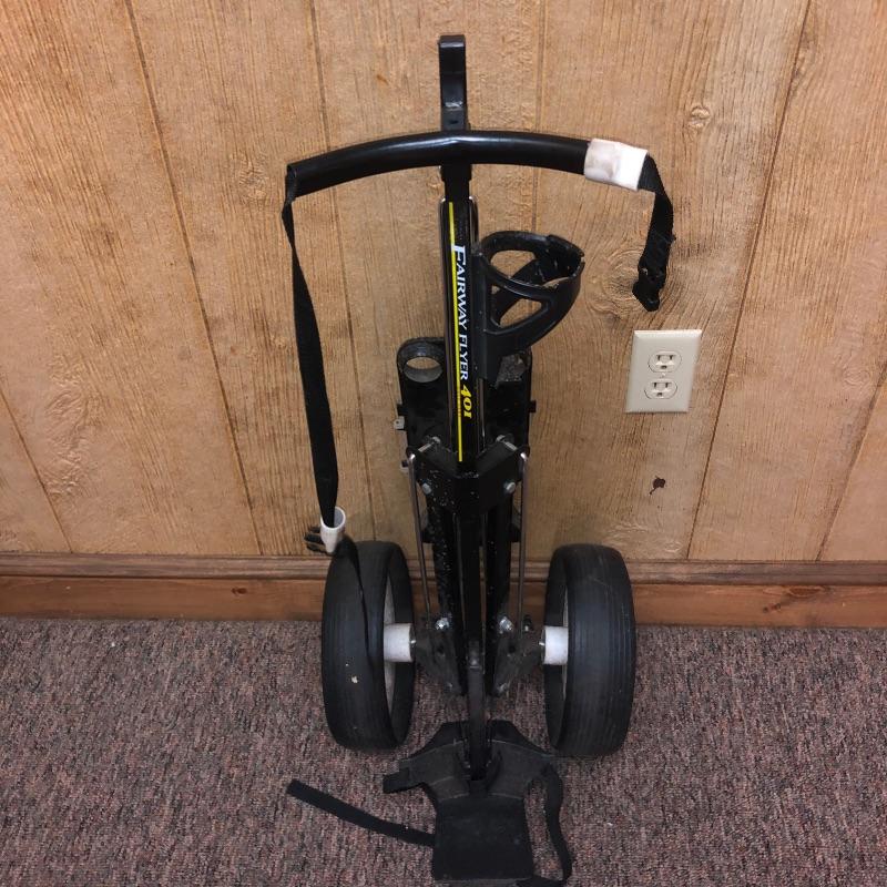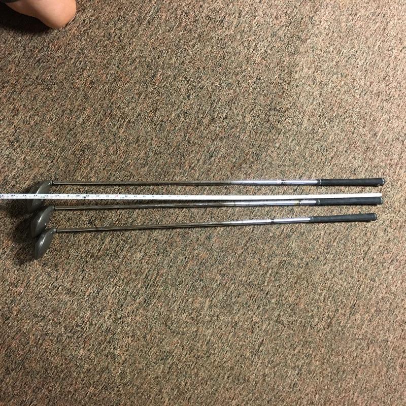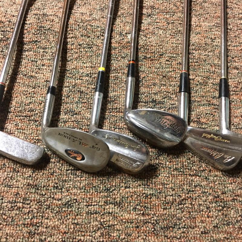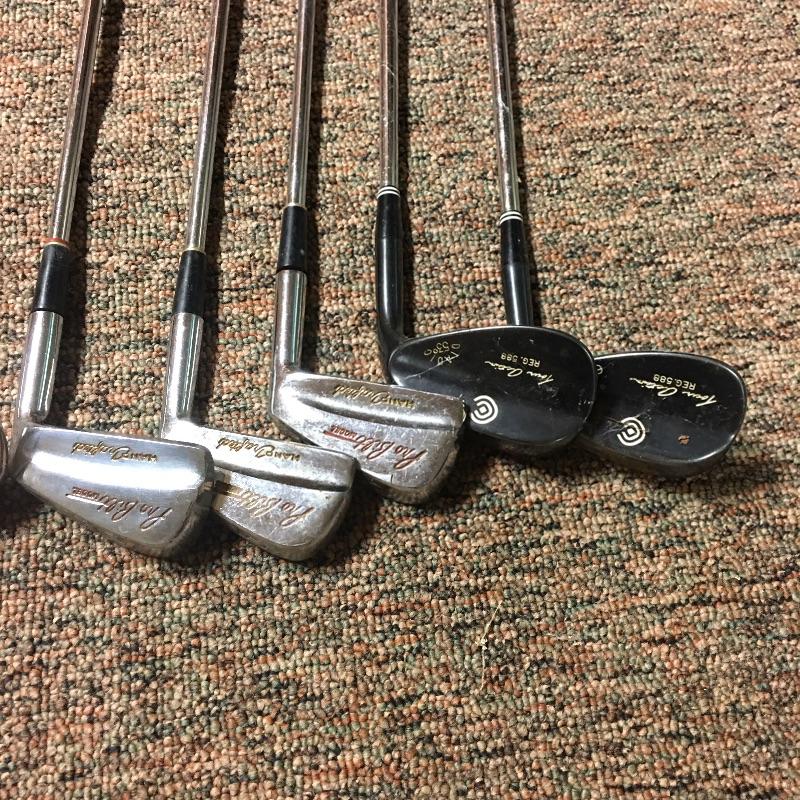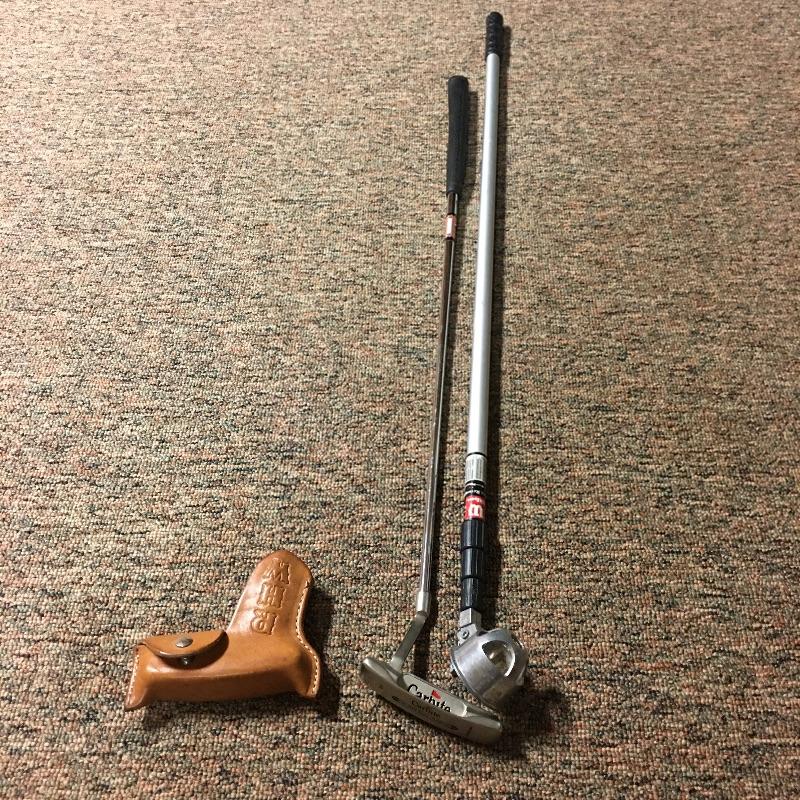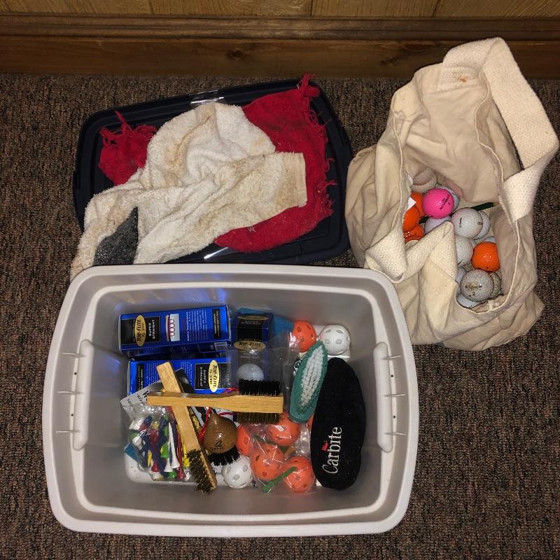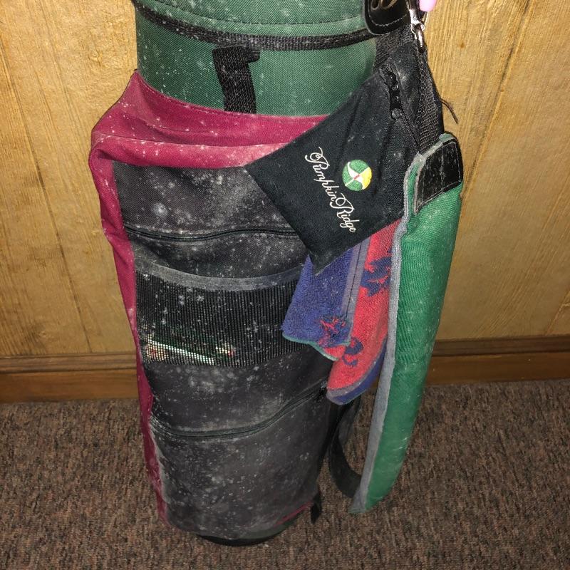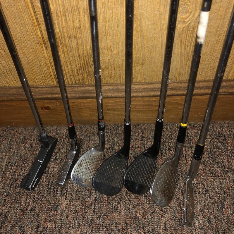 This lot is an assortment of golf gear. Included is a golf bag, Callaway drivers, Titelist irons, Ray Cook putter, a caddy, a umbrella, and more. This lot is perfect for golf lovers or anyone looking to pick up the sport. Green and red golf bag measures 35.5”H. Local pickup only.