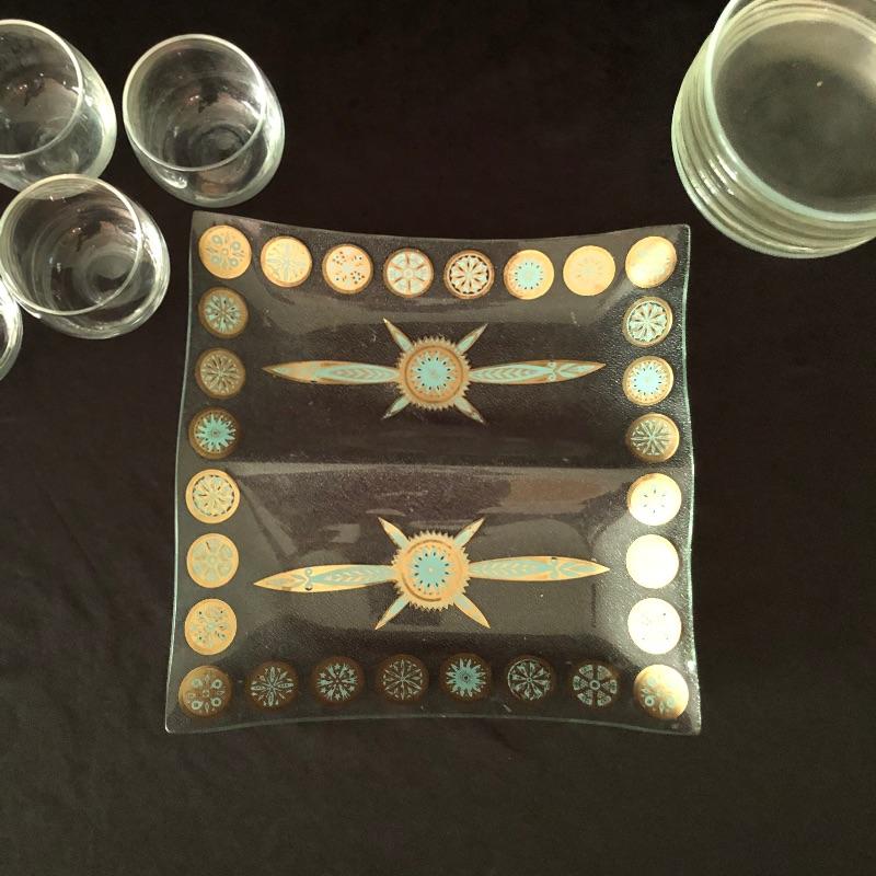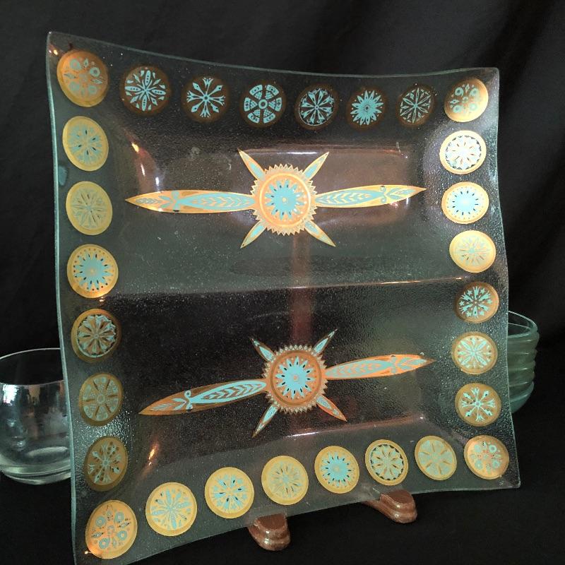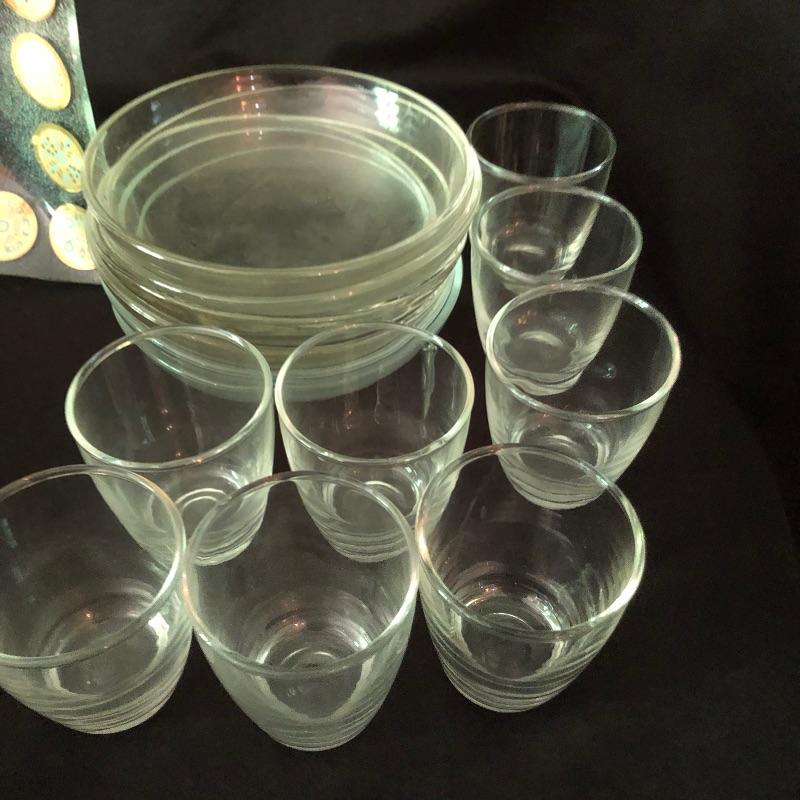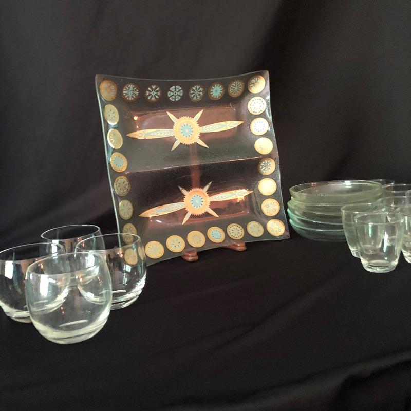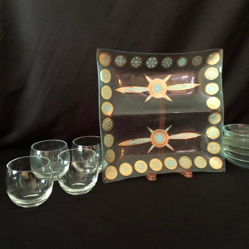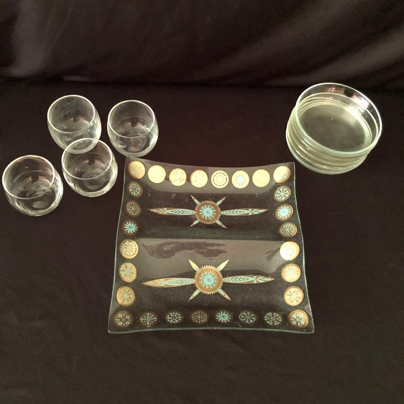 Nice assortment of retro glassware with an MCM style look to them. A total of four tumbler glasses and eight smaller glasses that are slightly bigger than shot glasses and six shallow bowls. The white retro ice bucket appears to be white plastic. The 11.5” gold and green embossed plate has lovely gold circles with green embellishments.