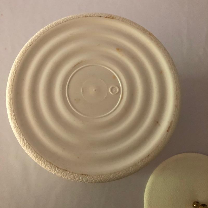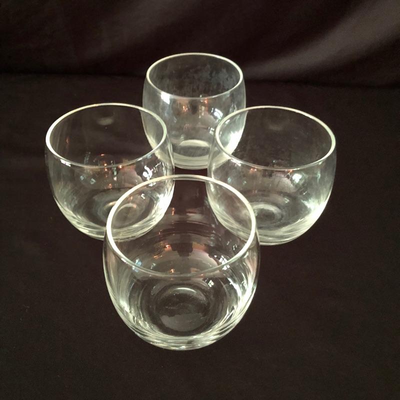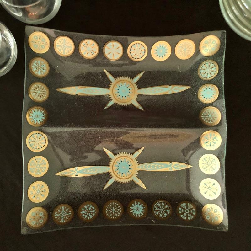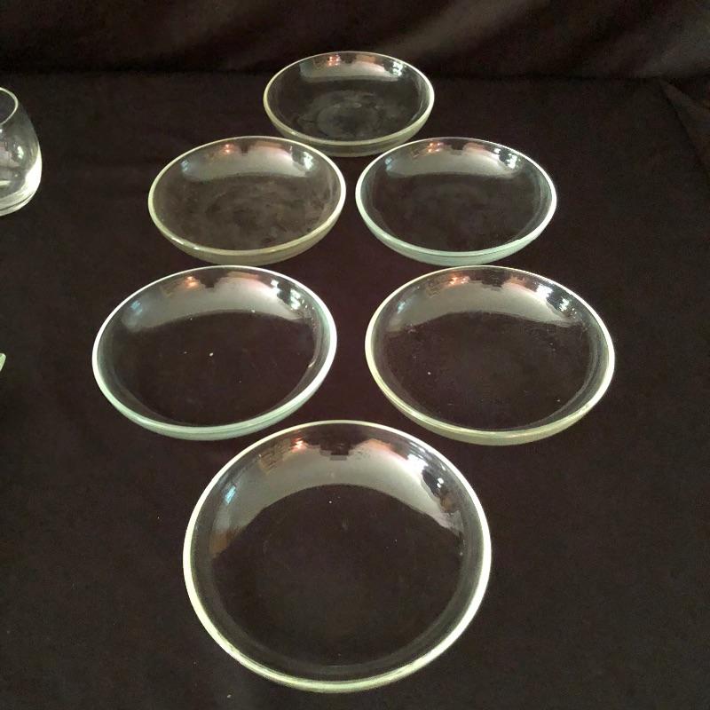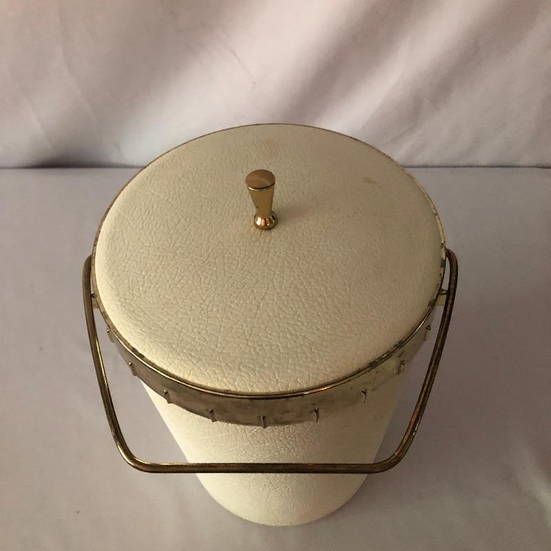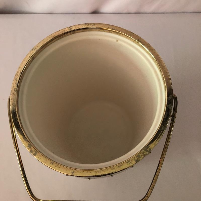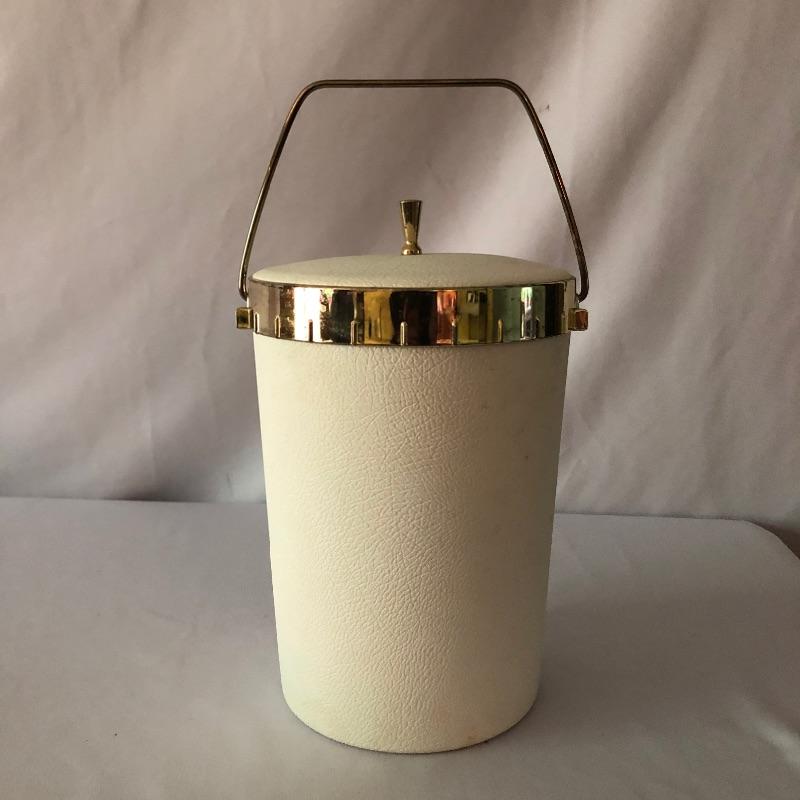 Nice assortment of retro glassware with an MCM style look to them. A total of four tumbler glasses and eight smaller glasses that are slightly bigger than shot glasses and six shallow bowls. The white retro ice bucket appears to be white plastic. The 11.5” gold and green embossed plate has lovely gold circles with green embellishments.