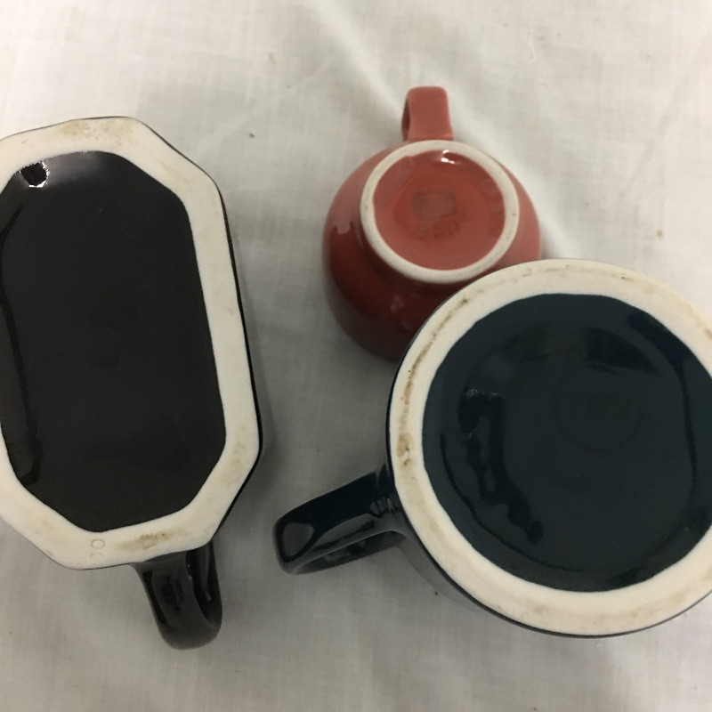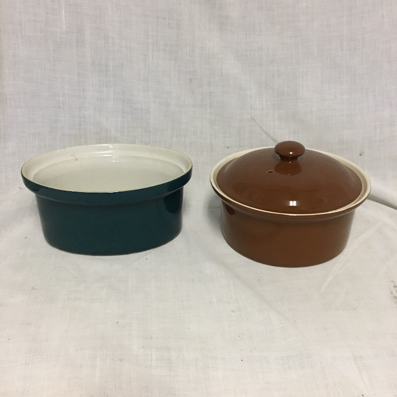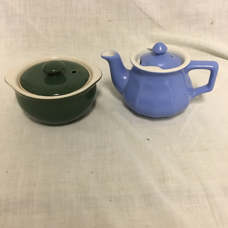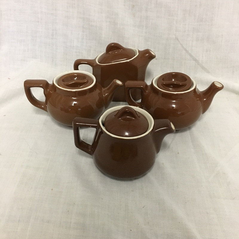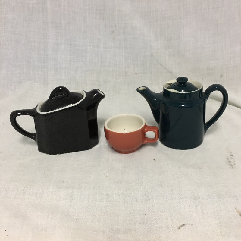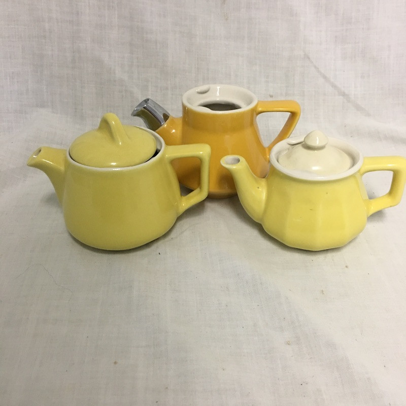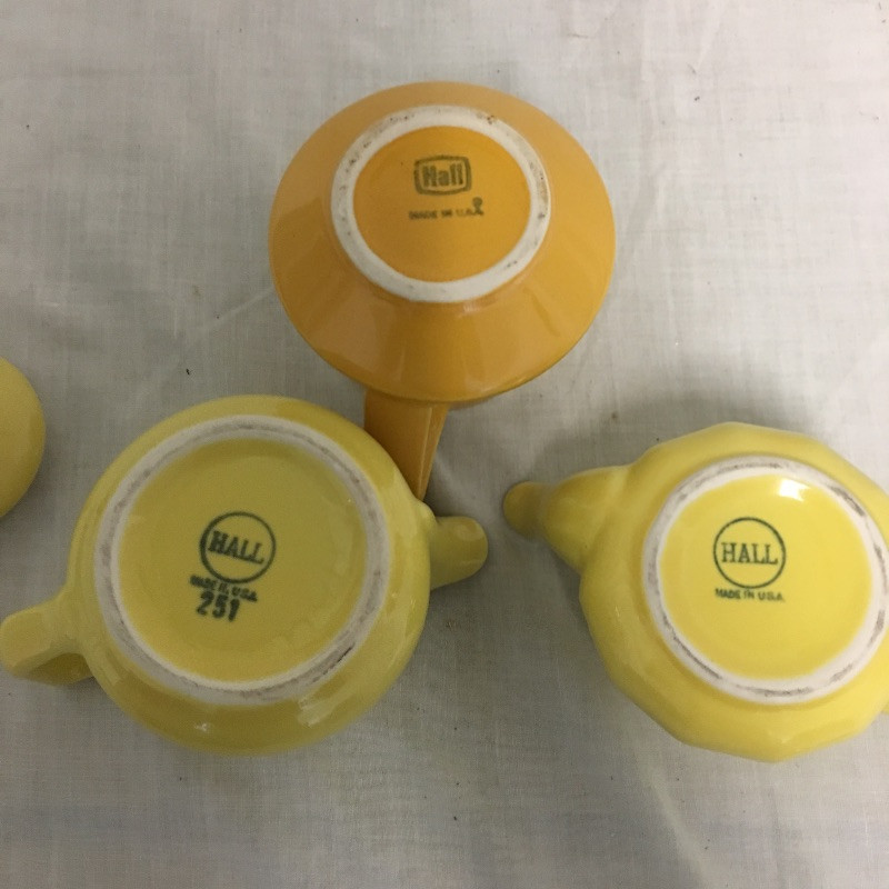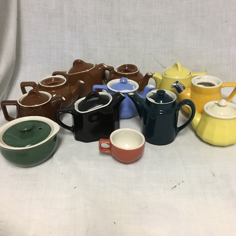 An eclectic mix of retro looking Hall pottery with a few other pieces in this nice collection of colorful tea pots and more, see images. Great lot for all you tea drinkers. Brown bowl with lid measures 7.5” D x 3” tall.