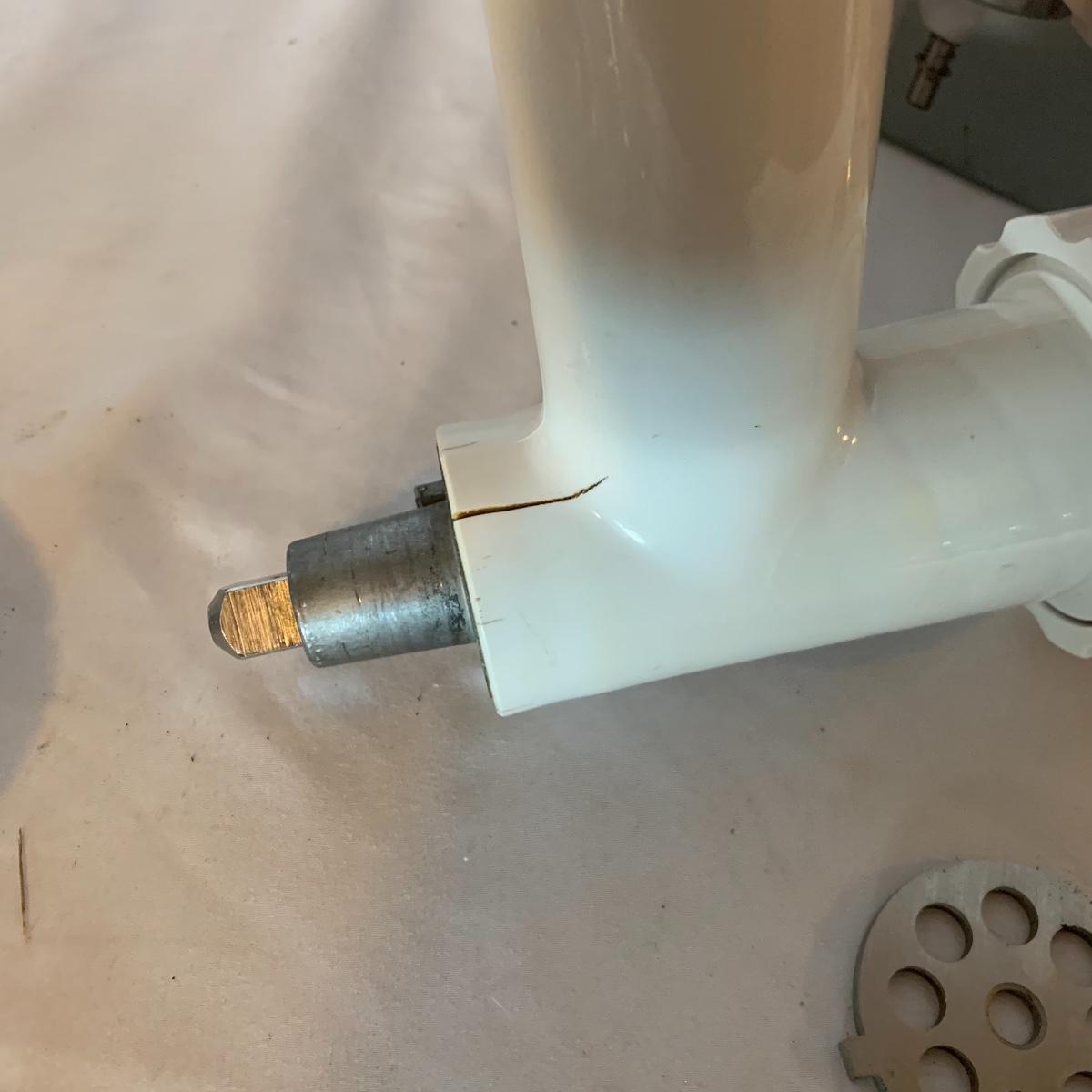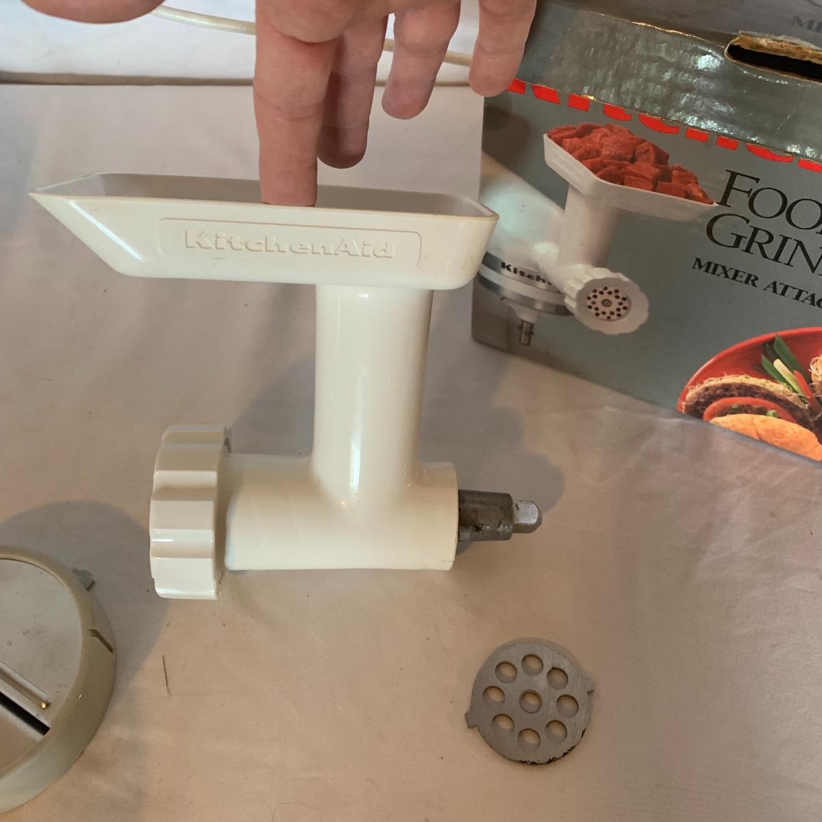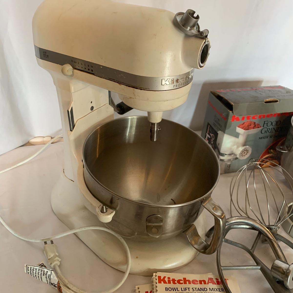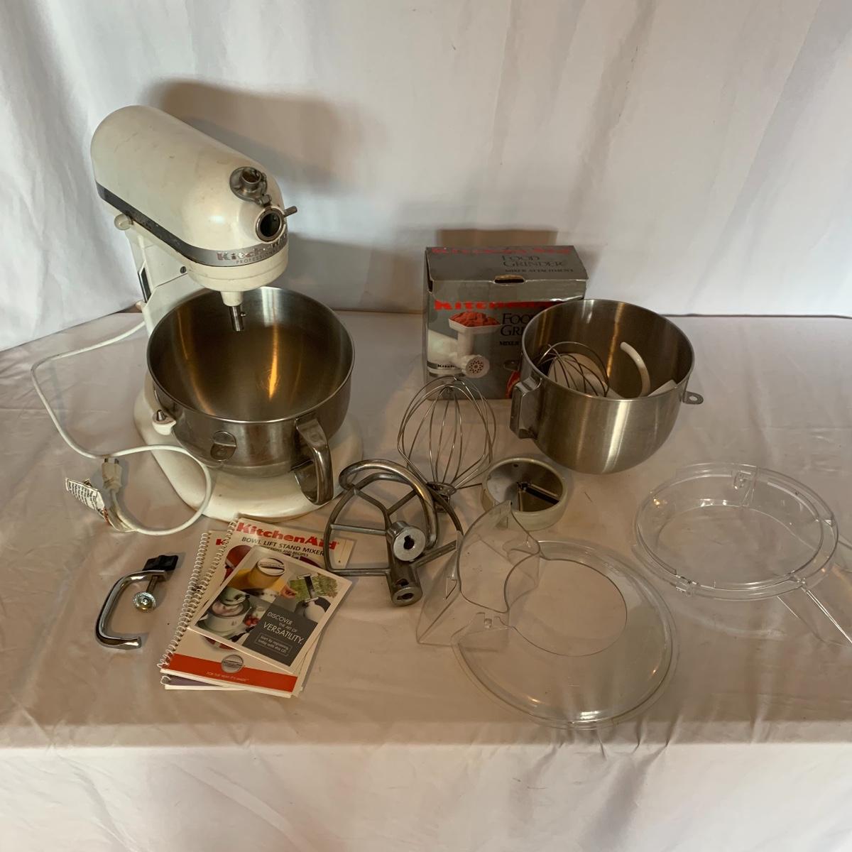 This white Kitchen Aid mixer is a gem with two bowls, lots of attachments, including bowl guard and meat grinder. Meat grinder has a split on the plastic but doesn’t seem to be a hinderance for use. Machine powered on when tested. Local pick up only.