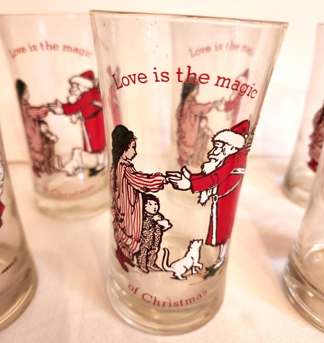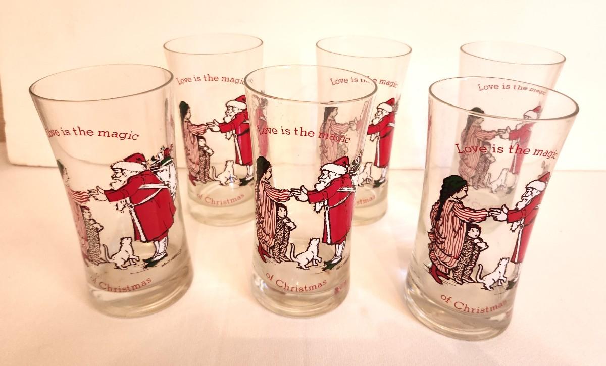 Lot of 6 matching Hollie Hobbie Drinking Glasses - "Love is the Magic of Christmas" - undated 1970's. Each 6" tall.