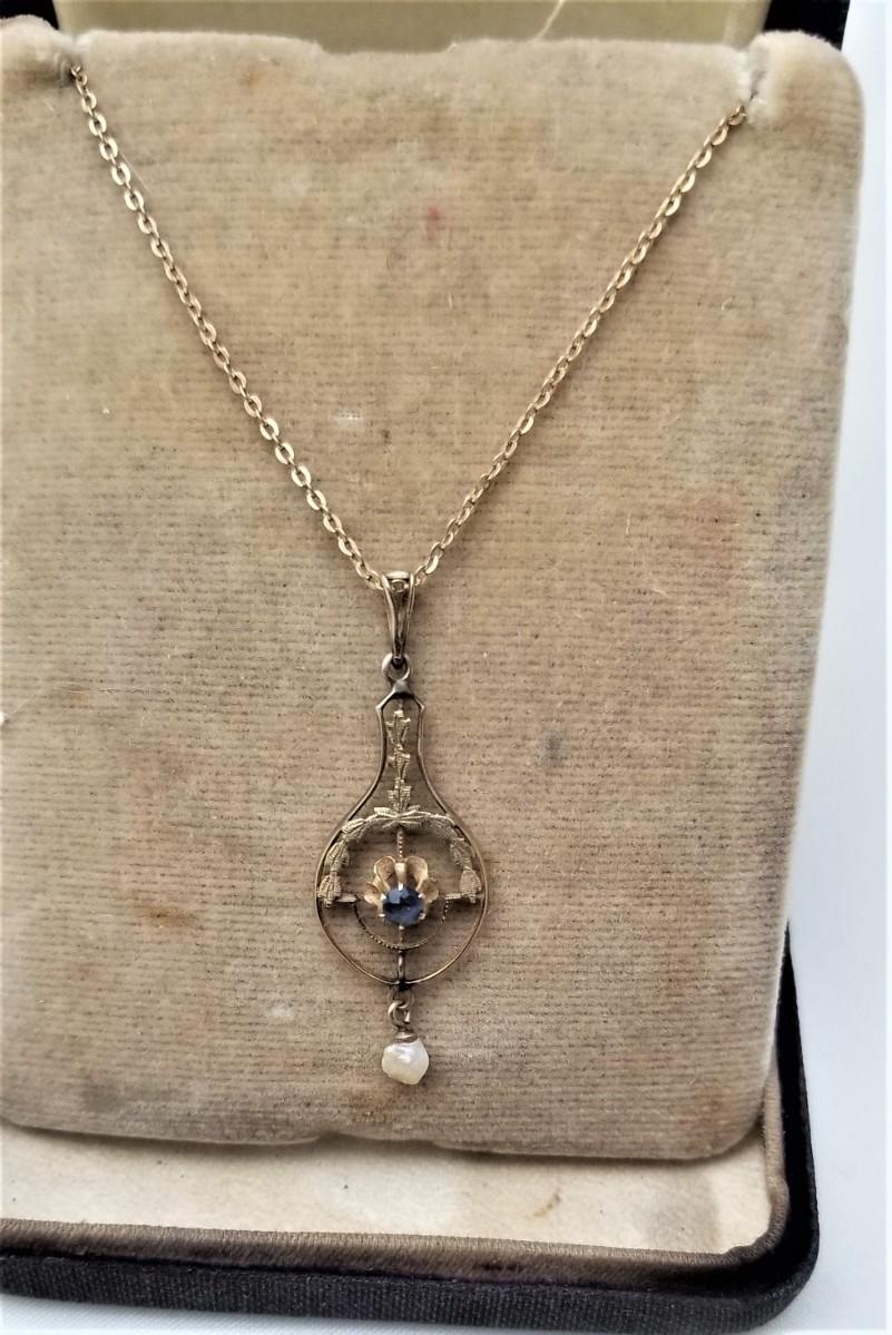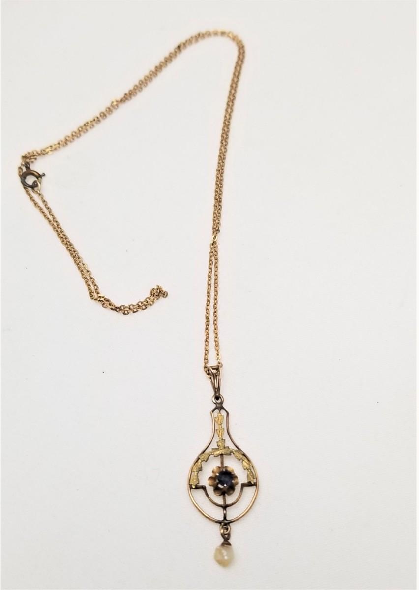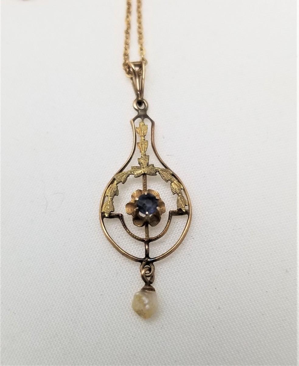 Beautiful little lavaliere-style necklace - think Downton Abbey, ca. 1910. Chain and pendant are marked 10kt gold. A small blue stone is set in the center, and a natural seed pearl hangs below. So sweet...so feminine. Chain is 12" long, pendant is just over 1 inch long. A vintage jewelry box will also be included.