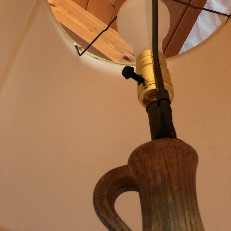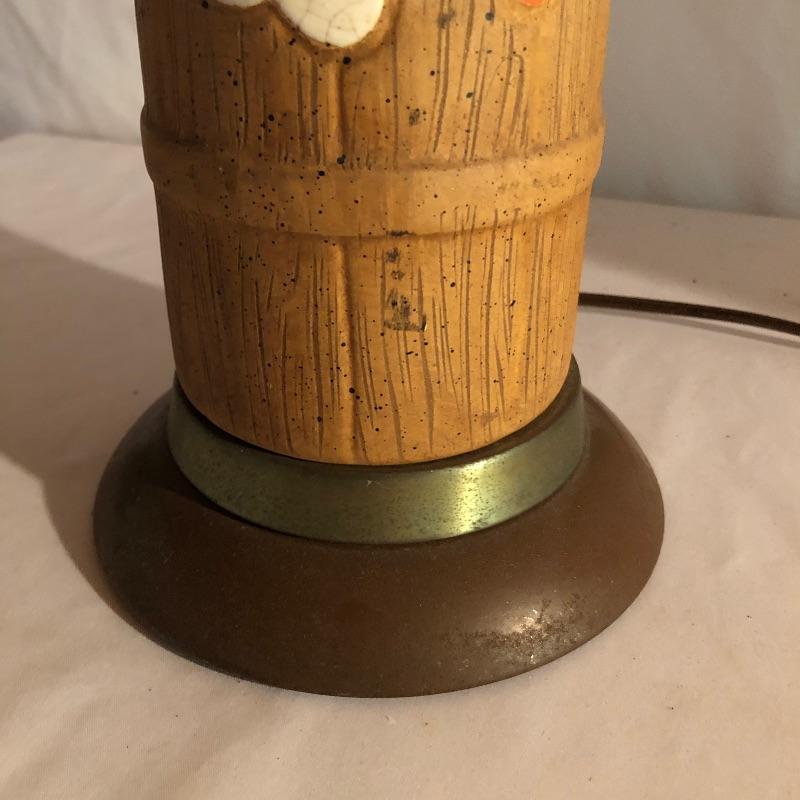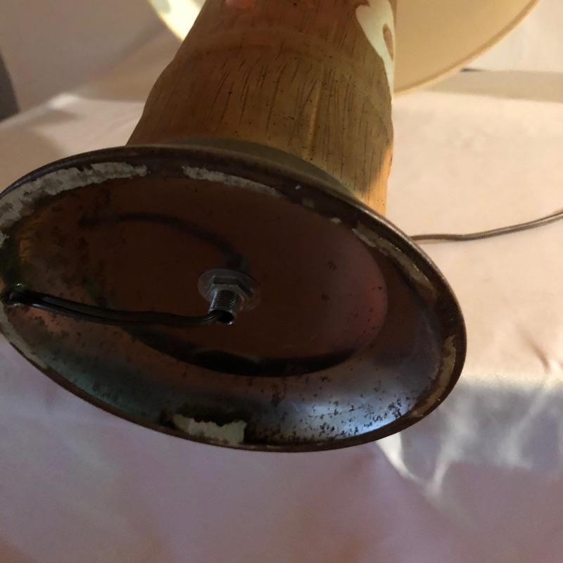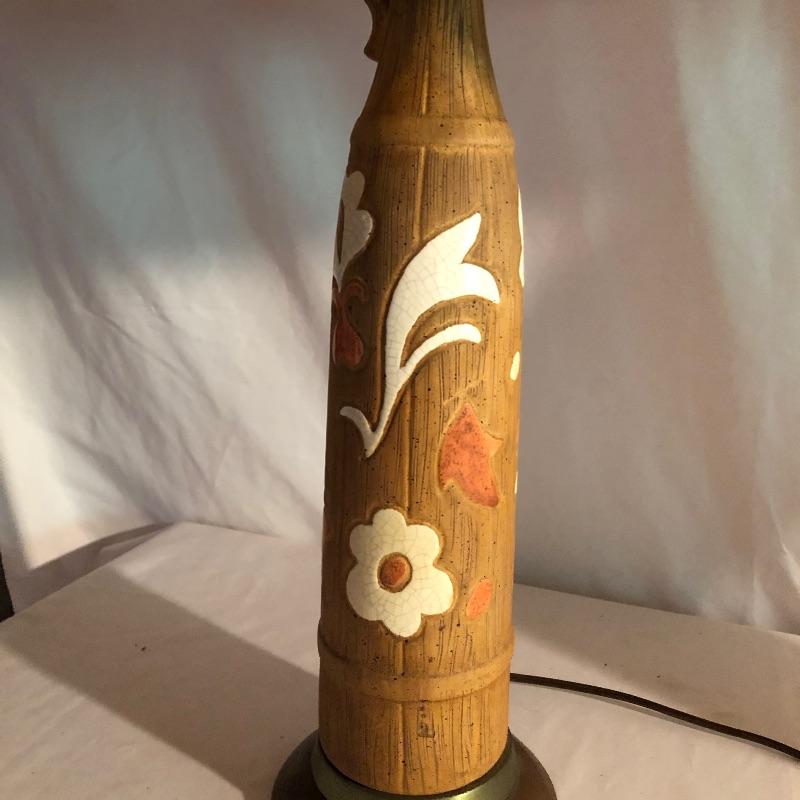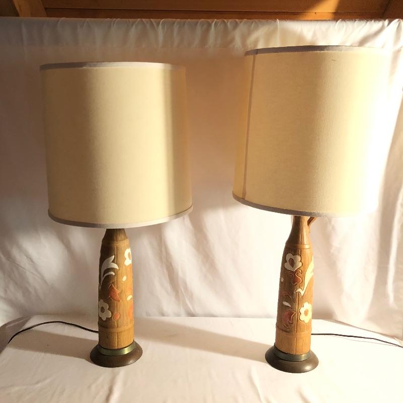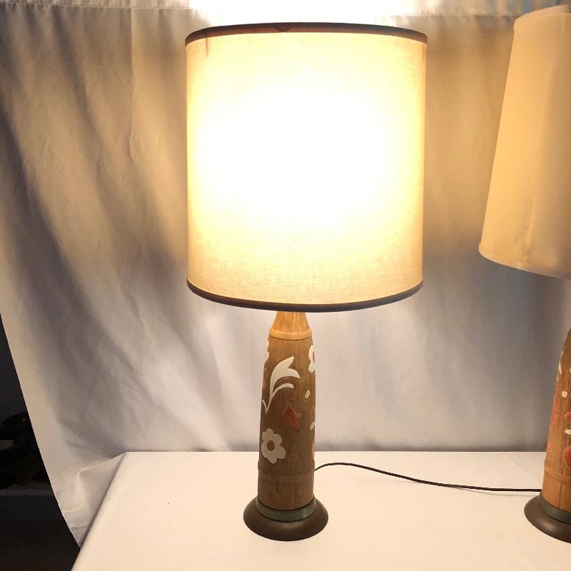 These two stylish lamps are ceramic that give the appearance they are wood. They have a someways retro design on them. One of the lamps did not work when tested; it appears to be a wiring problem that may be fixable. They also have matching cream colored vintage shades.