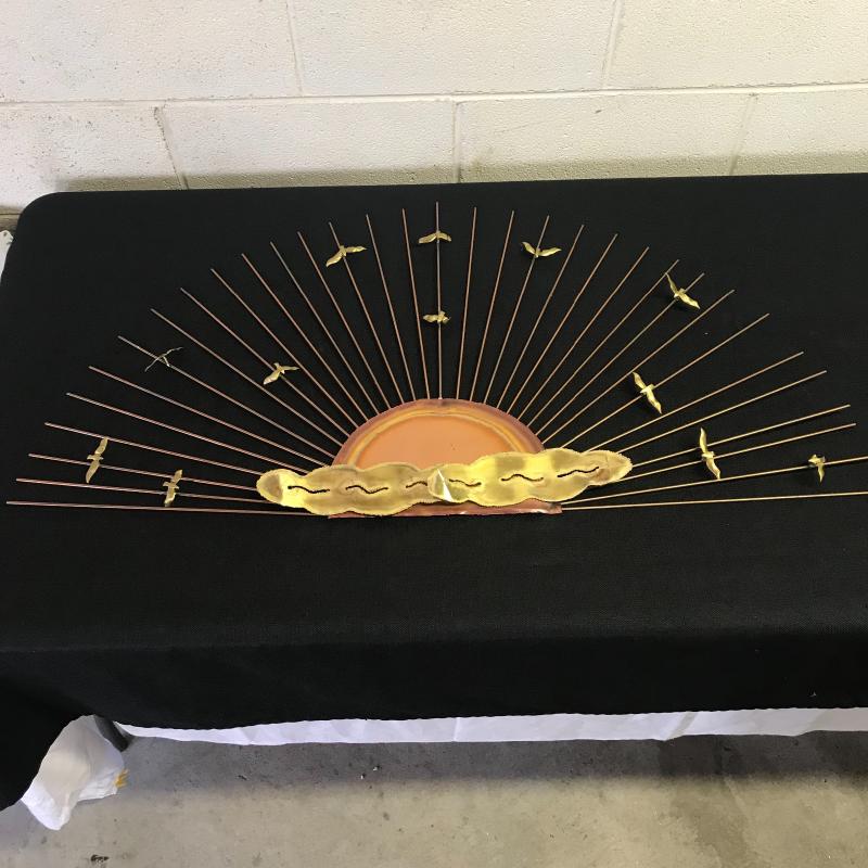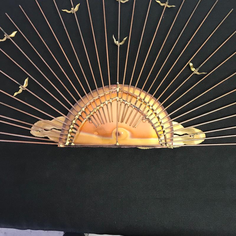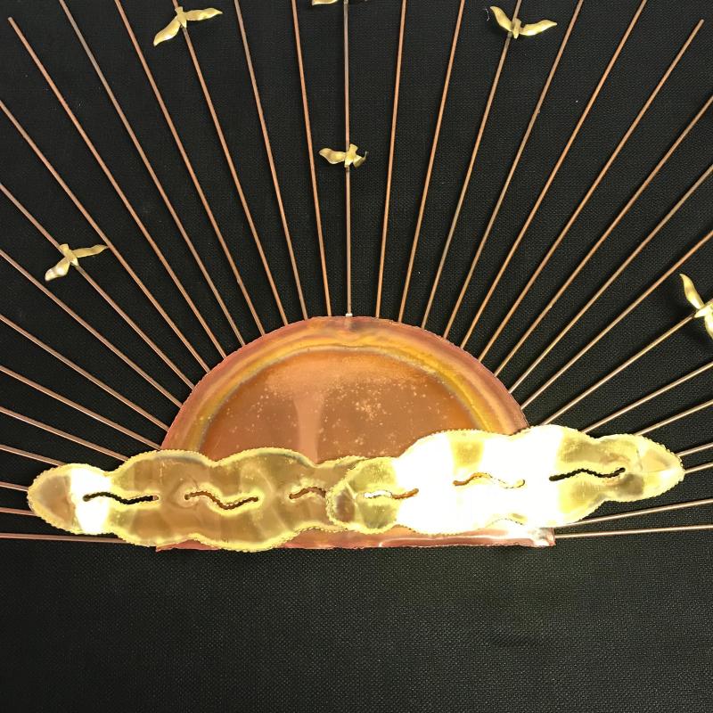 Wall hanging metal art piece of setting sun, birds and clouds made from copper, brass and more. Piece measures 39.5” x20” x1”. Lot is available for local pick up in Asheville, NC only.