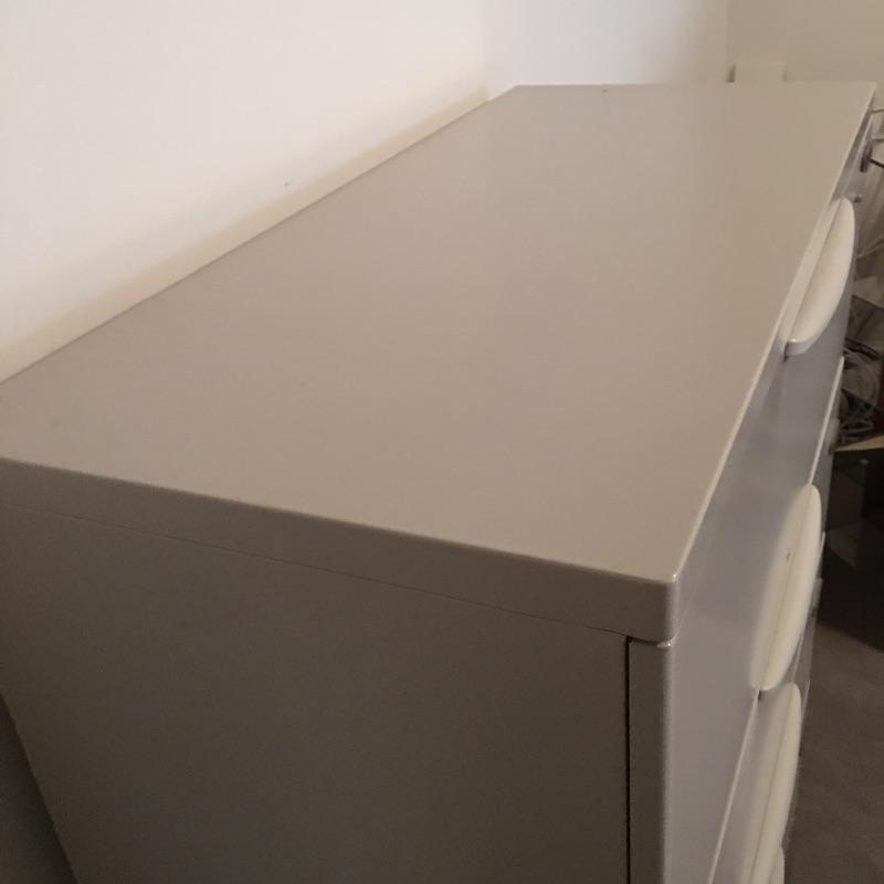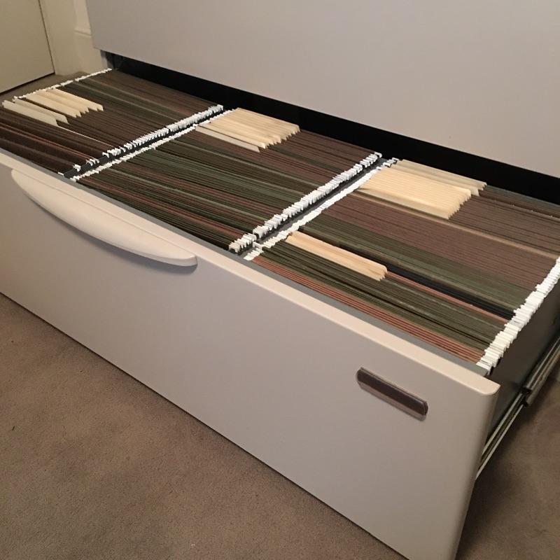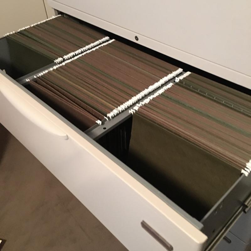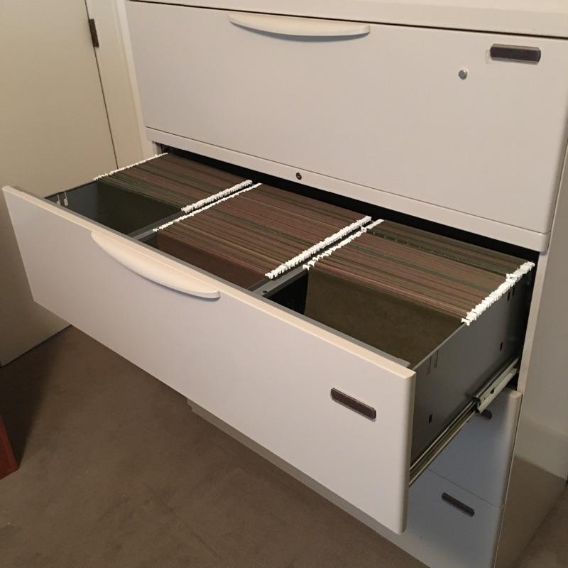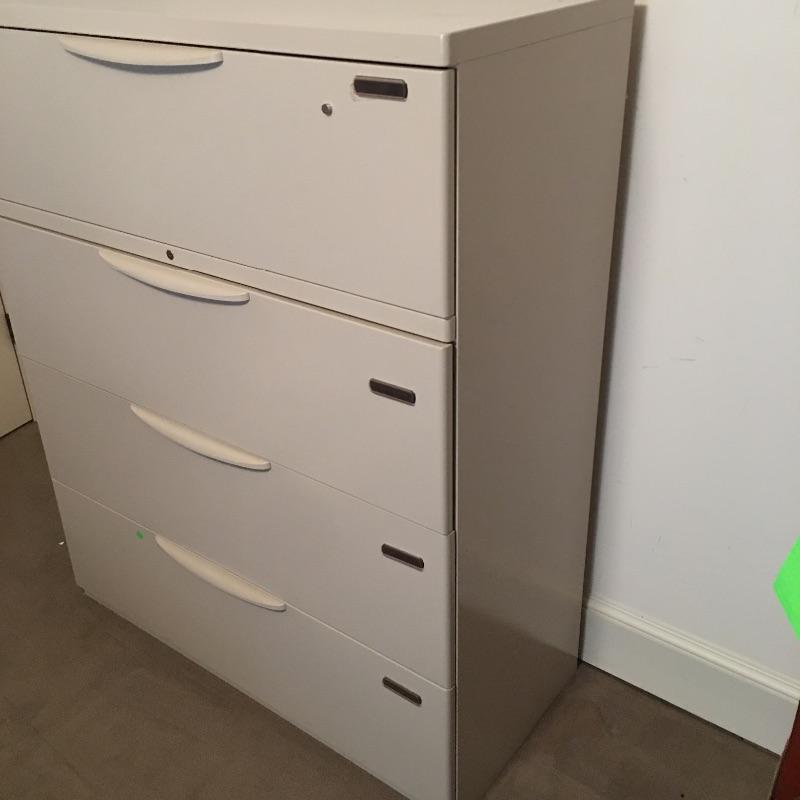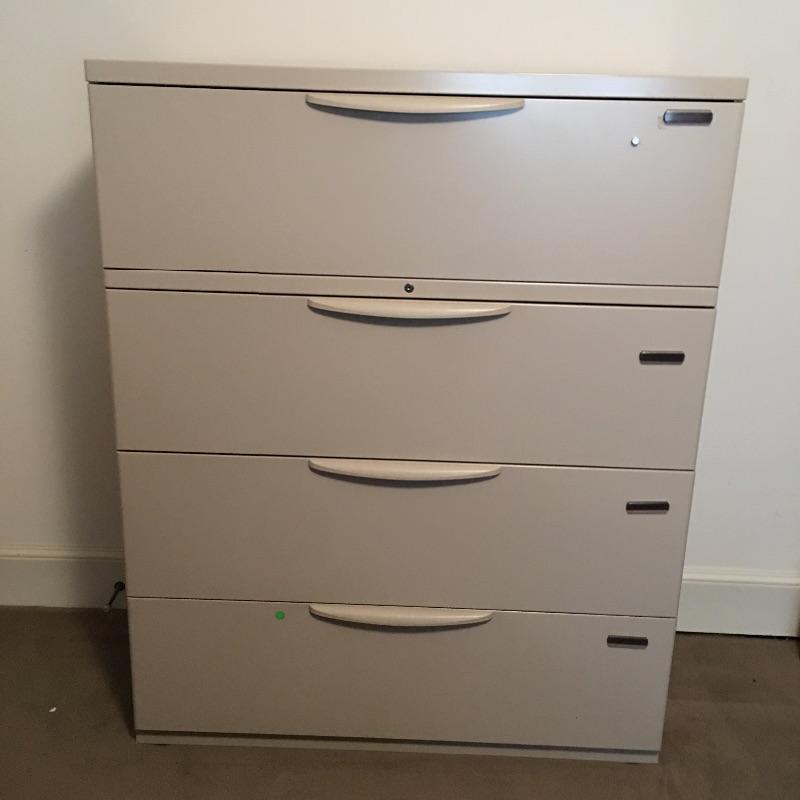 Metal file cabinet. Lot include one four drawer filing cabinet with hanging folders and a safety lock so you can only open one drawer at a time. You should be able to fit all your file in this nice wide cabinet. . No key found to lock entire unit. Cabinet measures 19” x 42” x 51”.