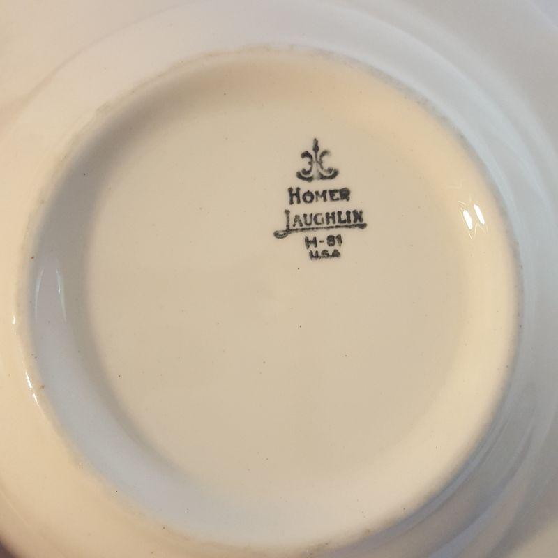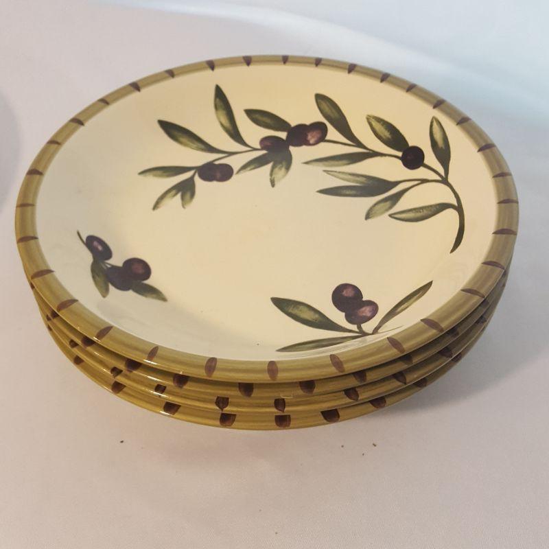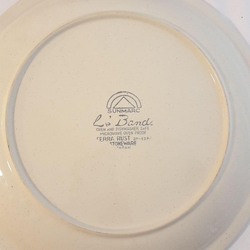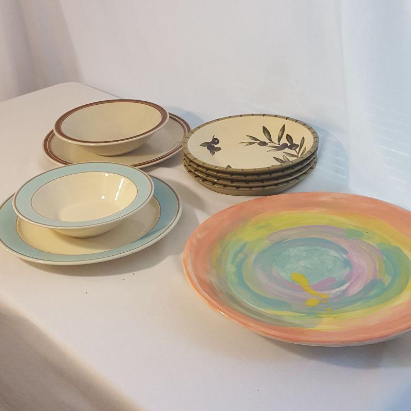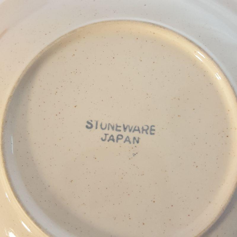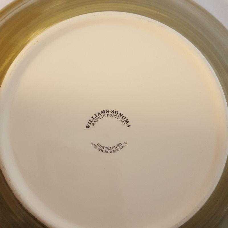We have a lovely assortment of 9 pieces in this lot that includes 4 matching bowls, 2 sets of a matching plate and bowl and one large serving platter that measures 15 inches in diameter. The 4 matching bowls are from William Sonoma, see images for all the markings on these items.