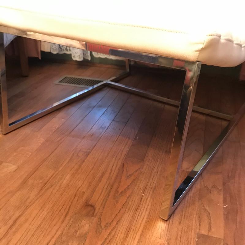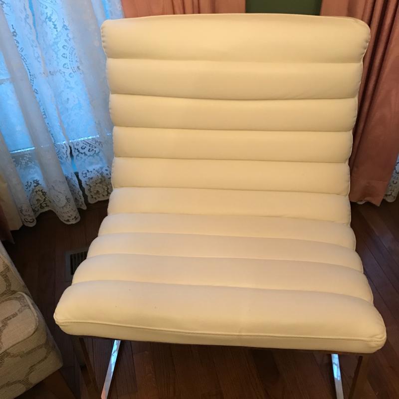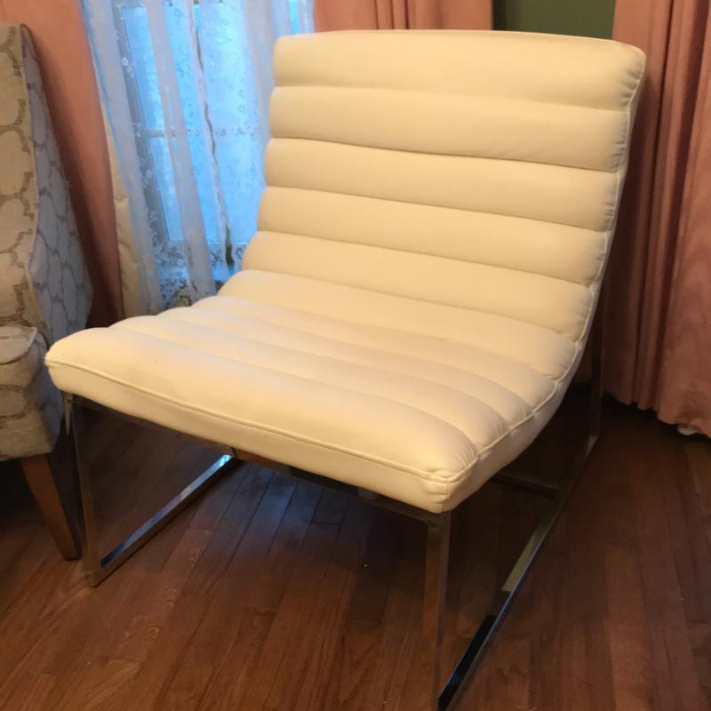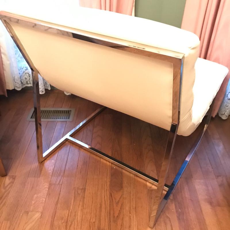Put a little Mod in your decor. This white leather chair with silver metal frame makes a statement. Has some tiny cat scratches on front edge that are hardly noticeable. See photos. 31”l x 27”w x 31”h. No Shipping. Local pick up only in Flat Rock, NC.