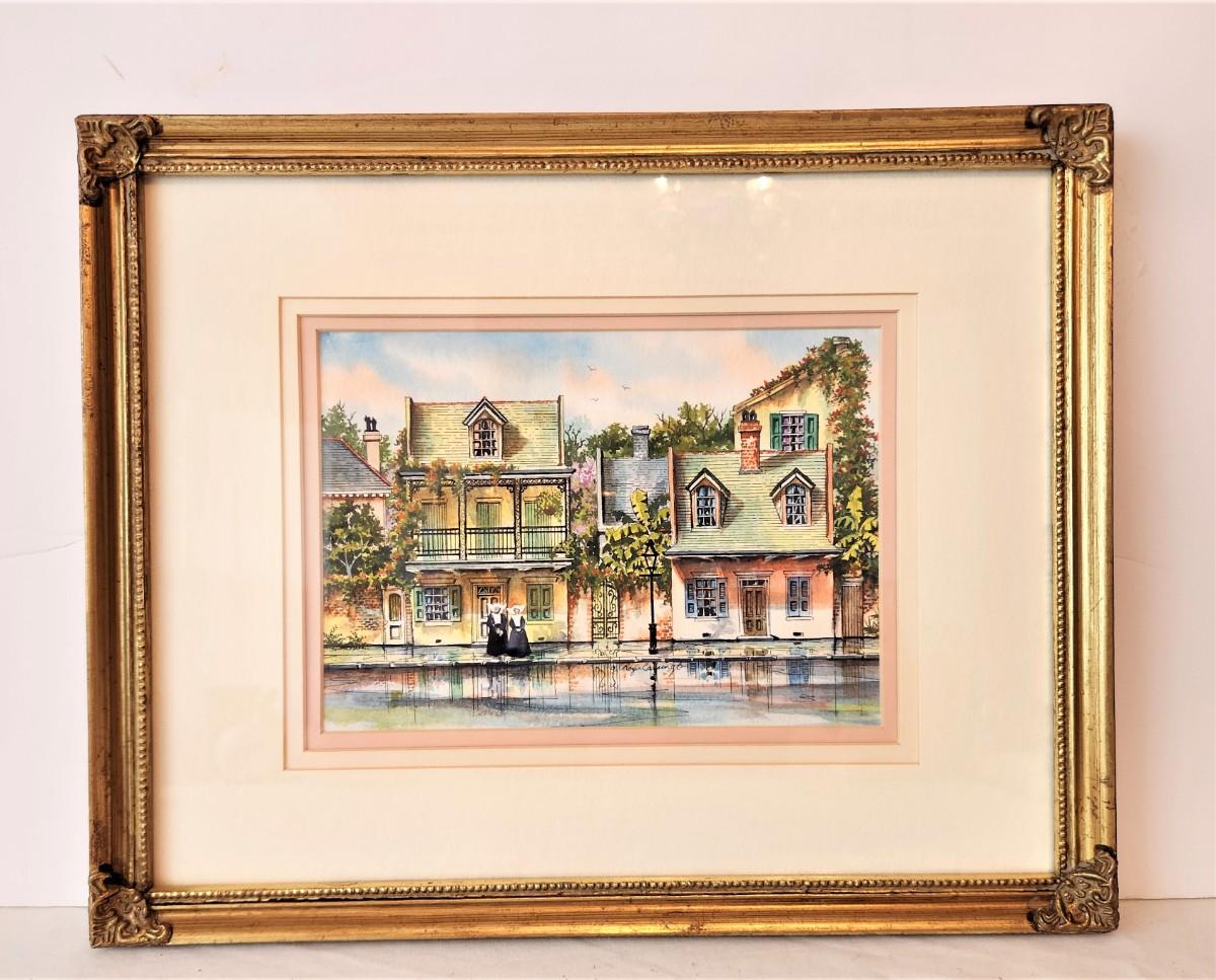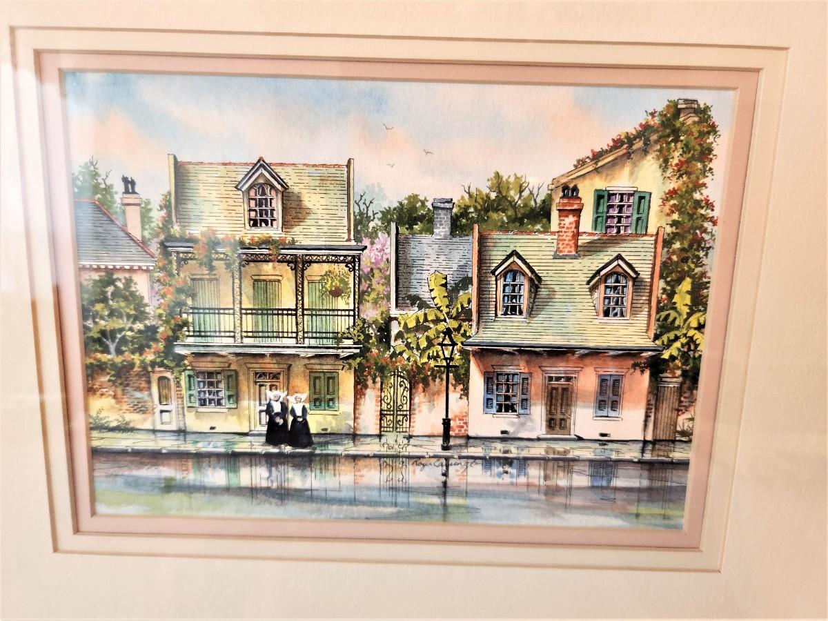 Charming original painting by Listed Artist Roger Carrington of New Orleans (1939-2004). "Sisters of Charity in the French Quarter" - 12" x 15", triple mat.