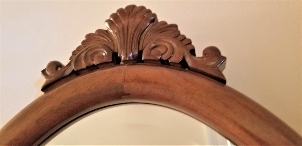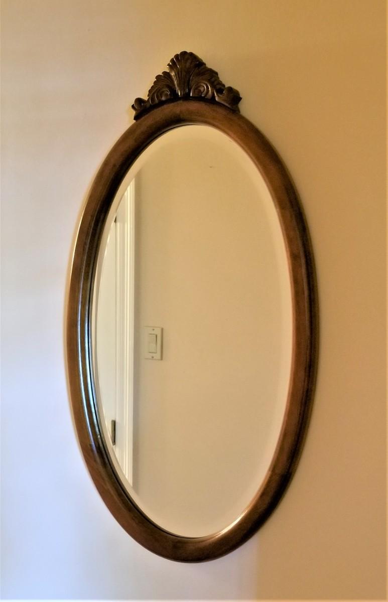 Pretty beveled wall mirror - Oval - by the Bombay Company. Measures 33" tall, 18.5" across. Good Condition.
