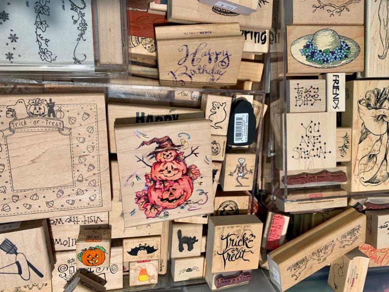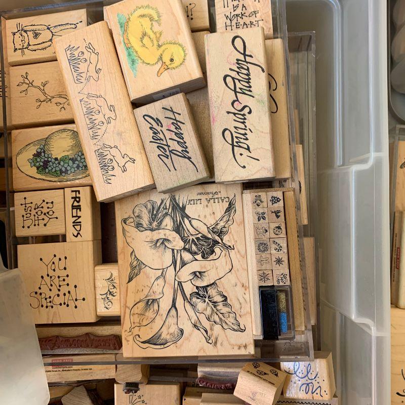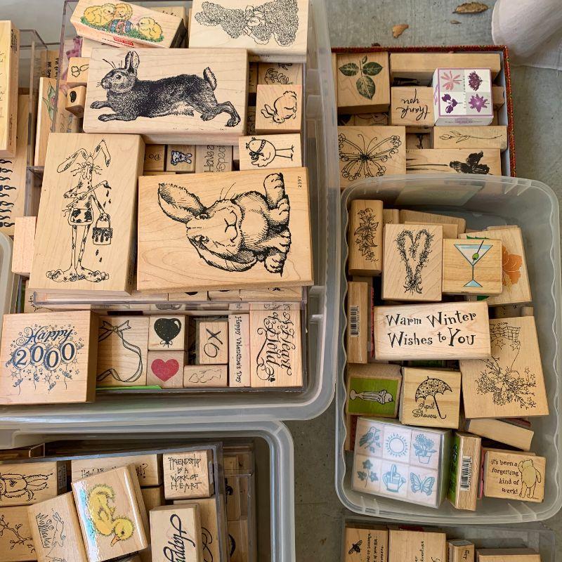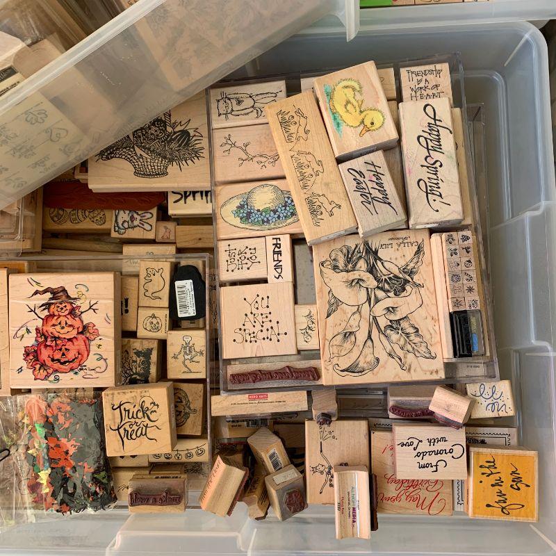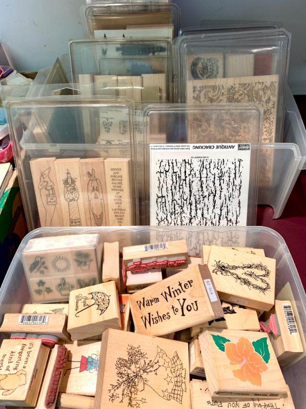 HUGE lot of card/scrapbooking stamps, every holiday & theme you can imagine. Mottos, flowers, insects, trees, plants, animals, fairies, birds, angels, children, women, art, all over prints, sports, and of course holidays!! All sizes, some never opened. Lots of specialty papers for card making. Ribbon, glitter, colors, books, tools, literally tubs full!