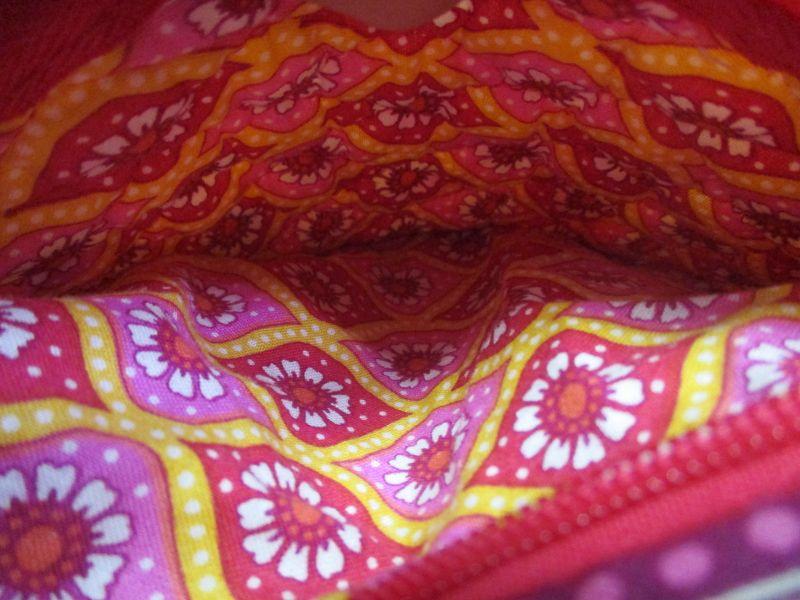 This purse is in excellent condition and has a zippered pocket on the outside and three pockets sewn into the back of the inside. It is 14.5" x 12" flat.