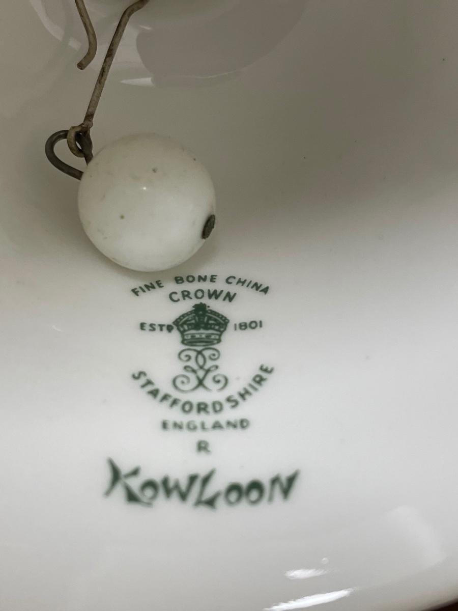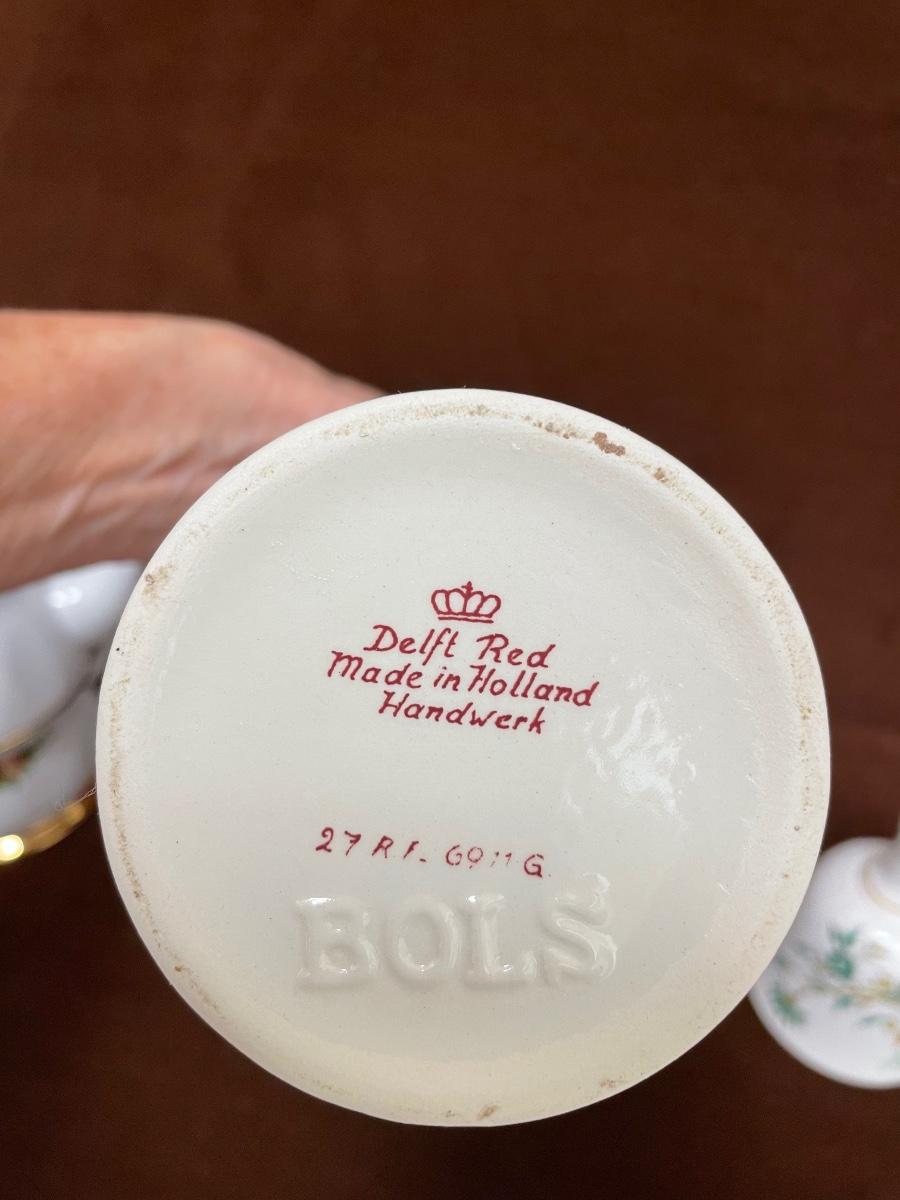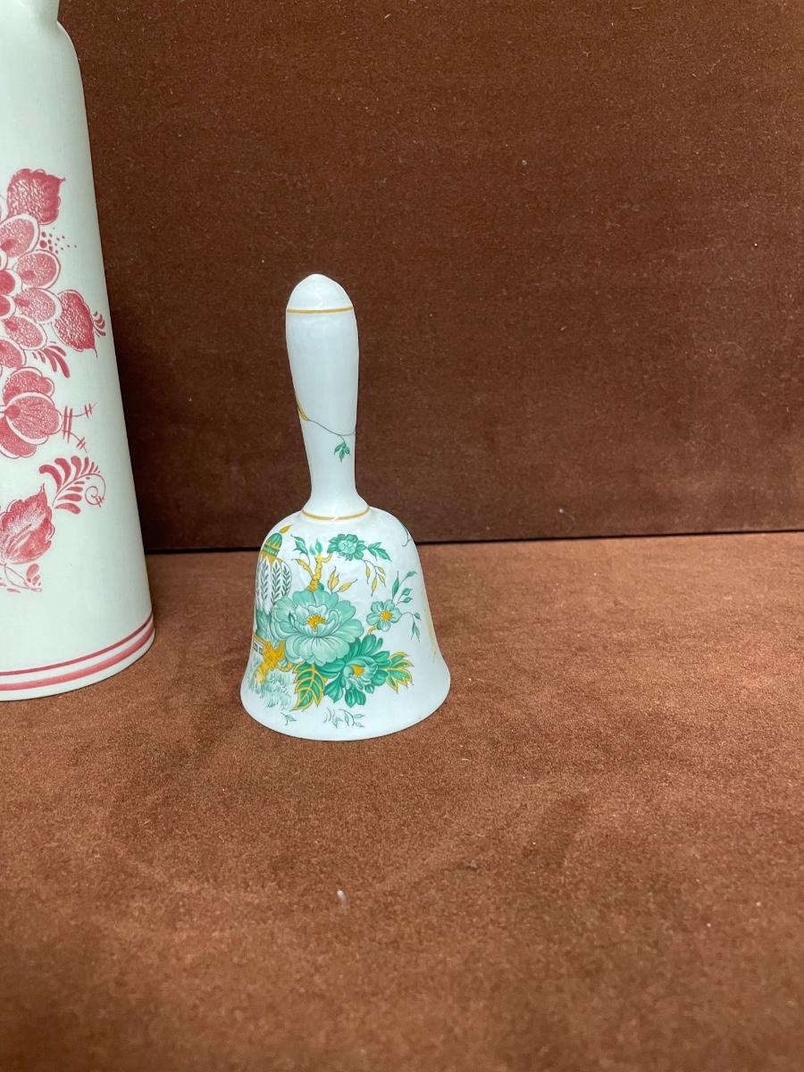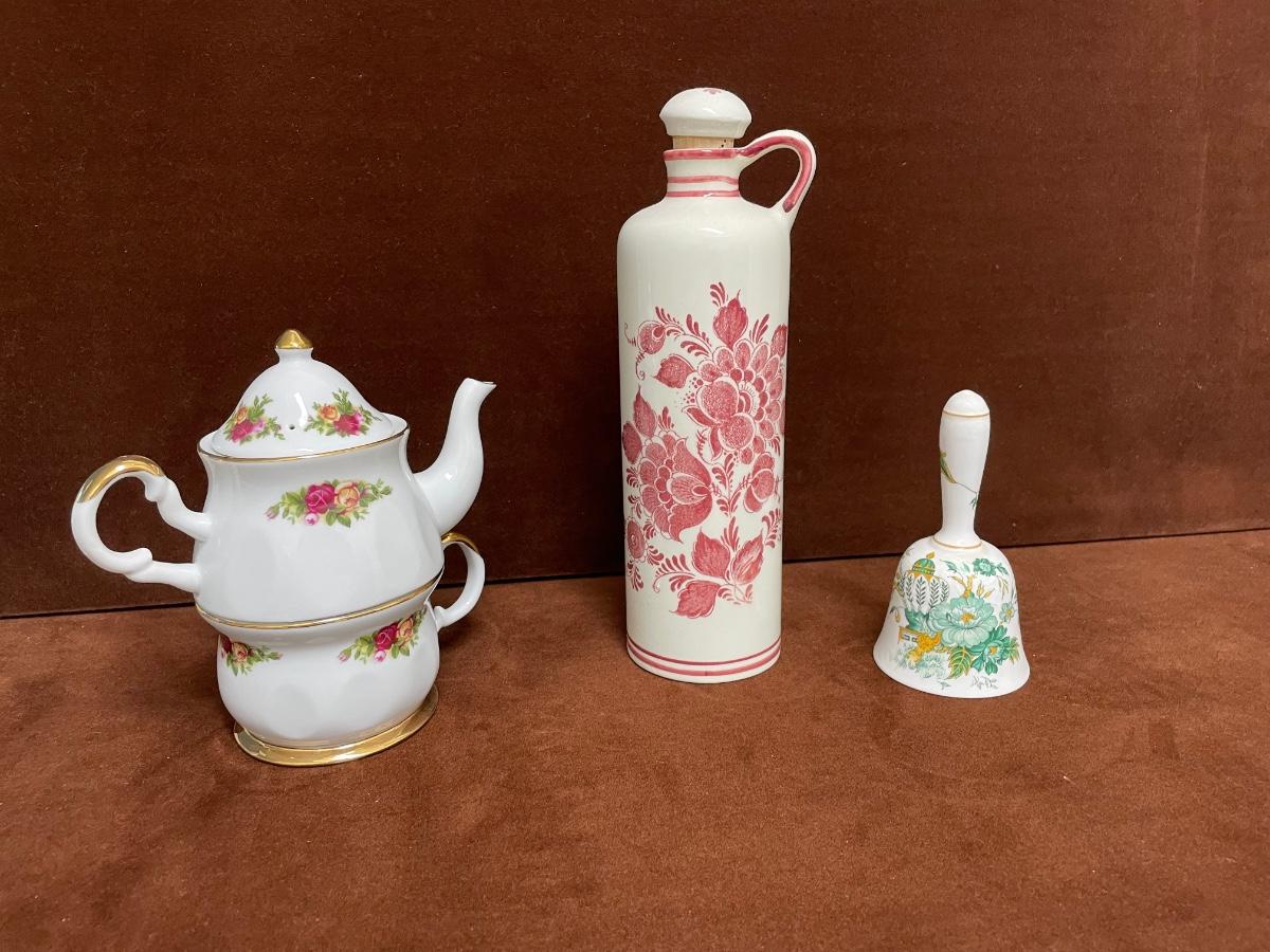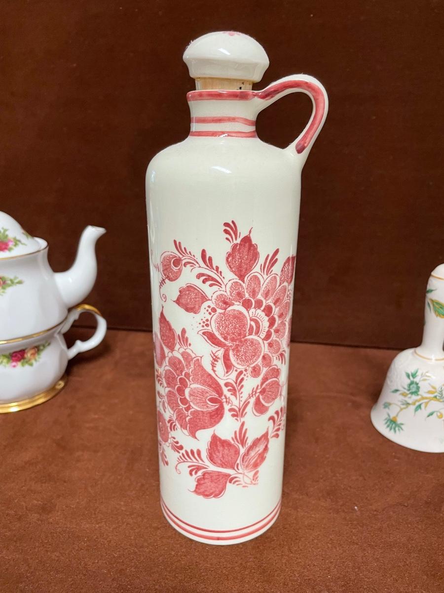 Includes Stafforshire Crown Bell in Kowloon pattern, Teapot/cup combo, Delft Red decanter. all in excellent condition