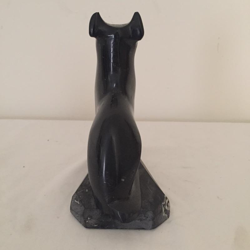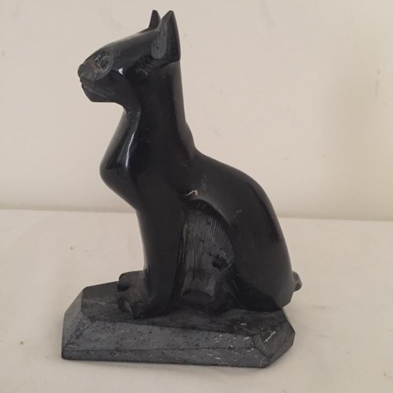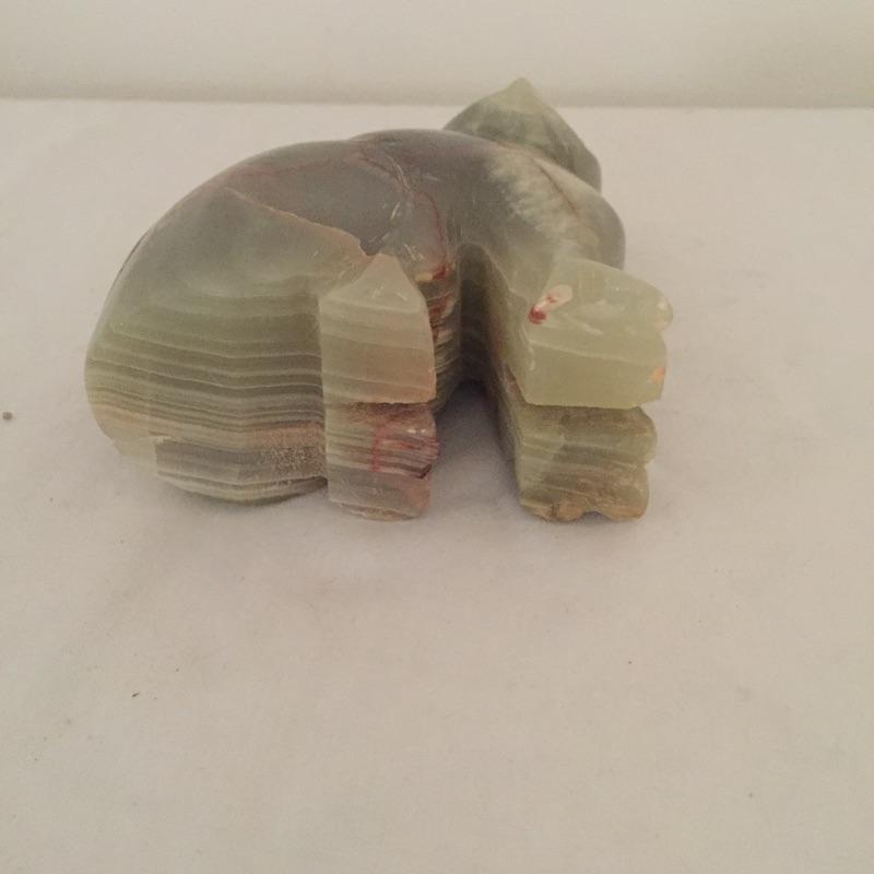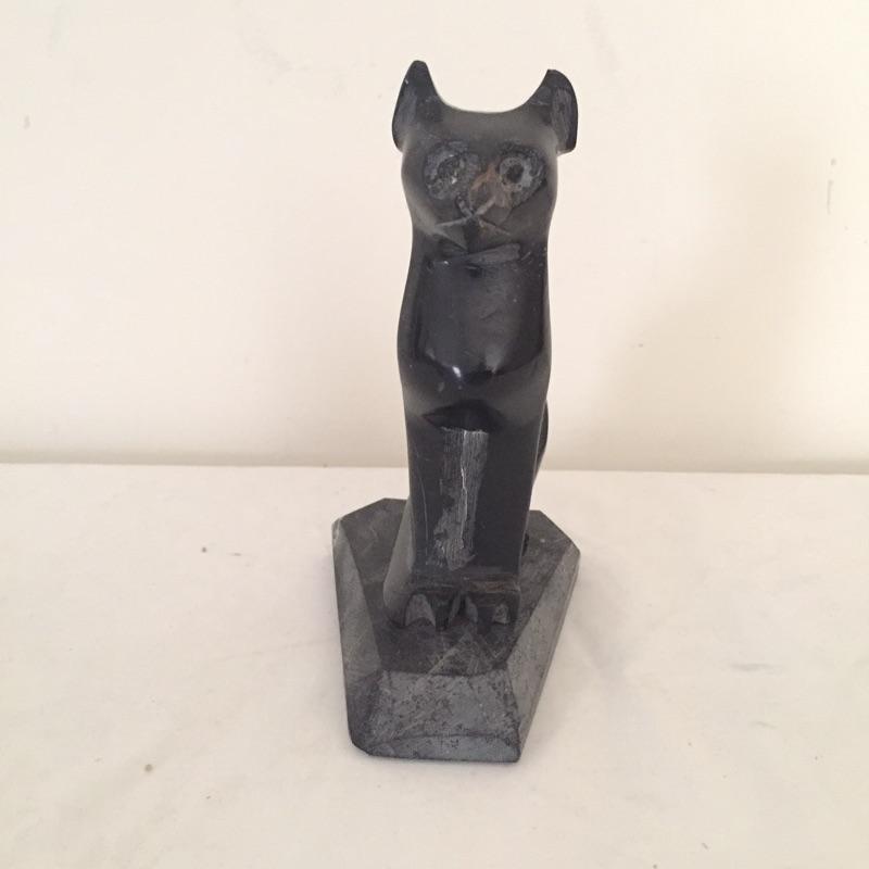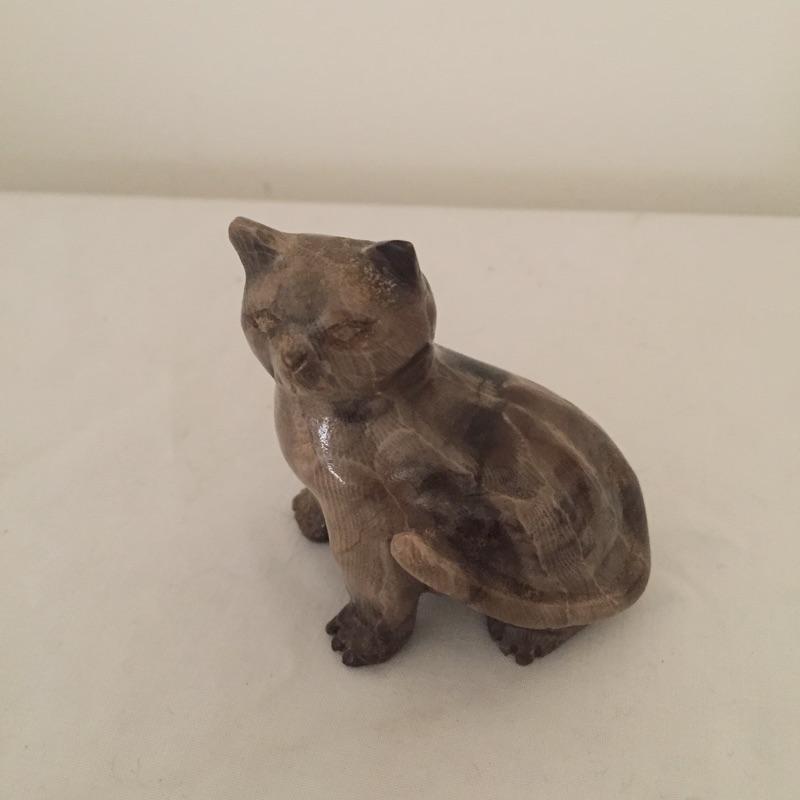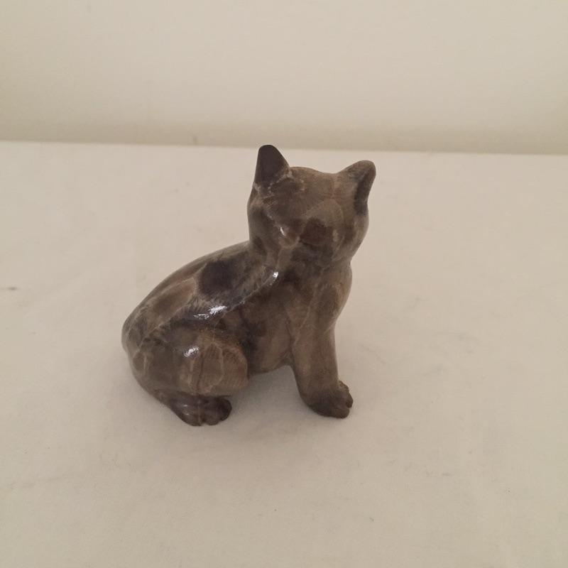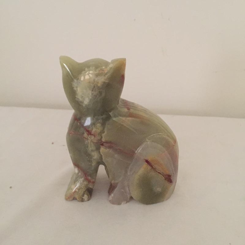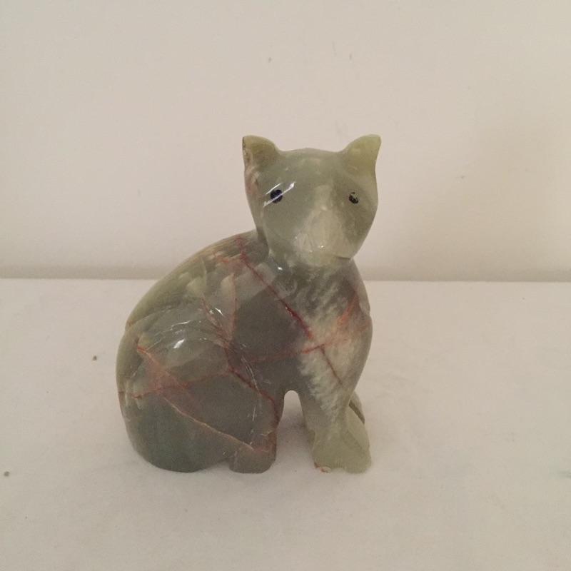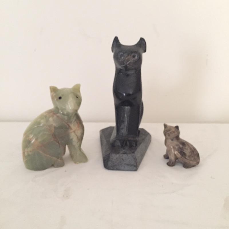 Unique trio of stone cats. Beautiful heavy variations of stone. They appear to be Onyx or Alabaster but we can not verify. Great gift for your cat loving friend , or treat yourself. Largest cat measures 6.5” tall.