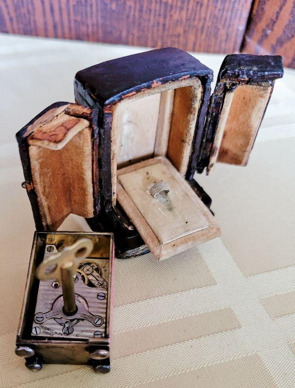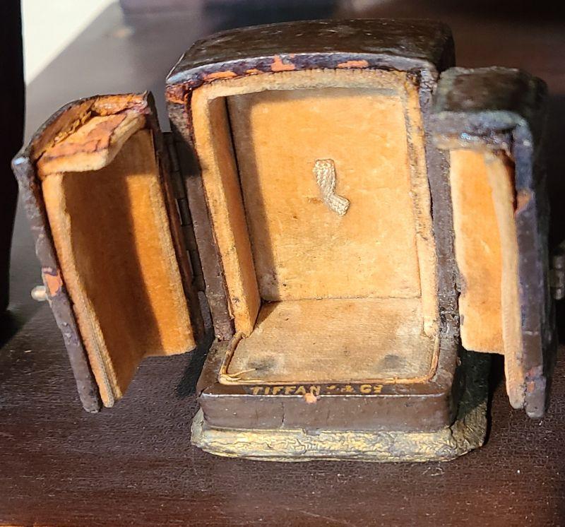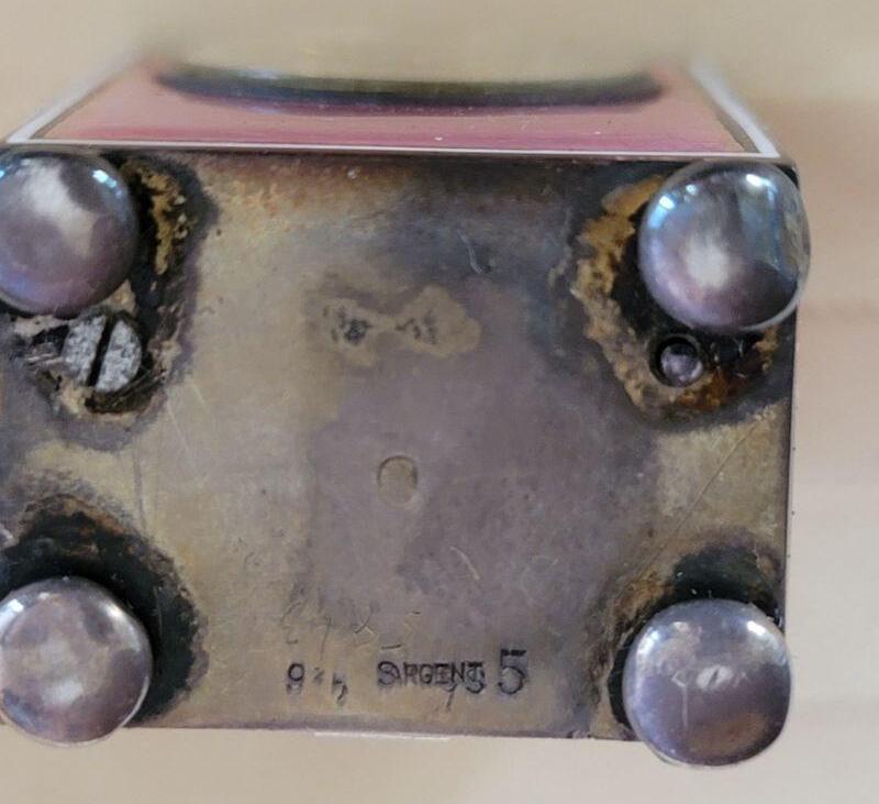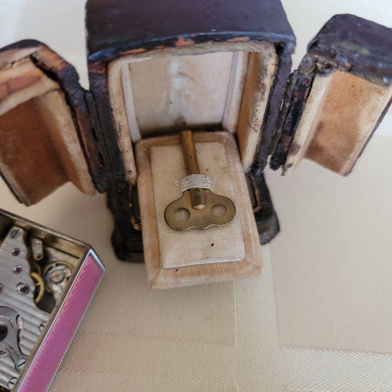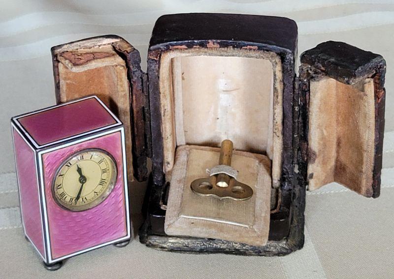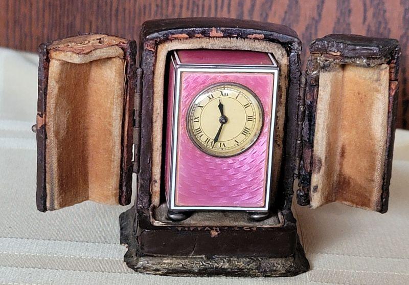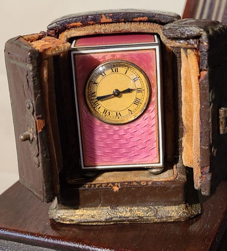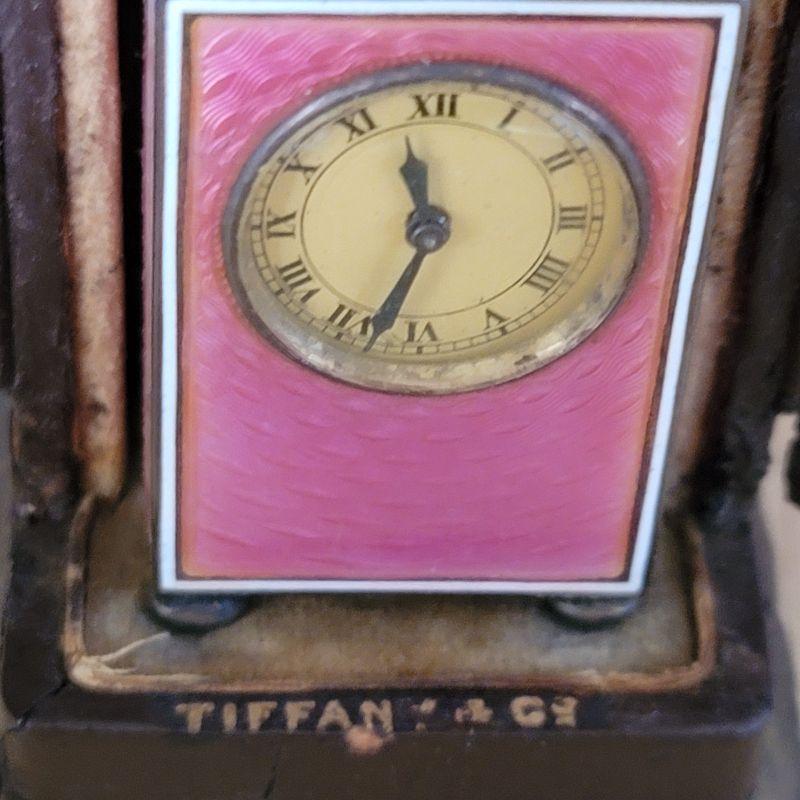 Antique leather Tiffany & Company miniature clock case , as-is. Antique enamel guilloche miniature Sargent #5 miniature clock with original key, set, wound , tested, runs well, kept perfect time for 24 hr test run! The back of clock stays on just fine despite bottom corner is missing a pin holder as shown in picture. Please see all pictures for content of the lot, condition of the lot, and measurements if taken. Pictures are the best representation of the items listed and items are untested unless indicated in description. Thank you for looking and have fun bidding!