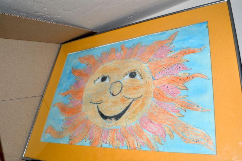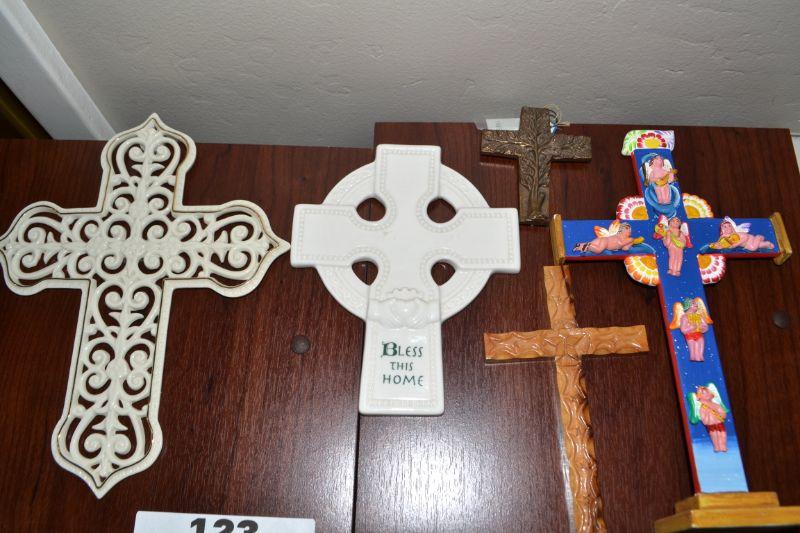 VARIETY OF CROSSES AND FRAMED SUN CARTOON DRAWING