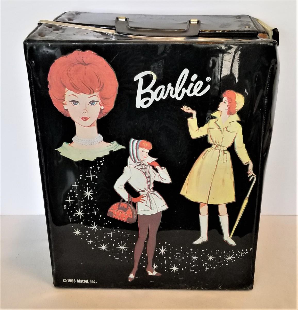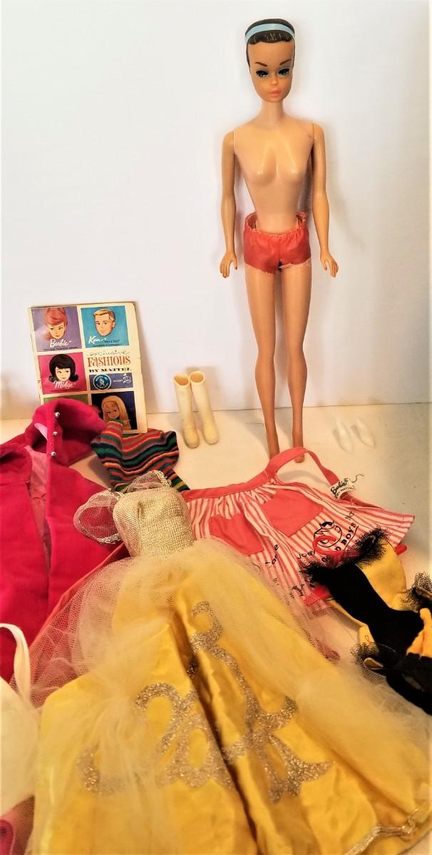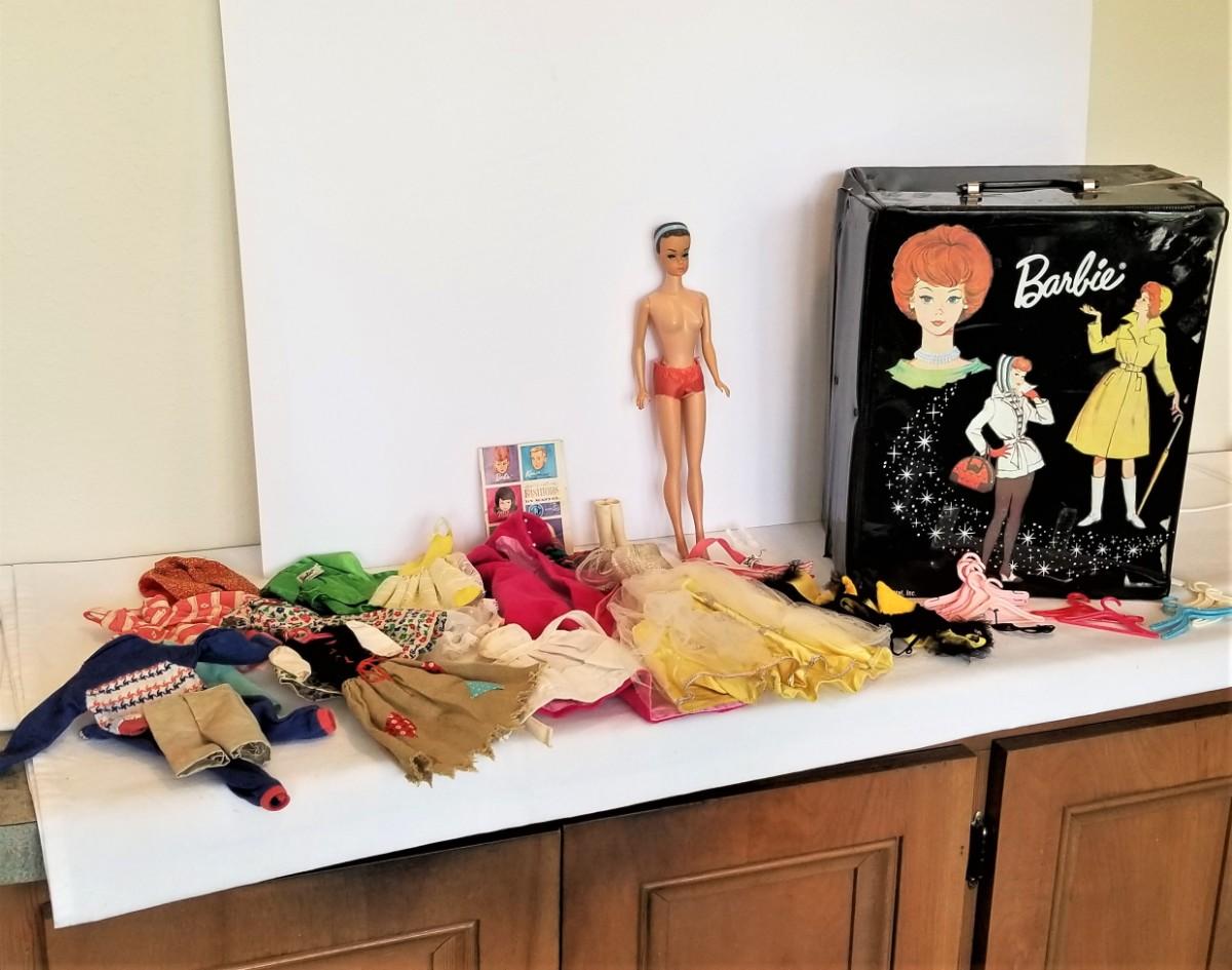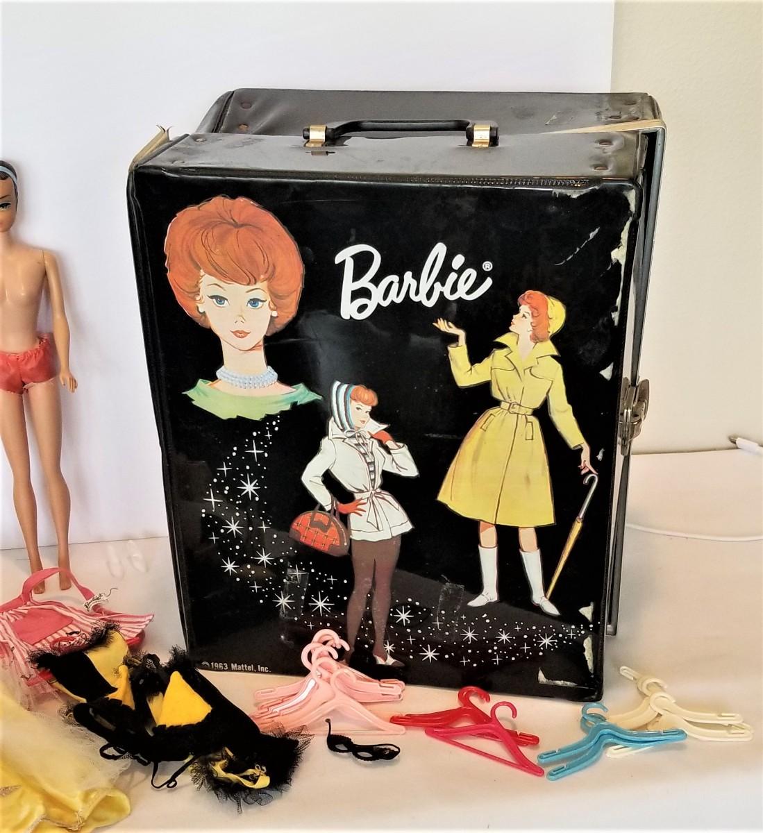 Vintage 1963 Barbie doll case, vintage Barbie (straight leg, the kind that came with wigs), and lots of official Barbie clothes. Clothes all marked Barbie, Skipper, or Ken. All have been played with - what you see is what you get. Good ebay lot here.