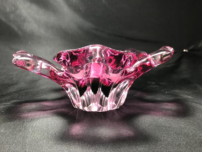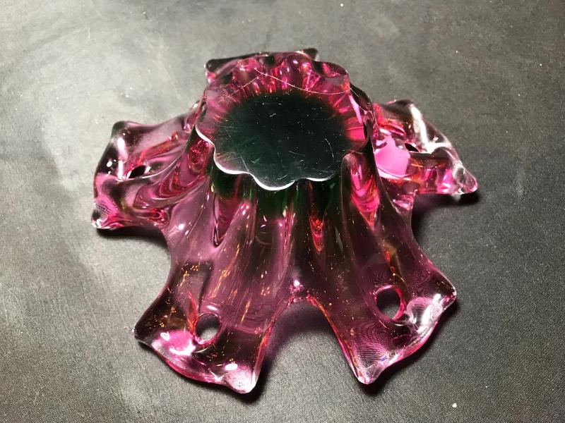 Very nice vintage hand blown pink and green flower form Murano glass dish or bowl. 8" D x 3" H
