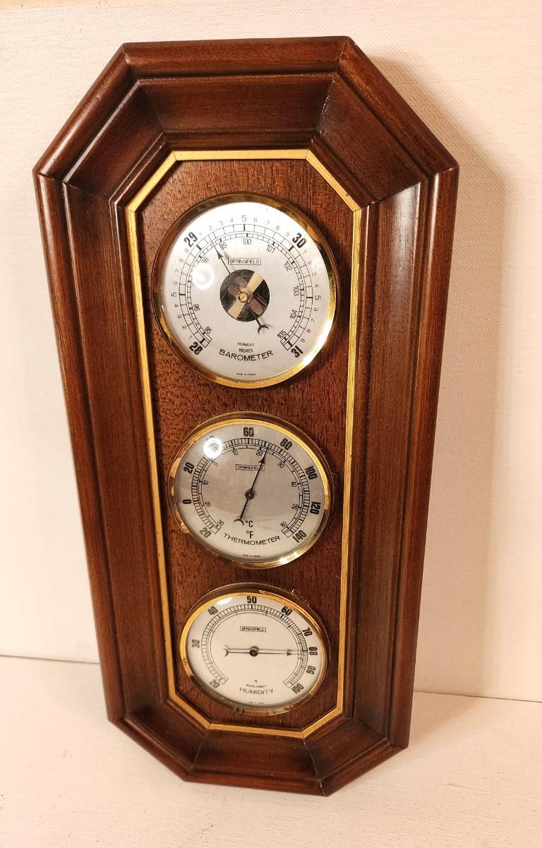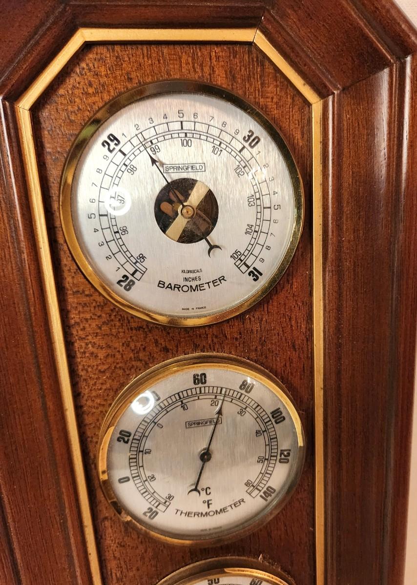 Good quality vintage weather station (made France) - Barometer, Thermometer, Humidity. 18" tall, 8" wide, made 1960's -70's.