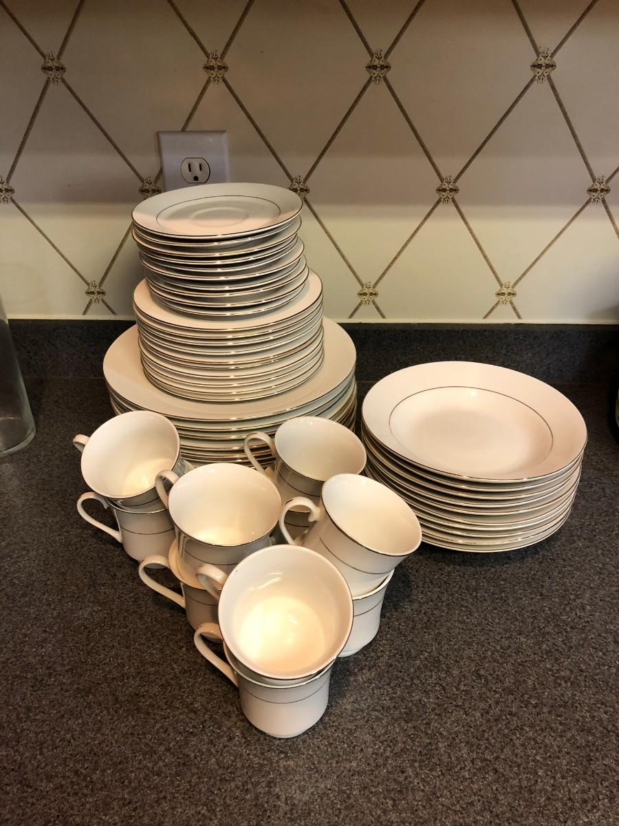 There are (10) each of dinner plates, cups, saucers, bowls, and salad plates.